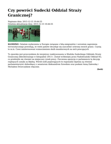 Czy powróci Sudecki Oddzial Straży Granicznej? Napisano dnia: 2015-12-15 10:44:55 Ostatnia aktualizacja dnia: 2015-12-15 10:44:55 KŁODZKO. Ostatnie wydarzenia w Europie związane z falą emigrantów i wzrostem zagrożenia terrorystycznego powodują, że wiele państw decyduje się uszczelnić ochronę swoich granic. Czynią to m.in. Czesi zainteresowani wzmocnieniem służb mundurowych na nich pracujących. To zjawisko jest przyczynkiem do inicjatywy reaktywowania w Kłodzku Sudeckiego Oddziału Straży Granicznej zlikwidowanego w listopadzie 2013 r. Został wchłonięty przez Nadodrzański Oddział SG, co przełożyło się również na miejscowy rynek pracy. Ówczesna opozycja w parlamencie tę decyzję rządzących uznała za błędną. Wśród osób popierających te regionalne dążenia są również parlamentarzyści dolnośląscy z senatorem Aleksandrem Szwedem oraz posłami Anną Zalewską i Michałem Dworczykiem włącznie. (bwb)