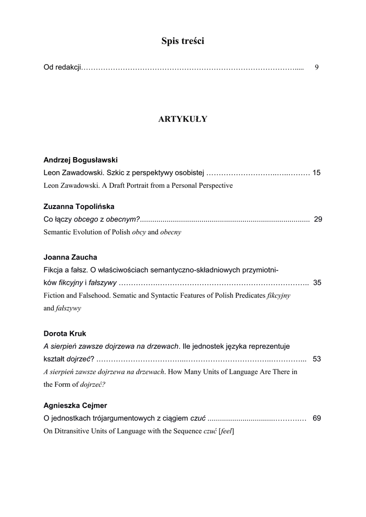 Spis treści Od redakcji……………………………………………………………………………..... 9 ARTYKUŁY Andrzej Bogusławski Leon Zawadowski. Szkic z perspektywy osobistej ………………………..…..……… 15 Leon Zawadowski. A Draft Portrait from a Personal Perspective Zuzanna Topolińska Co łączy obcego z obecnym?................................................................................... 29 Semantic Evolution of Polish obcy and obecny Joanna Zaucha Fikcja a fałsz. O właściwościach semantyczno-składniowych przymiotników fikcyjny i fałszywy …………….…………………………………………………….. 35 Fiction and Falsehood. Sematic and Syntactic Features of Polish Predicates fikcyjny and fałszywy Dorota Kruk A sierpień zawsze dojrzewa na drzewach. Ile jednostek języka reprezentuje kształt dojrzeć? .……………………………...……………………………..…………... 53 A sierpień zawsze dojrzewa na drzewach. How Many Units of Language Are There in the Form of dojrzeć? Agnieszka Cejmer O jednostkach trójargumentowych z ciągiem czuć .................................……….… 69 On Ditransitive Units of Language with the Sequence czuć [feel] Natalia Żochowska Mimo woli i mimowolnie jako wykładniki relacji umysł – ciało ……....….…….......… 87 Mimo woli and mimowolnie as the exponents of relation mind – body Anna Bulińska Jednostki języka fundowane na kształcie góra ………………………………………. 99 Units of Language Based on the Shape góra Simona Kranjc, Andreja Žele Borrowed Lexicon and Neologisms between Standard Language and Sociolects (the Case of Slovenian) ………………………………………………………………. 113 Prevzeta leksika in novotvorjenke med jezikovnim standardom in sociolekti (na primeru slovenščine) Jacek Perlin, Agnieszka Mielczarek Kategoria płci w języku polskim …………………………………………………........ 131 The Category of Gender in Polish Joanna Kamper-Warejko Historia polskich nazw roślin występujących w poradniku P. Krescencjusza ………………………………………………………………………. 143 The History of Polish Names of Plants Appearing in P. Crescentius’s Manual Lucyna Agnieszka Jankowiak Udział medycznych terminów zapożyczonych w XIX-wiecznych synonimach głównych (na materiale nazw chorób ze Słownika terminologii lekarskiej polskiej) ……………………………………………………………………. 159 Share of Borrowed Medical Terms in the 19th Century Main Synonyms (on the base Of the names of diseases from the Dictionary of Polish Medical Terminology) Janina Mołczanow, Richard Wiese Rhythm is in the mind of the beholder. Remarks on the nature of linguistic rhythm ……………………………………………………………………………..….… 169 Rytm tkwi w umyśle. Uwagi na temat rytmu w języku Marek Ruszkowski Eufonia a frekwencja wariantywnych form fleksyjnych …...................................... 183 Euphony with Regard to Frequency of Variable Inflected Forms Robert Skoczek Standaryzacja wymowy polskich nazw własnych w niemczyźnie ponadregionalnej w świetle współczesnych badań mowoznawczych. Założenia i koncepcje prac kodyfikacyjnych ………………………………..……… 193 Standardization of Polish Proper Name Pronunciation in the Supra-regional German Language in the View of the Contemporary Speech Competence Research Adam Pawłowski The Origins of Polish Language Policy: De linguarum in genere tum Polonicae seorsim praestantia et utilitate oratio and Other Writings by Jan Rybiński (Ioannis Rybinii) ………..…………………………………………… 211 U źródeł polskiej polityki językowej: De linguarum in genere tum Polonicae seorsim praestantia et utilitate oratio oraz inne pisma Jana Rybińskiego (1560–1621) Magdalena Makowska Duftende Texte. Über die Spuren des Olfaktorischen in literarischen Texten am Beispiel von Patrick Süskinds Das Parfum ………………………………....... 231 Fragrant Texts. On Traces of Olfactory Sensations in Literary Texts by the Example of ”Perfume: The Story of a Murderer’’ by Patrick Süskind Informacje o autorach artykułów ………………………………………..…...…..… 245 Informacje dla autorów …………………………………………………………….…. 247
