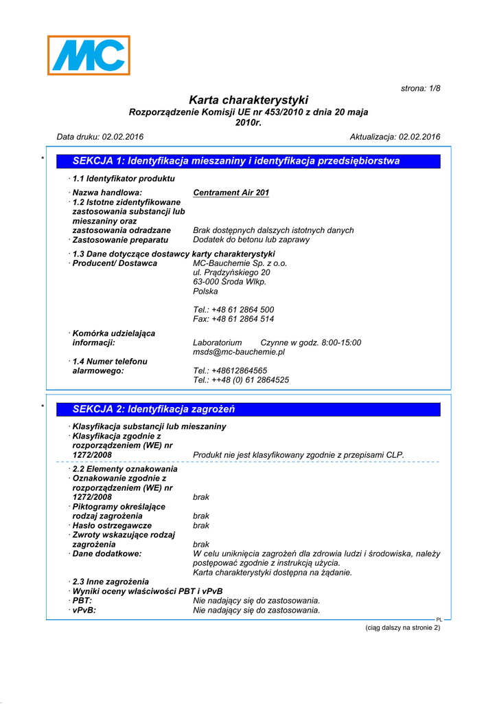 41.0.9 strona: 1/8 Karta charakterystyki Rozporządzenie Komisji UE nr 453/2010 z dnia 20 maja 2010r. Data druku: 02.02.2016 * Aktualizacja: 02.02.2016 SEKCJA 1: Identyfikacja mieszaniny i identyfikacja przedsiębiorstwa · 1.1 Identyfikator produktu · Nazwa handlowa: Centrament Air 201 · 1.2 Istotne zidentyfikowane zastosowania substancji lub mieszaniny oraz Brak dostępnych dalszych istotnych danych zastosowania odradzane · Zastosowanie preparatu Dodatek do betonu lub zaprawy · 1.3 Dane dotyczące dostawcy karty charakterystyki · Producent/ Dostawca MC-Bauchemie Sp. z o.o. ul. Prądzyńskiego 20 63-000 Środa Wlkp. Polska Tel.: +48 61 2864 500 Fax: +48 61 2864 514 · Komórka udzielająca informacji: · 1.4 Numer telefonu alarmowego: * Laboratorium Czynne w godz. 8:00-15:00 [email protected] Tel.: +48612864565 Tel.: ++48 (0) 61 2864525 SEKCJA 2: Identyfikacja zagrożeń · Klasyfikacja substancji lub mieszaniny · Klasyfikacja zgodnie z rozporządzeniem (WE) nr Produkt nie jest klasyfikowany zgodnie z przepisami CLP. 1272/2008 · 2.2 Elementy oznakowania · Oznakowanie zgodnie z rozporządzeniem (WE) nr 1272/2008 · Piktogramy określające rodzaj zagrożenia · Hasło ostrzegawcze · Zwroty wskazujące rodzaj zagrożenia · Dane dodatkowe: brak brak brak brak W celu uniknięcia zagrożeń dla zdrowia ludzi i środowiska, należy postępować zgodnie z instrukcją użycia. Karta charakterystyki dostępna na żądanie. · 2.3 Inne zagrożenia · Wyniki oceny właściwości PBT i vPvB · PBT: Nie nadający się do zastosowania. · vPvB: Nie nadający się do zastosowania. PL (ciąg dalszy na stronie 2) 41.0.9 strona: 2/8 Karta charakterystyki Rozporządzenie Komisji UE nr 453/2010 z dnia 20 maja 2010r. Data druku: 02.02.2016 Aktualizacja: 02.02.2016 Nazwa handlowa: Centrament Air 201 (ciąg dalszy od strony 1) * SEKCJA 3: Skład/informacja o składnikach · 3.2 Charakterystyka chemiczna: Mieszaniny · Opis: Mieszanka z niżej wymienionych składników z bezpiecznymi domieszkami. · Składniki niebezpieczne: * brak SEKCJA 4: Środki pierwszej pomocy · 4.1 Opis środków pierwszej pomocy · Wskazówki ogólne: Środki specjalne nie są konieczne. · po wdychaniu: Dostarczyć świeże powietrze, w razie dolegliwości wezwać lekarza. · po styczności ze skórą: Ogólnie produkt nie działa drażniąco na skórę. · po styczności z okiem: Płukać oczy z otwartą powieką przez kilka minut pod bieżącą wodą. · po spożyciu: Przepłukać jamę ustną i obficie popić wodą. Przy trwałych dolegliwościach porozumieć się z lekarzem. · 4.2 Najważniejsze ostre i opóźnione objawy oraz skutki Brak dostępnych dalszych istotnych danych narażenia · 4.3 Wskazania dotyczące wszelkiej natychmiastowej pomocy lekarskiej i szczególnego postępowania Brak dostępnych dalszych istotnych danych z poszkodowanym * SEKCJA 5: Postępowanie w przypadku pożaru · 5.1 Środki gaśnicze · Przydatne środki gaśnicze: Zabiegi gaszenia ognia dostosować do otoczenia. · 5.2 Szczególne zagrożenia związane z substancją lub Brak dostępnych dalszych istotnych danych mieszaniną · 5.3 Informacje dla straży pożarnej · Specjalne wyposażenie Środki specjalne nie są konieczne. ochronne: SEKCJA 6: Postępowanie w przypadku niezamierzonego uwolnienia do środowiska · 6.1 Indywidualne środki ostrożności, sprzęt ochronny i procedury w sytuacjach Nie konieczne. awaryjnych (ciąg dalszy na stronie 3) PL 41.0.9 strona: 3/8 Karta charakterystyki Rozporządzenie Komisji UE nr 453/2010 z dnia 20 maja 2010r. Data druku: 02.02.2016 Aktualizacja: 02.02.2016 Nazwa handlowa: Centrament Air 201 (ciąg dalszy od strony 2) · 6.2 Środki ostrożności w zakresie ochrony środowiska: · 6.3 Metody i materiały zapobiegające rozprzestrzenianiu się skażenia i służące do usuwania skażenia: · 6.4 Odniesienia do innych sekcji * Rozcieńczyć dużą ilością wody. Zebrać za pomocą materiału wiążącego ciecze (piasek, ziemia okrzemkowa, materiał wiążący k wasy, materiał wiążący uniwersalny, trociny). Nie powstają żadne materiały niebezpieczne. SEKCJA 7: Postępowanie z substancjami i mieszaninami oraz ich magazynowanie · 7.1 Środki ostrożności dotyczące bezpiecznego postępowania · Wskazówki dla ochrony przeciwpożarowej i przeciwwybuchowej: Środki specjalne nie są konieczne. Nie są potrzebne szczególne zabiegi. · 7.2 Warunki bezpiecznego magazynowania, w tym informacje dotyczące wszelkich wzajemnych niezgodności · Magazynowanie: · Wymagania w stosunku do pomieszczeń magazynowych Brak szczególnych wymagań. i zbiorników: · Wskazówki odnośnie Nie konieczne. wspólnego składowania: · Dalsze wskazówki odnośnie Brak. warunków składowania: · 7.3 Szczególne Brak dostępnych dalszych istotnych danych zastosowanie(-a) końcowe * SEKCJA 8: Kontrola narażenia/środki ochrony indywidualnej · Dodatkowe wskazówki dla wykonania urządzeń technicznych: Brak dalszych danych, patrz punkt 7. · 8.1 Parametry dotyczące kontroli · Składniki wraz z kontrolowanymi wartościami granicznymi zależnymi od Produkt nie zawiera znaczących ilości materiałów, których wartości miejsca pracy: graniczne musiałyby być kontrolowane pod kątem warunków miejsca pracy. (ciąg dalszy na stronie 4) PL 41.0.9 strona: 4/8 Karta charakterystyki Rozporządzenie Komisji UE nr 453/2010 z dnia 20 maja 2010r. Data druku: 02.02.2016 Aktualizacja: 02.02.2016 Nazwa handlowa: Centrament Air 201 (ciąg dalszy od strony 3) · Wskazówki dodatkowe: Podstawą były aktualnie obowiązujące wykazy. · 8.2 Kontrola narażenia · Šrodki ochrony indywidualnej: · Ogólne środki ochrony i Należy przes trzegać zwyczajne ś rodk i ostr ożności pr zy higieny: obchodzeniu się z chemikaliami. · Ochrona dróg oddechowych: Nie konieczne. · Ochrona rąk: Nie konieczne. · Materiał, z którego wykonane n.k. są rękawice · Czas penetracji dla materiału, z którego wykonane są rękawice * SEKCJA 9