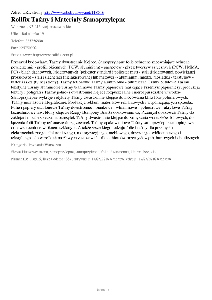 Adres URL strony http://www.abcbudowy.net/118516 Rollfix Taśmy i Materiały Samoprzylepne Warszawa, 02-212, woj. mazowieckie Ulica: Bakalarska 19 Telefon: 225750900 Fax: 225750902 Strona www: http://www.rollfix.com.pl Przemysł budowlany. Taśmy dwustronnie klejące. Samoprzylepne folie ochronne zapewniające ochronę powierzchni: - profili okiennych (PCW, aluminium) - parapetów - płyt z tworzyw sztucznych (PCW, PMMA, PC) - blach dachowych, lakierowanych (poliester standard i poliester mat) - stali (lakierowanej, powlekanej proszkowo) - stali szlachetnej (nielakierowanej lub matowej) - aluminium, miedzi, mosiądzu - tekstyliów luster i szkła (tylnej strony). Taśmy teflonowe Taśmy aluminiowo - bitumiczne Taśmy butylowe Taśmy tekstylne Taśmy aluminiowe Taśmy tkaninowe Taśmy papierowe maskujące Przemysł papierniczy, produkcja tektury i poligrafia Taśmy jedno- i dwustronnie klejące rozpuszczalne i nierozpuszczalne w wodzie Samoprzylepne wykroje i etykiety Taśmy dwustronnie klejące do mocowania klisz foto-polimerowych. Taśmy montażowe litograficzne. Produkcja reklam, materiałów reklamowych i wspomagających sprzedaż Folie i papiery szablonowe Taśmy dwustronne: - piankowe - włókninowe - poliestrowe - akrylowe Taśmy beznośnikowe tzw. błony klejowe Rzepy Bompony Branża opakowaniowa, Przemysł opakowań Taśmy do zaklejania i zabezpieczania przesyłek Taśmy dwustronnie klejące do zamykania woreczków foliowych, do łączenia folii Taśmy teflonowe do zgrzewarek Taśmy opakowaniowe Taśmy samoprzylepne strappingowe oraz wzmocnione włóknem szklanym. A także wszelkiego rodzaju folie i taśmy dla przemysłu elektrotechnicznego, elektronicznego, motoryzacyjnego, meblowego, drzewnego, włókienniczego i tekstylnego - do wszelkich możliwych zastosowań - dla odbiorców przemysłowych, hurtowych i detalicznych. Kategorie: Pozostałe Warszawa Słowa kluczowe: taśma, samoprzylepne, samoprzylepna, folie, dwustronne, klejem, bez, kleju Numer ID: 118516, liczba odsłon: 387, aktywacja: 17/05/2010 07:27:50, edycja: 17/05/2010 07:27:50 Strona 1 / 1