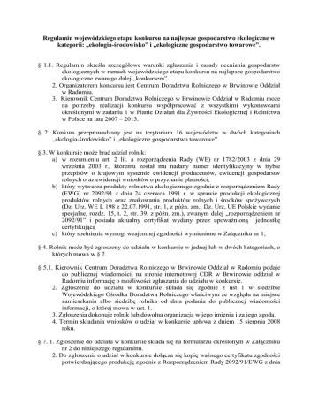 Regulamin wojewódzkiego etapu konkursu na najlepsze gospodarstwo ekologiczne w kategorii: „ekologia-środowisko” i „ekologiczne gospodarstwo towarowe”. § 1.1. Regulamin określa szczegółowe warunki zgłaszania i zasady oceniania gospodarstw ekologicznych w ramach wojewódzkiego etapu konkursu na najlepsze gospodarstwo ekologiczne zwanego dalej „konkursem”. 2. Organizatorem konkursu jest Centrum Doradztwa Rolniczego w Brwinowie Oddział w Radomiu. 3. Kierownik Centrum Doradztwa Rolniczego w Brwinowie Oddział w Radomiu może na potrzeby realizacji konkursu współpracować z wszystkimi wykonawcami określonymi w zadaniu 1 w Planie Działań dla Żywności Ekologicznej i Rolnictwa w Polsce na lata 2007 – 2013. § 2. Konkurs przeprowadzany jest na terytorium 16 województw w dwóch kategoriach „ekologia-środowisko” i „ekologiczne gospodarstwo towarowe”. § 3. W konkursie może brać udział rolnik: a) w rozumieniu art. 2 lit. a rozporządzenia Rady (WE) nr 1782/2003 z dnia 29 września 2003 r., któremu został mu nadany numer identyfikacyjny w trybie przepisów o krajowym systemie ewidencji producentów, ewidencji gospodarstw rolnych oraz ewidencji wniosków o przyznanie płatności; b) który wytwarza produkty rolnictwa ekologicznego zgodnie z rozporządzeniem Rady (EWG) nr 2092/91 z dnia 24 czerwca 1991 r. w sprawie produkcji ekologicznej produktów rolnych oraz znakowania produktów rolnych i środków spożywczych (Dz. Urz. WE L 198 z 22.07.1991, str. 1, z późn. zm.; Dz. Urz. UE Polskie wydanie specjalne, rozdz. 15, t. 2, str. 39, z późn. zm.), zwanym dalej „rozporządzeniem nr 2092/91” i posiada aktualny certyfikat wydany przez upoważnioną jednostkę certyfikującą c) który spełnienia wymogi wzajemnej zgodności wymienione w Załączniku nr 1; § 4. Rolnik może być zgłoszony do udziału w konkursie w jednej lub w dwóch kategoriach, o których mowa w § 2. § 5.1. Kierownik Centrum Doradztwa Rolniczego w Brwinowie Oddział w Radomiu podaje do publicznej wiadomości, na stronie internetowej CDR w Brwinowie oddział w Radomiu informację o możliwości zgłaszania do udziału w konkursie. 2. Zgłoszenie do udziału w konkursie składa się zgodnie z ust 1 w siedzibie Wojewódzkiego Ośrodka Doradztwa Rolniczego właściwym ze względu na miejsce zamieszkania albo siedzibę rolnika od dnia podania do publicznej wiadomości informacji, o której mowa w ust. 1. 3. Zgłoszenia dokonuje rolnik lub dowolna organizacja w jego imieniu i za jego zgodą. 4. Termin składania wniosków o udział w konkursie upływa z dniem 15 sierpnia 2008 roku. § 7. 1. Zgłoszenie do udziału w konkursie składa się na formularzu określonym w Załączniku nr 2 do niniejszego regulaminu. 2. Do zgłoszenia o udział w konkursie dołącza się kopię ważnego certyfikatu zgodności potwierdzającego produkcję zgodnie z Rozporządzeniem Rady 2092/91/EWG z dnia 24 czerwca 1991 r. w sprawie produkcji ekologicznej produktów rolnych oraz znakowania produktów rolnych i środków spożywczych. § 8. 1. Złożone zgłoszenia oceniane są pod względem formalnym. 2. Kierownik Centrum Doradztwa Rolniczego w Brwinowie Oddział w Radomiu lub wyznaczona przez niego osoba powołuje w każdym województwie komisję konkursową, która ocenia poprawne formalnie zgłoszenia. 3. W ocenie o której mowa w ust 2 zawiera się wizytacja wszystkich gospodarstw oraz ocena gospodarstw zgodnie z kryteriami określonymi w Załączniku nr 3. 4. Po dokonaniu oceny wyłaniany i ogłaszany jest zwycięzca konkursu w danym województwie w każdej z kategorii. Komisja konkursowa może przyznać wyróżnienia dla innych uczestników konkursu. 5. Zwycięzca konkursu w danej kategorii w danym województwie zgłaszany jest przez wojewódzką komisję konkursową do etapu krajowego. 6. Zgłoszenie do etapu krajowego przekazuje się do Ministra Rolnictwa i Rozwoju Wsi. 7. Zgłoszenie, o którym mowa w ust. 6 zawiera zdjęcia i opis gospodarstwa oraz formularz oceny gospodarstw zgodnie z kryteriami określonymi w Załączniku 2. Załącznik nr 1 Wymogi wzajemnej zgodności: OCHRONA ŚRODOWISKA Wymogi w zakresie ochrony dzikiego ptactwa i siedlisk przyrodniczych oraz dzikiej fauny i flory Wymogi zgodności 1. Przestrzega się zakazu umyślnego chwytania lub zabijania ptaków podlegających ochronie. 2. Przestrzega się zakazu umyślnego niszczenia gniazd lub płoszenia ptaków objętych ochroną. 3. Przestrzega się zakazu umyślnego zrywania, zbierania i niszczenia roślin objętych ochroną. 4. Przestrzega się zakazu wypalania łąk, pastwisk, nieużytków, rowów, pasów przydrożnych oraz trzcinowisk i szuwarów. Wymogi w zakresie ochrony wód gruntowych przed zanieczyszczeniami spowodowanymi przez niektóre substancje niebezpieczne Wymogi zgodności 1. Miejsca składowania substancji niebezpiecznych dla środowiska zabezpieczają przed bezpośrednim lub pośrednim wprowadzaniem tych substancji do wody gruntowej. 2. Opakowania po substancjach niebezpiecznych przechowywane są w sposób zabezpieczający przed wprowadzaniem substancji szkodliwych do wód gruntowych. 3. Środki ochrony roślin są przechowywane w magazynie lub innym wydzielonym miejscu. 4. Wszystkie znajdujące się aktualnie w magazynie (miejscu składowania) środki ochrony roślin posiadają etykiety producenta i są przechowywane w oryginalnych opakowaniach zgodnie z etykietą-instrukcją. ZDROWIE PUBLICZNE LUDZI, ZDROWIE ZWIERZĄT I ZDROWOTNOŚĆ ROŚLIN ORAZ IDENTYFIKACJA I REJESTRACJA ZWIERZĄT Wymogi w zakresie identyfikacji i rejestracji zwierząt Wymogi zgodności 1 Posiadacz zwierząt ma nadany numer identyfikacyjny producenta. 2 Nadany jest numer siedziby stada. BYDŁO 3 W siedzibie stada wszystkie sztuki bydła są oznakowane zgodnie z przepisami. 4 W siedzibie stada wszystkie sztuki bydła posiadają paszport. 5 Wpisy w księdze rejestracji dokonywane są bezpośrednio po zaistnieniu zdarzenia objętego obowiązkiem wpisu, ni