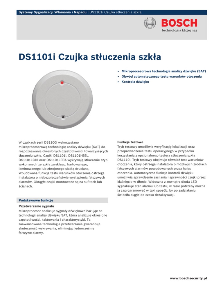 Systemy Sygnalizacji Włamania i Napadu | DS1101i Czujka stłuczenia szkła DS1101i Czujka stłuczenia szkła ▶ Mikroprocesorowa technologia analizy dźwięku (SAT) ▶ Obwód automatycznego testu warunków otoczenia ▶ Kontrola dźwięku W czujkach serii DS1100i wykorzystano mikroprocesorową technologię analizy dźwięku (SAT) do rozpoznawania określonych częstotliwości towarzyszących tłuczeniu szkła. Czujki DS1101i, DS1101i‑BEL, DS1101i‑CHI oraz DS1101i‑FRA wykrywają stłuczenie szyb wykonanych ze szkła zwykłego, hartowanego, laminowanego lub zbrojonego siatką drucianą. Wbudowana funkcja testu warunków otoczenia ostrzega instalatora o niebezpieczeństwie wystąpienia fałszywych alarmów. Okrągłe czujki montowane są na sufitach lub ścianach. Funkcje testowe Tryb testowy umożliwia weryfikację lokalizacji oraz przeprowadzenie testu operacyjnego w przypadku korzystania z opcjonalnego testera stłuczenia szkła DS1110i. Tryb testowy obejmuje również test warunków otoczenia, który ostrzega instalatora o możliwych źródłach fałszywych alarmów powodowanych przez hałas otoczenia. Automatyczna funkcja kontroli dźwięku umożliwia sprawdzenie zasilania i sprawności czujki przez klaśnięcie w dłonie. Widoczna z zewnątrz dioda LED sygnalizuje stan alarmu lub testu; w razie potrzeby można ją zaprogramować w taki sposób, by po zadziałaniu świeciła ciągle do czasu dezaktywacji. Podstawowe funkcje Przetwarzanie sygnału Mikroprocesor analizuje sygnały dźwiękowe bazując na technologii analizy dźwięku SAT, która analizuje określone częstotliwości, taktowania i charakterystyki. Ta zaawansowana technologia przetwarzania gwarantuje skuteczność wykrywania, eliminując jednocześnie fałszywe alarmy. www.boschsecurity.pl 2 | DS1101i Czujka stłuczenia szkła Certyfikaty i świadectwa Parametry środowiskowe Temperatura pracy: Region Certyfikacja Europa CE 89/336/EEC, EN55022: 1998 +A1: 2000 +A2: 2003, EN50130-4: 1996 +A1: 1998 +A2: 2003, EN61000-4-2: 1995 +A1: 1998 +A2: 2001, EN61000-4-3: 2002 +A1: 2003, EN61000-4-4: 1995 +A1: 2000 +A2: 2001, EN61000-4-5: 1995 +A1: 2001, EN61000-4-6: 1996 +A1: 2001 +A2: 2001, EN61000-4-11: 1994 +A1: 2001, EN60950-1: 2001 +A11: 2004 DS1101i_DS1102i_DS1108i Stany Zjednoczone UL ANSR: Intrusion Detection Units (UL639), ANSR7: Intrusion Detection Units Certified for Canada (ULC-S306) Chiny CCC Uwaga Odporność na zakłó- Brak alarmu lub uzbrojenia na częstotliwościach cenia radiowe (RFI): krytycznych w przedziale od 26 do 950 MHz przy natężeniu pola 50 V/m. Parametry mechaniczne Wymiary (wys. x śr.): 2,1 cm x 8,6 cm Materiał: Udaroodporny plastik ABS Wyjścia Alarmowe: Przekaźnik kontaktronowy C o obciążalności 3,5 W, obciążenie rezystancyjne 125 mA przy napięciu 28 VDC. Przełącznik antysabotażowy: Normalnie zwarty (NC) włącznik zabezpieczający z oddzielnymi zaciskami reagujący na otwarcie pokrywy. Obciążalność maksymalna 125 mA przy napięciu 28 VDC. DS1101i-CHI: 2009031901000553 Planowanie od -29°C do +49°C W instalacjach z certyfikatem UL: od 0°C do +49°C Zamówienia - informacje Czujki stłuczenia szkła przeznaczone są tylko do pracy jako element systemu ochrony obwodowej. Powinny być one zawsze stosowane wraz z czujkami ruchu. Montaż Czujkę DS1101i można zamontować na suficie lub na ścianie przeciwległej albo przyległej do okna. Zasięg zależy od akustyki pomieszczenia i wielkości okna. Standardowy obszar pokrycia 7,6 m w przypadku powierzchni szklanych o rozmiarze 30,5 x 30,5 cm. DS1101i Czujka stłuczenia szkła DS1101i DS1101i-BEL Czujka stłuczenia szkła – Belgia DS1101i-BEL DS1101i‑CHI Czujka stłuczenia szkła – Chiny DS1101i‑CHI Sprzęt DS1110i Tester czujek stłuczenia szkła Służy do testowania czujek stłuczenia szkła serii DS1101i, DS1102i, DS1103i oraz DS1108i. Zasilany przez baterię alkaliczną 9 V (w komplecie). Dołączone części Ilość Element 1 Czujka 1 Zestaw montażowy 1 Literatura – Instrukcja instalacji Dane techniczne Parametry elektryczne Pobór prądu: 23 mA przy napięciu 12 VDC Napięcie: 6 – 15 VDC Poland Robert Bosch Sp. z o.o. Jutrzenki 105 str. 02-231 Warszawa Phone: +48 22 715 4101 Fax: +48 22 715 4105 [email protected] www.boschsecurity.pl © Robert Bosch Sp. z o.o./ Security Systems 2010 | Zastrzega się możliwość wprowadzania zmian T5874657419 | Cur: pl-PL, V7, 2 Dec 2010 | Src: en-US, V1, 23 Apr 2009 Represented by DS1110i