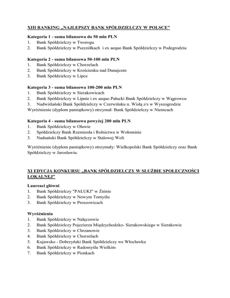 XIII RANKING „NAJLEPSZY BANK SPÓŁDZIELCZY W POLSCE” Kategoria 1 - suma bilansowa do 50 mln PLN 1. Bank Spółdzielczy w Tworogu 2. Bank Spółdzielczy w Pszczółkach i ex aequo Bank Spółdzielczy w Podegrodziu Kategoria 2 - suma bilansowa 50-100 mln PLN 1. Bank Spółdzielczy w Chorzelach 2. Bank Spółdzielczy w Krościenku nad Dunajcem 3. Bank Spółdzielczy w Lipce Kategoria 3 - suma bilansowa 100-200 mln PLN 1. Bank Spółdzielczy w Sierakowicach 2. Bank Spółdzielczy w Lipnie i ex aequo Pałucki Bank Spółdzielczy w Wągrowcu 3. Nadwiślański Bank Spółdzielczy w Czerwińsku n. Wisłą z/s w Wyszogrodzie Wyróżnienie (dyplom pamiątkowy) otrzymał: Bank Spółdzielczy w Niemcach Kategoria 4 - suma bilansowa powyżej 200 mln PLN 1. Bank Spółdzielczy w Oławie 2. Spółdzielczy Bank Rzemiosła i Rolnictwa w Wołominie 3. Nadsański Bank Spółdzielczy w Stalowej Woli Wyróżnienie (dyplom pamiątkowy) otrzymały: Wielkopolski Bank Spółdzielczy oraz Bank Spółdzielczy w Jarosławiu. XI EDYCJA KONKURSU „BANK SPÓŁDZIELCZY W SŁUŻBIE SPOŁECZNOŚCI LOKALNEJ” Laureaci główni 1. Bank Spółdzielczy "PAŁUKI" w Żninie 2. Bank Spółdzielczy w Nowym Tomyślu 3. Bank Spółdzielczy w Proszowicach Wyróżnienia 1. Bank Spółdzielczy w Nałęczowie 2. Bank Spółdzielczy Pojezierza Międzychodzko- Sierakowskiego w Sierakowie 3. Bank Spółdzielczy w Chrzanowie 4. Bank Spółdzielczy w Chorzelach 5. Kujawsko - Dobrzyński Bank Spółdzielczy we Włocławku 6. Bank Spółdzielczy w Radomyślu Wielkim 7. Bank Spółdzielczy w Pionkach I EDYCJA RANKINGU KZBS „BANK SPÓŁDZIELCZY – WIARYGODNY DORADCA FINANSOWY” Kategoria 1 –suma bilansowa do 50 mln PLN 1. Bank Spółdzielczy w Pionkach 2. Bank Spółdzielczy w Podegrodziu 3. Bank Spółdzielczy w Tworogu Kategoria 2 – suma bilansowa 50 – 100 mln PLN 1. Bank Spółdzielczy w Lipce 2. Bank Spółdzielczy w Brzeźnicy 3. Bank Spółdzielczy w Chorzelach Kategoria 3 – suma bilansowa 100 - 200 mln PLN 1. Bank Spółdzielczy w Nowym Tomyślu 2. Bank Spółdzielczy w Sierakowicach 3. Gospodarczy Bank Spółdzielczy w Choszcznie i ex aequo Bank Spółdzielczy w Dynowie Kategoria 4 – suma bilansowa powyżej 200 mln PLN 1. Wielkopolski Bank Spółdzielczy 2. Orzesko-Knurowski Bank Spółdzielczy z/s w Knurowie 3. Powiślański Bank Spółdzielczy w Kwidzynie i ex aequo Bałtycki Bank Spółdzielczy w Darłowie