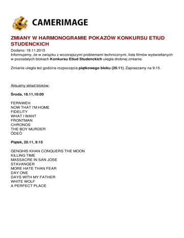 ZMIANY W HARMONOGRAMIE POKAZÓW KONKURSU ETIUD STUDENCKICH Dodano: 18.11.2015 Informujemy, że w związku z wczorajszymi problemami technicznymi, lista filmów wyświetlanych w pozostałych blokach Konkursu Etiud Studenckich uległa drobnej zmianie. Zmianie uległa też godzina rozpoczęcia piątkowego bloku (20.11). Zapraszamy na 9:15. Aktualny skład bloków: Środa, 18.11,10:00 FERNWEH NOW THAT I’M HOME FIDELITY WHAT I WANT FRONTMAN CHRONOS THE BOY MURDER ÖDEÖ Piątek, 20.11, 9:15 GENGHIS KHAN CONQUERS THE MOON KILLING TIME MASSACRE IN SAN JOSE STAVANGER MORE HATE THAN FEAR DAY ONE DAYS WITH MY FATHER WHITE WOLF A PERFECT PLACE