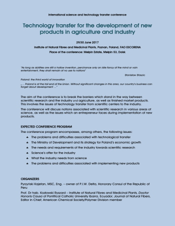 International science and technology transfer conference Technology transfer for the development of new products in agriculture and industry 29/30 June 2017 Institute of Natural Fibres and Medicinal Plants, Poznan, Poland, FAO ESCORENA Place of the conference: Mełpin Estate, Mełpin 53, Dolsk “As long as abilities are still a hollow invention, perchance only an idle fancy of the mind or vain entertainment, they shall remain of no use to nations” Stanisław Staszic Poland: the third world of innovation „… Poland is at the tail end of the Union. Without significant changes in this area, our country’s business can forget about development …” The aim of the conference is to break the barriers which stand in the way between scientific research and the industry and agriculture, as well as finished market products. This involves the issues of technology transfer from scientific centers to the industry. The conference will discuss notions associated with scientific research in various areas of science, as well as the issues which an entrepreneur faces during implementation of new products. EXPECTED CONFERENCE PROGRAM The conference program encompasses, among others, the following issues: The problems and difficulties associated with technological transfer The Ministry of Development and its strategy for Poland’s economic growth The needs and requirements of the industry towards scientific research Science’s offer for the industry What the industry needs from science The problems and difficulties associated with implementing new products ORGANIZERS Pyrzyński Kajetan, MSC, Eng. – owner of P.I.W. Delta, Honorary Consul of the Republic of Peru Prof. Dr hab. Kozłowski Ryszard – Institute of Natural Fibres and Medicinal Plants, Doctor Honoris Causa of Pontifical Catholic University Ibarra, Ecuador; Journal of Natural Fibers, Editor in Chief; American Chemical Society/Polymer Division member SCIENTIFIC COMMITTEE President: Prof. Dr Kajzar Frank – Faculty of Applied Chemistry and Materials Science, University Politehnica of Bucharest, Bucharest, Romania. Prof. Dr Akbari Somaye – Amirkabir University of Technology, Tehran, Iran Bartkowski Lech, MSc – Institute of Natural Fibres and Medicinal Plants, Poznan Prof. Dr hab. Brycki Bogumił – Department of Chemistry, Adam Mickiewicz University Poznan Prof. Dr hab. Fiedorow Ryszard – Department of Chemistry, Adam Mickiewicz University Poznan Prof. Dr Kolodziejczyk Paul – International Research Projects, Department of Food and Nutritional Science, University of Alberta, Canada Prof. Dr Eng. Możeński Cezary – New Chemical Syntheses Institute, Puławy Director Dr Nyszko Grzegorz – Military Institute of Chemistry and Radiometry, Warsaw Prof. Dr Rowell Roger M. – Forestry, Composite Agricultural Materials, Madison Prof. Dr hab. Sas-Paszt Lidia – Research Institute of Pomology and Floriculture, Skierniewice Prof. Dr hab. Schroeder Grzegorz – Department of Chemistry, Adam Mickiewicz University Poznan Prof. Dr hab. Sterzyński Tomasz – Poznan University of Technology Prof. Dr Strykowski Władysław – Poznan Prof. Dr hab. Witek Adam – Institute of Ceramic and Building Materials, Warsaw ORGANIZING COMMITTEE Pyrzyńska Małgorzata – P.I.W. Delta Michalska Agnieszka – P.I.W. Delta Muzyczek Małgorzata - Institute of Natural Fibres and Medicinal Plants Wróblewska Sylwia – P.I.W. Delta Mackiewicz-Talarczyk Maria – Institute of Natural Fibres and Medicinal Plants, FAO ESCORENA Network secretary. CONTACT Dr Agnieszka Michalska Tel: 882 021 949; [email protected] Przedsiębiorstwo Innowacyjno-Wdrożeniowe "DELTA”, Ul. Krupczyn 5, 63-140 Dolsk, Poland Announcements regarding this conference will regularly be published on the website: www.delta-dolsk.pl
