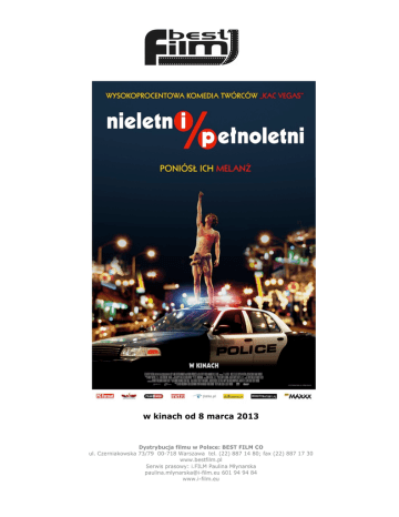 w kinach od 8 marca 2013 Dystrybucja filmu w Polsce: BEST FILM CO ul. Czerniakowska 73/79 00-718 Warszawa tel. (22) 887 14 80; fax (22) 887 17 30 www.bestfilm.pl Serwis prasowy: i.FILM Paulina Młynarska [email protected] 601 94 94 84 www.i-film.eu OBSADA MilesTeller ........................................................................... Miller Justin Chon .................................................................... JeffChang Skylar Astin ........................................................................ Casey Sarah Wright ....................................................................... Nicole REALIZATORZY reżyseria ...................................................... Jon Lucas, Scott Moore scenariusz……………………………………………………………….Jon Lucas, Scott Moore zdjęcia ....................................................................... Terry Stacey montaż ...................................................................... John Refoua muzyka .................................................................... Lyle Workman kostiumy ................................................................ Christine Wada scenografia .............................................................. Jerry Fleming producenci ......................................... David Hoberman, Todd Lieberman O FILMIE Gatunek ...................................................................... komedia Czas ............................................................................... 93 min Kraj produkcji ....................................................................... USA Rok produkcji ...................................................................... 2013 Produkcja…. Mandeville Films, Relativity Media, SkyLand Entertainment Dystrybucja w Polsce ...................................................... Best Film Polska premiera ..................................................... 8 marca 2013 Dystrybucja filmu w Polsce: BEST FILM CO ul. Czerniakowska 73/79 00-718 Warszawa tel. (22) 887 14 80; fax (22) 887 17 30 www.bestfilm.pl Serwis prasowy: i.FILM Paulina Młynarska [email protected] 601 94 94 84 www.i-film.eu SYNOPSIS Komedia twórców bijących rekordy popularności Kac Vegas i Kac Vegas w Bangkoku. JeffChang jest wzorowym uczniem. Szykuje się do najważniejszego egzaminu w życiu… Dzień wcześniej koledzy postanawiają uczcić jego urodziny. Za kilka godzin będzie pełnoletni. Ta noc nie może skończyć się na jednym piwie... Nieudany skok z balkonu do basenu, ucieczka przed napalonymi nastolatkami z kijami baseballowymi i sprint po dachach samochodów w bikini z pluszowym misiem w... a do tego żubr na zebrze. Tysiące siniaków, setki śladów damskiej szminki na ciele i potworny kac, a za dwie godziny egzamin do najbardziej prestiżowej szkoły… To wszystko nie tak miało wyglądać. O PRODUKCJI Po spektakularnym sukcesie filmu Fighter, producenci David Hoberman i Todd Lieberman stanęli przed ekscytującą perspektywą, nie tylko ponownej współpracy ze studiem, które pomogło im zdobyć nominacje do Nagrody Akademii, ale też z podziwianymi przez nich od dawna scenarzystami Jonem Lucasem i Scottem Moore, twórcami filmów Kac Vegas i Kac Vegas w Bankoku. „Podejmowaliśmy wiele prób nawiązania współpracy z tymi scenarzystami, ponieważ uwielbiamy ich styl i poczucie humoru. Zarówno scenariusz jak i oni sami zrobili na nas ogromne wrażenie. Decyzja była dla nas oczywista”- mówi Hoberman. Lieberman dodaje: „Nigdy wcześniej nie byłem producentem komedii dla dorosłych, a bardzo mi na tym zależało. Wyglądało na to, że projekt da mi szansę współpracy z filmowcami, dla których żywię głęboki szacunek. To była, w zasadzie, idealna sytuacja”. Scenariusz, który tak zachwycił producentów, opiera się na pozornie prostym założeniu, lecz sięga nieco głębiej, niż może się wydawać. „W skrócie jest to historia trzech przyjaciół, spotykających się z okazji dwudziestych pierwszych urodzin jednego z nich, po czym ich wspólne wyjście przeradza się w kompletne Dystrybucja filmu w Polsce: BEST FILM CO ul. Czerniakowska 73/79 00-718 Warszawa tel. (22) 887 14 80; fax (22) 887 17 30 www.bestfilm.pl Serwis prasowy: i.FILM Paulina Młynarska [email protected] 601 94 94 84 www.i-film.eu szaleństwo” - mówi Moore. „[Zadaliśmy sobie więc pytanie], czy większość przyjaźni zasadza się na bliskości geograficznej?”. Ten motyw przeplata się w filmie i nabiera szczególnego znaczenia, gdy przyjaźń głównych bohaterów zostaje wystawiona na próbę. „Nawiązujemy wspaniałe przyjaźnie, lecz czy dzieje się tak dlatego, że poznajemy kogoś i budujemy z nim silną więź, czy też, po prostu, mieszamy po sąsiedzku z jakimś gościem i wygodnie nam spotykać się, wychodzić na imprezy i balować razem z nim?” - zastanawia się Moore. Chociaż prowokacyjne sceny są normą w tego typu komediach, nieletni / pełnoletni zaskakują, równoważąc błazeństwa ze scenami z życia wziętymi, z którymi widz może się utożsamić. „Niezbyt interesują mnie wulgarne komedie, które nie są osadzone w rzeczywistości” - ujawnia Lieberman. „A ten scenariusz zawierał oba elementy”. Po ogromnym sukcesie Kac Vegas, Jon Lucas i Scott Moore napisali scenariusz nieletni / pełnoletni, który nie opierał się na ich własnych doświadczeniach, a raczej na szalonych pomysłach, które zawsze mieli ochotę zrealizować. „Najczęściej motywacją moją i Scotta jest chęć zaspokojenia naszych pragnień. Nie wydaje mi się, żeby moje dwudzieste pierwsze urodziny były tak szalone, jak wspomnienia, które pielęgnuję. Na pewno było podczas nich kilka ekscesów, lecz nie da się ich porównać z doświadczeniami naszych bohaterów” - zwierza się Lucas. „Obydwaj byliśmy podekscytowani perspektywą komedii opartej na akcji” dodaje Lucas. „Kac Vegas zdobył wielką popularn