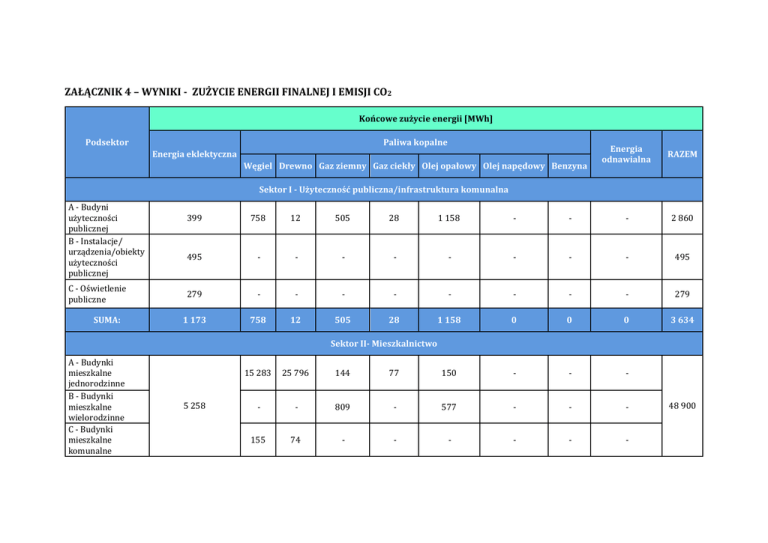 ZAŁĄCZNIK 4 – WYNIKI - ZUŻYCIE ENERGII FINALNEJ I EMISJI CO2