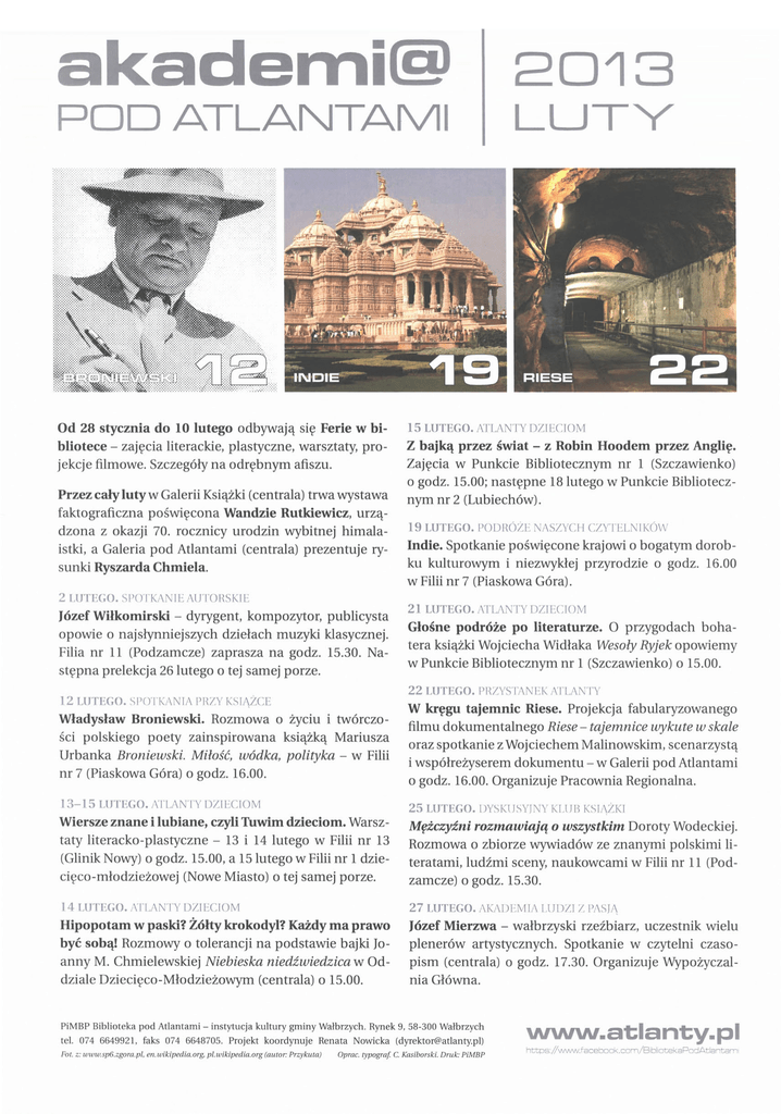 akaderni@ 2013 POD ATLANTAMI LUTY Od 28 stycznia do 10 lutego odbywają się Ferie w bibliotece - zajęcia literackie, plastyczne, warsztaty, projekcje filmowe. Szczegóły na odrębnym afiszu. Przez cały luty w Galerii Książki (centrala) trwa wystawa faktograficzna poświęcona Wandzie Rutkiewicz, urzą dzona z okazji 70. rocznicy urodzin wybitnej himalaistki, a Galeria pod Atlantami (centrala) prezentuje rysunki Ryszarda Chmiela. 15 LUTEGO. ATLANTY DZIECIOM Z bajką przez świat - z Robin Hoodem przez Anglię. Zajęcia w Punkcie Bibliotecznym nr l (Szczawienko) o godz. 15.00; następne 18 lutego w Punkcie Bibliotecznym nr 2 (Lubiechów) . 19 LUTEGO. PODRÓŻE NASZYCH CZYTELNIKÓW Indie. Spotkanie poświęcone krajowi o bogatym dorobku kulturowym i niezwykłej przyrodzie o godz. 16.00 w Filii nr 7 (Piaskowa Góra). 2 LUTEGO. SPOTKANIE AUTORSKIE Józef Wiłkomirski - dyrygent, kompozytor, publicysta opowie o naj słynniej szych dziełach muzyki klasycznej. Filia nr 11 (Podzamcze) zaprasza na godz. 15.30. Następna prelekcja 26 lutego o tej samej porze. 21 LUTEGO. ATlANTY DZIECIOM Głośne podróże po literaturze. O przygodach bohatera książki Wojciecha Widłaka Wesoły Ryjek opowiemy w Punkcie Bibliotecznym nr l (Szczawienko) o 15.00. 22 LUTEGO. PRZYSTANEK ATLANTY 12 LUTEGO. SPOTKANIA PRZY KSIĄŻCE Broniewski. Rozmowa o życiu i twórczości polskiego poety zainspirowana książką Mariusza Urbanka Broniewski. Miłość, wódka, polityka - w Filii nr 7 (Piaskowa Góra) o godz. 16.00. W kręgu tajemnic Riese. Projekcja fabularyzowanego filmu dokumentalnego Riese - tajemnice wykute w skale oraz spotkanie z Wojciechem Malinowskim, scenarzystą i współreżyserem dokumentu - w Galerii pod Atlantami o godz. 16.00. Organizuje Pracownia Regionalna. 13-15 LUTEGO. ATLANTY DZIECIOM 25 LUTEGO. DYSKUSYJNY KLUB KSIl\ŻKI Wiersze znane i lubiane, czyli Tuwim dzieciom. Warsztaty literacko-plastyczne - 13 i 14 lutego w Filii nr 13 (Glinik Nowy) o godz. 15.00, a 15 lutego w Filii nr l dziecięco-młodzieżowej (Nowe Miasto) o tej samej porze. Mężczyźni rozmawiają o wszystkim Doroty Wodeckiej. Rozmowa o zbiorze wywiadów ze znanymi polskimi literatami, ludźmi sceny, naukowcami w Filii nr 11 (Podzamcze) o godz. 15.30. 14 LUTEGO. ATLANTY DZIECIOM 27 LUTEGO. AKADEMIA LUDZI Z PASJĄ Hipopotam w paski? Żółty krokodyl? Każdy ma prawo być sobą! Rozmowy o tolerancji na podstawie bajki Joanny M. Chmielewskiej Niebieska niedźwiedzica w Oddziale Dziecięco-Młodzieżowym (centrala) o 15.00. Józef Mierzwa - wałbrzyski rzeźbiarz, uczestnik wielu plenerów artystycznych. Spotkanie w czytelni czasopism (centrala) o godz. 17.30. Organizuje Wypożyczal Władysław niaGłówna. PiMBP Biblioteka pod Atlantami - instytucja kultury gminy Wałbrzych. Rynek 9, 58-300 Wałbrzych tel. 074 6649921, faks 074 6648705. Projekt koordynuje Renata Nowicka ([email protected]) Fot. z: www.sp6.zgora.pl.en.wikipedia.org.pl.wikipedia.org (autor: Przykuta) Oprac. typograf C. Kasiborski. Druk: PiMBP \N\N\N.atlanty.pl https:/lwvvw.facebook.com/BrbllotekaPodAtlantaml