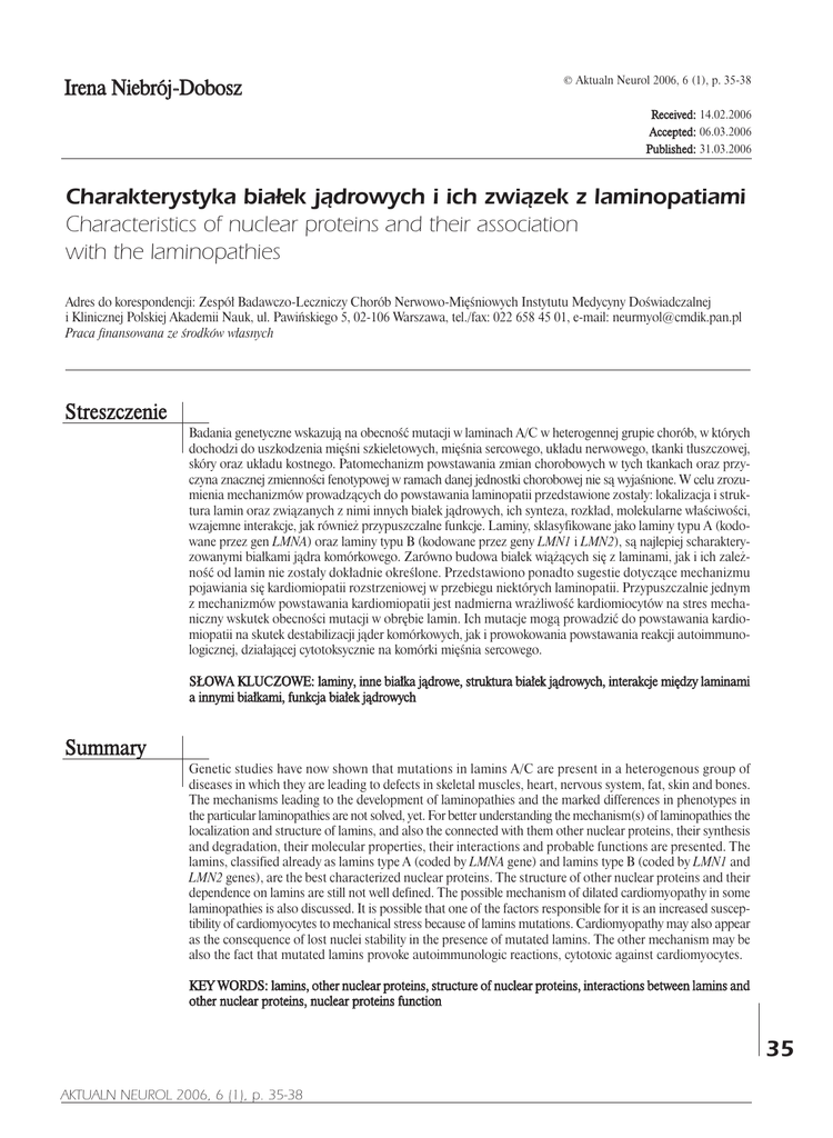 Irena Niebrój-Dobosz © Aktualn Neurol 2006, 6 (1), p. 35-38 Received: 14.02.2006 Accepted: 06.03.2006 Published: 31.03.2006 Charakterystyka bia³ek j¹drowych i ich zwi¹zek z laminopatiami Characteristics of nuclear proteins and their association with the laminopathies Adres do korespondencji: Zespó³ Badawczo-Leczniczy Chorób Nerwowo-Miêœniowych Instytutu Medycyny Doœwiadczalnej i Klinicznej Polskiej Akademii Nauk, ul. Pawiñskiego 5, 02-106 Warszawa, tel./fax: 022 658 45 01, e-mail: [email protected] Praca finansowana ze œrodków w³asnych Streszczenie Badania genetyczne wskazuj¹ na obecnoœæ mutacji w laminach A/C w heterogennej grupie chorób, w których dochodzi do uszkodzenia miêœni szkieletowych, miêœnia sercowego, uk³adu nerwowego, tkanki t³uszczowej, skóry oraz uk³adu kostnego. Patomechanizm powstawania zmian chorobowych w tych tkankach oraz przyczyna znacznej zmiennoœci fenotypowej w ramach danej jednostki chorobowej nie s¹ wyjaœnione. W celu zrozumienia mechanizmów prowadz¹cych do powstawania laminopatii przedstawione zosta³y: lokalizacja i struktura lamin oraz zwi¹zanych z nimi innych bia³ek j¹drowych, ich synteza, rozk³ad, molekularne w³aœciwoœci, wzajemne interakcje, jak równie¿ przypuszczalne funkcje. Laminy, sklasyfikowane jako laminy typu A (kodowane przez gen LMNA) oraz laminy typu B (kodowane przez geny LMN1 i LMN2), s¹ najlepiej scharakteryzowanymi bia³kami j¹dra komórkowego. Zarówno budowa bia³ek wi¹¿¹cych siê z laminami, jak i ich zale¿noœæ od lamin nie zosta³y dok³adnie okreœlone. Przedstawiono ponadto sugestie dotycz¹ce mechanizmu pojawiania siê kardiomiopatii rozstrzeniowej w przebiegu niektórych laminopatii. Przypuszczalnie jednym z mechanizmów powstawania kardiomiopatii jest nadmierna wra¿liwoœæ kardiomiocytów na stres mechaniczny wskutek obecnoœci mutacji w obrêbie lamin. Ich mutacje mog¹ prowadziæ do powstawania kardiomiopatii na skutek destabilizacji j¹der komórkowych, jak i prowokowania powstawania reakcji autoimmunologicznej, dzia³aj¹cej cytotoksycznie na komórki miêœnia sercowego. S£OWA KLUCZOWE: laminy, inne bia³ka j¹drowe, struktura bia³ek j¹drowych, interakcje miêdzy laminami a innymi bia³kami, funkcja bia³ek j¹drowych Summary Genetic studies have now shown that mutations in lamins A/C are present in a heterogenous group of diseases in which they are leading to defects in skeletal muscles, heart, nervous system, fat, skin and bones. The mechanisms leading to the development of laminopathies and the marked differences in phenotypes in the particular laminopathies are not solved, yet. For better understanding the mechanism(s) of laminopathies the localization and structure of lamins, and also the connected with them other nuclear proteins, their synthesis and degradation, their molecular properties, their interactions and probable functions are presented. The lamins, classified already as lamins type A (coded by LMNA gene) and lamins type B (coded by LMN1 and LMN2 genes), are the best characterized nuclear proteins. The structure of other nuclear proteins and their dependence on lamins are still not well defined. The possible mechanism of dilated cardiomyopathy in some laminopathies is also discussed. It is possible that one of the factors responsible for it is an increased susceptibility of cardiomyocytes to mechanical stress because of lamins mutations. Cardiomyopathy may also appear as the consequence of lost nuclei stability in the presence of mutated lamins. The other mechanism may be also the fact that mutated lamins provoke autoimmunologic reactions, cytotoxic against cardiomyocytes. KEY WORDS: lamins, other nuclear proteins, structure of nuclear proteins, interactions between lamins and other nuclear proteins, nuclear proteins function 35 AKTUALN NEUROL 2006, 6 (1), p. 35-38 SYMPOZJUM – LAMINOPATIE genetycznie przekazywanych 11 laminopatiach obserwujemy uszkodzenia ró¿nych tkanek, takich jak miêœnie szkieletowe, miêsieñ sercowy, uk³ad nerwowy, tkanka t³uszczowa, skóra i uk³ad kostny(1). Do zmian chorobowych w tych tkankach dochodzi wskutek mutacji niektórych bia³ek j¹der komórkowych, m.in. lamin kodowanych przez gen LMNA. Patomechanizm zmian chorobowych wynikaj¹cych z mutacji tych bia³ek w bardzo ró¿nych jednostkach chorobowych, jak równie¿ przyczyny znacznej nieraz zmiennoœci fenotypowej w ramach danej choroby s¹ trudne do okreœlenia. Aby zrozumieæ patogenezê laminopatii, musimy poznaæ strukturê i funkcje nie tylko samych lamin, ale tak¿e bia³ek z nimi zwi¹zanych, ich molekularne w³aœciwoœci, wzajemne interakcje oraz ich funkcje. Okreœlono wzglêdnie dok³adnie strukturê lamin i niektórych ³¹cz¹cych siê z nimi bia³ek, niemniej ca³a wiedza o ich funkcji to na razie jedynie hipotezy. Najbardziej rozpowszechnionymi i najlepiej scharakteryzowanymi strukturalnie bia³kami j¹dra komórkowego s¹ laminy(2). Sklasyfikowano je jako laminy typu A (A, A10, C, C2), kodowane przez gen LMNA, oraz laminy typu B (B1, B2, B3), kodowane przez geny LMN1 i LMN2(3,4). Prekursorem laminy A s¹ prelaminy A. Lamina typu A wykazuje zale¿noœæ od lamin typu B(5). Lamina C ró¿ni siê od laminy A w niewielkim stopniu – obecnoœci¹ 6 aminokwasów, przypuszczalnie równie¿ swoj¹ funkcj¹. Wbudowywanie jej do blaszki j¹drowej uzale¿nione jest od obecnoœci laminy A(6). Okreœlone zosta³y miejsca, w których laminy wi¹¿¹ siê z bia³kami umiejscowionymi g³ównie w wewnêtrznej b³onie j¹drowej. Do bia³ek tych nale¿¹: polipeptydy LAP1 i LAP2 (α, β, γ), emeryna, receptor laminy B (LBR), MAN1 (polipeptyd 82,3 kDa), otefina, YA, Rb(7) i nurim. Laminy ³¹cz¹ siê równie¿ z bia³kami wi¹¿¹cymi siê z chromatyn¹ (BAF)(8), bia³kiem HA95(9), jak równie¿ z LAP2α(8,10). Z laminami ³¹czy siê przypuszczalnie tak¿e nespryna, bia³ko znajduj¹ce siê w zewnêtrznej b³onie j¹drowej. Wszystkie te bia³ka wi¹¿¹ siê z lamin¹ A/C 