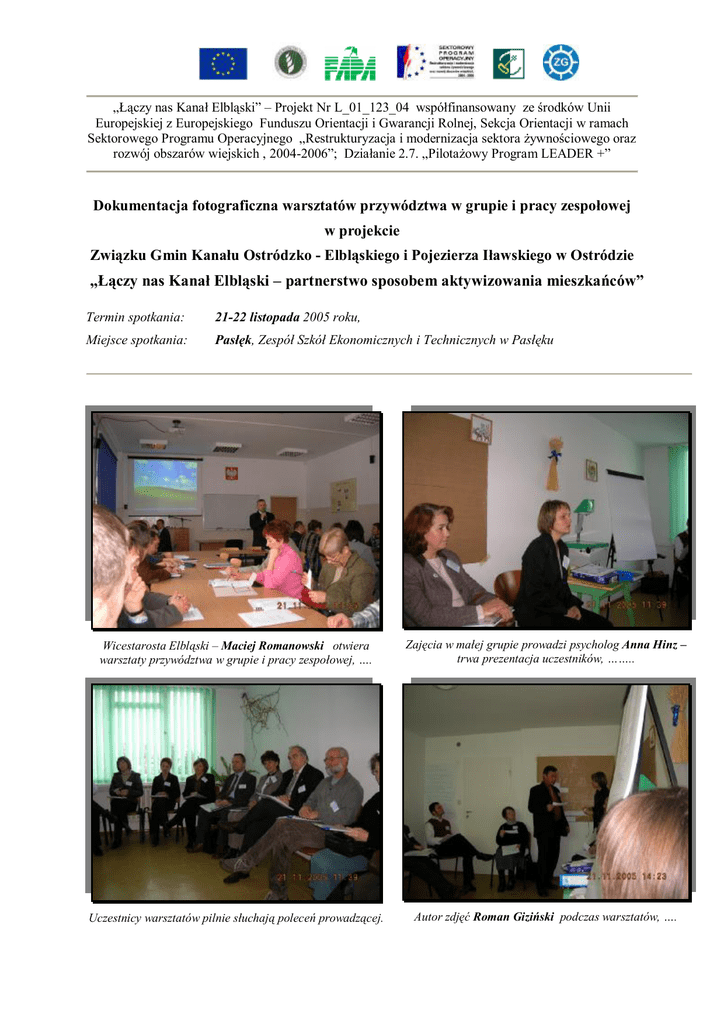 „Łączy nas Kanał Elbląski” – Projekt Nr L_01_123_04 współfinansowany ze środków Unii Europejskiej z Europejskiego Funduszu Orientacji i Gwarancji Rolnej, Sekcja Orientacji w ramach Sektorowego Programu Operacyjnego „Restrukturyzacja i modernizacja sektora żywnościowego oraz rozwój obszarów wiejskich , 2004-2006”; Działanie 2.7. „Pilotażowy Program LEADER +” Dokumentacja fotograficzna warsztatów przywództwa w grupie i pracy zespołowej w projekcie Związku Gmin Kanału Ostródzko - Elbląskiego i Pojezierza Iławskiego w Ostródzie „Łączy nas Kanał Elbląski – partnerstwo sposobem aktywizowania mieszkańców” Termin spotkania: 21-22 listopada 2005 roku, Miejsce spotkania: Pasłęk, Zespół Szkół Ekonomicznych i Technicznych w Pasłęku Wicestarosta Elbląski – Maciej Romanowski otwiera warsztaty przywództwa w grupie i pracy zespołowej, …. Zajęcia w małej grupie prowadzi psycholog Anna Hinz – trwa prezentacja uczestników, …….. Uczestnicy warsztatów pilnie słuchają poleceń prowadzącej. Autor zdjęć Roman Giziński podczas warsztatów, …. Uczestnik warsztatów - Henryk Plis przedstawia swoje oczekiwania, co do roli Lokalnej Grupy Działania , ……… Uczestnicy warsztatów przy pracy, w tle siła motywacji, …. Prowadząca warsztaty – Joanna Strzelecka dokładnie objaśnia zadania do wykonania ……….., uczestnicy drugiej grupy warsztatowej, ……….. Praca, to praca, nikt nie spieszy się nawet na kolację, ….. Tu nikt nie ma powodu do nudy, ……… Są już wyniki pierwszych ćwiczeń, ………….. …. i ostatnich, z umiejętności słuchania ……… Autor strony www.kanalelblaski.pl – Krzysztof Fidura na zajęciach z grupą roboczą dyskutuje o aktualizacji strony,… Grupa zdecydowała, że strona ma być dobrą promocją Kanału Elbląskiego i gmin około kanałowych, ……. Drugi dzień warsztatów kończył wykład Anny Hinz nt. „Roli lidera w środowisku lokalnym” ..., słuchacze wykładu podsumowującego warsztaty, …. Pasłęk, 21-22 listopada 2005 roku. W spotkaniu uczestniczyło w pierwszym dniu 53 osoby, w drugim dniu 50 osób.