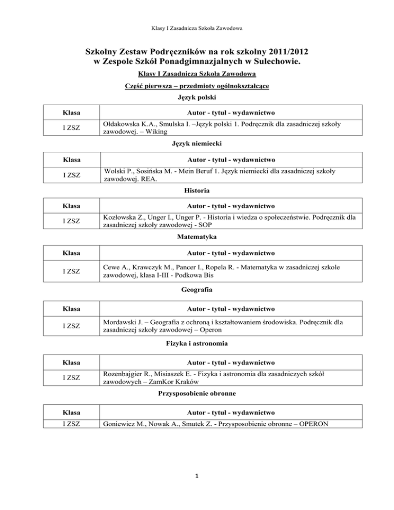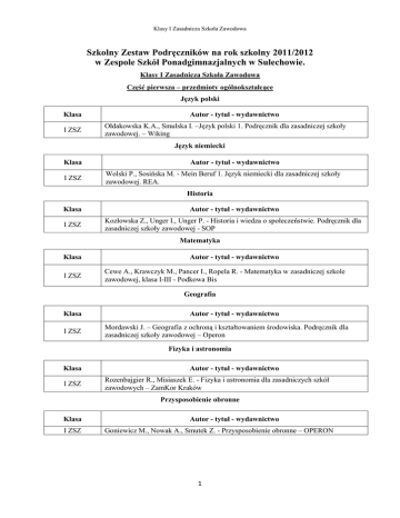 Klasy I Zasadnicza Szkoła Zawodowa Szkolny Zestaw Podręczników na rok szkolny 2011/2012 w Zespole Szkół Ponadgimnazjalnych w Sulechowie. Klasy I Zasadnicza Szkoła Zawodowa Część pierwsza – przedmioty ogólnokształcące Język polski Klasa I ZSZ Autor - tytuł - wydawnictwo Ołdakowska K.A., Smulska I. –Język polski 1. Podręcznik dla zasadniczej szkoły zawodowej. – Wiking Język niemiecki Klasa I ZSZ Autor - tytuł - wydawnictwo Wolski P., Sosińska M. - Mein Beruf 1. Język niemiecki dla zasadniczej szkoły zawodowej. REA. Historia Klasa Autor - tytuł - wydawnictwo I ZSZ Kozłowska Z., Unger I., Unger P. - Historia i wiedza o społeczeństwie. Podręcznik dla zasadniczej szkoły zawodowej - SOP Matematyka Klasa I ZSZ Autor - tytuł - wydawnictwo Cewe A., Krawczyk M., Pancer I., Ropela R. - Matematyka w zasadniczej szkole zawodowej, klasa I-III - Podkowa Bis Geografia Klasa I ZSZ Autor - tytuł - wydawnictwo Mordawski J. – Geografia z ochroną i kształtowaniem środowiska. Podręcznik dla zasadniczej szkoły zawodowej – Operon Fizyka i astronomia Klasa I ZSZ Autor - tytuł - wydawnictwo Rozenbajgier R., Misiaszek E. - Fizyka i astronomia dla zasadniczych szkół zawodowych – ZamKor Kraków Przysposobienie obronne Klasa I ZSZ Autor - tytuł - wydawnictwo Goniewicz M., Nowak A., Smutek Z. - Przysposobienie obronne – OPERON 1 Klasy I Zasadnicza Szkoła Zawodowa Część druga - przedmioty zawodowe (wybór podręcznika w zaleŜności od zawodu) Organizacja sprzedaŜy Klasa I ZSZ Zawód sprzedawca Autor - tytuł - wydawnictwo Komosa A. - Organizacja sprzedaŜy – EKONOMIC Promocja Klasa I ZSZ Zawód sprzedawca Autor - tytuł - wydawnictwo Przydatek A. J. – Promocja -WSiP Technologia gastronomiczna z towaroznawstwem Klasa I ZSZ kucharz małej gastronomii Autor - tytuł - wydawnictwo Konarzewska M., Zielonka B., Konarzewska - Sokołowska M. – Technologia gastronomiczna z towaroznawstwem. Cz. 1 - REA Zasady Ŝywienia Klasa Autor - tytuł - wydawnictwo I ZSZ kucharz małej gastronomii Superczyńska E., śylińska - Karczmarek M.– Zasady Ŝywienia. Podręcznik dla zawodu kucharz małej gastronomii - REA WyposaŜenie techniczne zakładów gastronomicznych Klasa I ZSZ kucharz małej gastronomii Autor - tytuł - wydawnictwo Konarzewska M., Lada E. H., Zielonka B. – WyposaŜenie techniczne zakładów gastronomicznych. Podręcznik dla zawodu kucharz małej gastronomii w zasadniczej szkole zawodowej – REA Podstawy elektrotechniki i elektroniki Klasa I ZSZ elektryk Autor - tytuł - wydawnictwo Kurdziel R. – Podstawy elektrotechniki. Część I i II - WSiP 2
