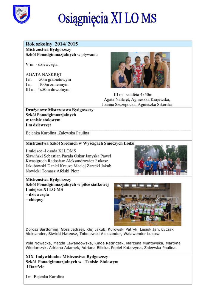 Rok szkolny 2014/ 2015 Mistrzostwa Bydgoszczy Szkół Ponadgimnazjalnych w pływaniu V m - dziewczęta AGATA NASKRĘT Im 50m grzbietowym Im 100m zmiennym III m 4x50m dowolnym III m. sztafeta 4x50m Agata Naskręt, Agnieszka Krajewska, Joanna Szczepocka, Agnieszka Sikorska Drużynowe Mistrzostwa Bydgoszczy Szkół Ponadgimnazjalnych w tenisie stołowym I m dziewczęt Bejenka Karolina ,Zalewska Paulina Mistrzostwa Szkół Średnich w Wyścigach Smoczych Łodzi I miejsce -I osada XI LOMS Sławiński Sebastian Pacała Oskar Janyska Paweł Kwasigroch Radosław Aleksandrowicz Łukasz Jakubowski Daniel Krauze Maciej Zarecki Jakub Nowicki Tomasz Afelski Piotr Mistrzostwa Bydgoszczy Szkół Ponadgimnazjalnych w piłce siatkowej I miejsce XI LO MS – dziewczęta – chłopcy Dorosz Bartłomiej, Goss Jędrzej, Kluj Jakub, Kurowski Patryk, Lesiuk Jan, Łyczak Aleksander, Siwicki Mateusz, Tobolewski Aleksander, Walawender Łukasz Pola Nowacka, Magda Lewandowska, Kinga Ratajczak, Marzena Muntowska, Martyna Włodarczyk, Adriana Adamek, Adriana Bilicka, Popiel Katarzyna, Zalewska Paulina. XIX Indywidualne Mistrzostwa Bydgoszczy Szkół Ponadgimnazjalnych w Tenisie Stołowym i Dart’cie I m. Bejenka Karolina II Indywidualne Mistrzostwa Województwa Kujawsko-Pomorskiego Szkół Ponadgimnazjalnych w Tenisie Stołowym IV m Bejenka Karolina Mistrzostwa Województwa Kujawsko-Pomorskiego Szkół Ponadgimnazjalnych w piłce siatkowej – dziewcząt – chłopców I miejsce - XI LO MS Reprezentacje naszej szkoły: Dziewczęta: O. Jakielaszek, M. Marzena, M. Włodarczyk, P. Nawrocka, A. Marcinkiewicz, K. Ratajczak, M. Lewandowska, A. Wysocka, A. Adamek, J. Brzoska, P. Jaskólska, J. Nowak, P. Zalewska Chłopcy: B. Dorosz, A. Łyczak, J. Lesiuk, J. Goss, J. Kluj, A. Tobolewski, M. Siwicki, Ł. Walewender, P. Stysiał, K. Bobrowski, M. Prejs, M. Wołowicz, P. Kurowski, M. Kleinschmidt II Indywidualne Mistrzostwa Polski Szkół Ponadgimnazjalnych w Tenisie Stołowym VI m Bejenka Karolina II Mistrzostwa Bydgoszczy w Halowej Piłce Nożnej Dziewcząt Szkół Ponadgimnazjalnych II miejsce - XI LO MS K. Bietracka , M. Wiśniewska, S. Halapacz, N. Cichoracka, P. Królikowska, A. Czapiewska, J. Kryza, A. Kaczmarczyk „Ekonomik biega z naturą”. Już kolejny raz nasza szkoła wzięła udział w wiosennym biegu przełajowym W tym roku nasze dziewczęta przebojem zajęły wszystkie miejsca na podium: I miejsce – Agata Wasiluk II miejsce – Agnieszka Krajewska III miejsce – Ewa Gałek IV miejsce– Milena Wiśniewska V miejsce – Karolina Bietracka Wojtek Szala – zajął I miejsce. Kajtek Mikołajczak – V miejsce Paweł Janyska – VI miejsce Ogólnopolski Finał Licealiady w piłce siatkowej II miejsce. Pola Nowacka, Oliwia Jakielaszek, Kinga Ratajczak, Aleksandra Marcinkiewicz, Martyna Włodarczyk, Magdalena Lewandowska, Julianna Brzoska, Karolina Portalska, Natalia Sidor, Adrianna Wysocka, Katarzyna Popiel, Dominika Bilicka. Trenerem zespołu jest Agata Kopczyk Punktacja generalna XXII Bydgoskiej Olimpiady Młodzieży 2015 (gry zespołowe i lekkoatletyka) XI LO MS - I miejsce