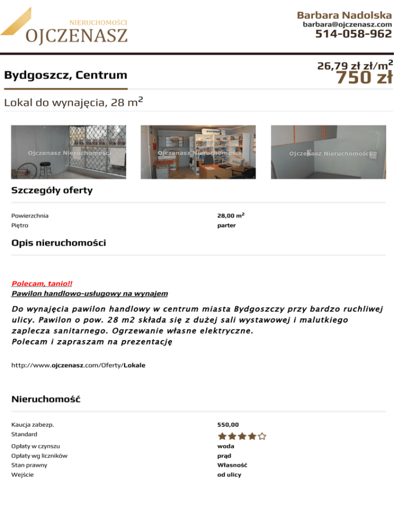 Barbara Nadolska [email protected] 514-058-962 26,79 zł zł/m2 750 zł Bydgoszcz, Centrum Lokal do wynajęcia, 28 m2 Szczegóły oferty Powierzchnia 28,00 m2 Piętro parter Opis nieruchomości Polecam, tanio!! Pawilon handlowo-usługowy na wynajem Do wynajęcia pawilon handlowy w centrum miasta Bydgoszczy przy bardzo ruchliwej ulicy. Pawilon o pow. 28 m2 składa się z dużej sali wystawowej i malutkiego zaplecza sanitarnego. Ogrzewanie własne elektryczne. Polecam i zapraszam na prezentację http://www.ojczenasz.com/Oferty/Lokale Nieruchomość Kaucja zabezp. 550,00 Standard Opłaty w czynszu woda Opłaty wg liczników prąd Stan prawny Własność Wejście od ulicy