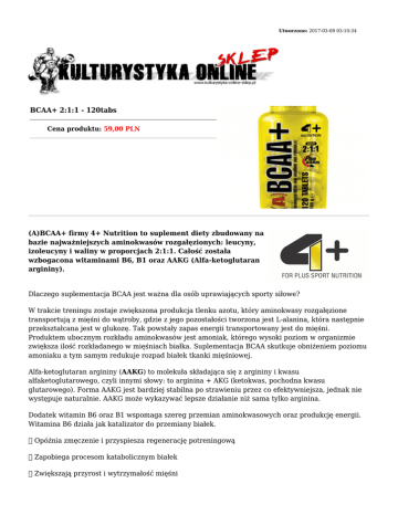 Utworzono: 2017-03-09 03:10:34 BCAA+ 2:1:1 - 120tabs Cena produktu: 59,00 PLN (A)BCAA+ firmy 4+ Nutrition to suplement diety zbudowany na bazie najważniejszych aminokwasów rozgałęzionych: leucyny, izoleucyny i waliny w proporcjach 2:1:1. Całość została wzbogacona witaminami B6, B1 oraz AAKG (Alfa-ketoglutaran argininy). Dlaczego suplementacja BCAA jest ważna dla osób uprawiających sporty siłowe? W trakcie treningu zostaje zwiększona produkcja tlenku azotu, który aminokwasy rozgałęzione transportują z mięśni do wątroby, gdzie z jego pozostałości tworzona jest L-alanina, która następnie przekształcana jest w glukozę. Tak powstały zapas energii transportowany jest do mięśni. Produktem ubocznym rozkładu aminokwasów jest amoniak, którego wysoki poziom w organizmie zwiększa ilość rozkładanego w mięśniach białka. Suplementacja BCAA skutkuje obniżeniem poziomu amoniaku a tym samym redukuje rozpad białek tkanki mięśniowej. Alfa-ketoglutaran argininy (AAKG) to molekuła składająca się z argininy i kwasu alfaketoglutarowego, czyli innymi słowy: to arginina + AKG (ketokwas, pochodna kwasu glutarowego). Forma AAKG jest bardziej stabilna po strawieniu przez co efektywniejsza, jednak nie występuje naturalnie. AAKG może wykazywać lepsze działanie niż sama tylko arginina. Dodatek witamin B6 oraz B1 wspomaga szereg przemian aminokwasowych oraz produkcję energii. Witamina B6 działa jak katalizator do przemiany białek. ✔ Opóźnia zmęczenie i przyspiesza regenerację potreningową ✔ Zapobiega procesom katabolicznym białek ✔ Zwiększają przyrost i wytrzymałość mięśni ✔ Wzbogacenie witaminami z grupy B oraz alfa-ketoglutaranem argininy Składniki: Porcja: 6 tab. Porcji w opakowaniu: 20 Opakowanie: 120 tab. Składnik: w 1 porcji (6 tab) %ZDS L-Leucyna 2,5 g L-Izoleucyna 1,25 g L-Walina 1,25 g AAKG 2,0 g Witamina B6 (chlorowodorek pirydoksyny) 1,5 mg 107% Witamina B1 (chlorowodorek tiaminy) 1,05 mg 95% Substancje pomocnicze: celuloza mikrokrystaliczna - substancja wypełniająca, sole magnezowe kwasów tłuszczowych - substancja przeciwzbrylająca, dwutlenek krzemu -substancja przeciwzbrylająca. Sposób użycia: Zaleca się spożycie 6 kapsułek dziennie. Produkt spożywać przed i po treningu (1/2 porcji) popijając 300 ml wody. Nie zaleca się przekraczania zalecanych dziennych dawek podanych przez producenta. Marka MP Adres: http://www.ko.sklep.pl/ - Telefon: kom. 782 010 880 Email: [email protected]