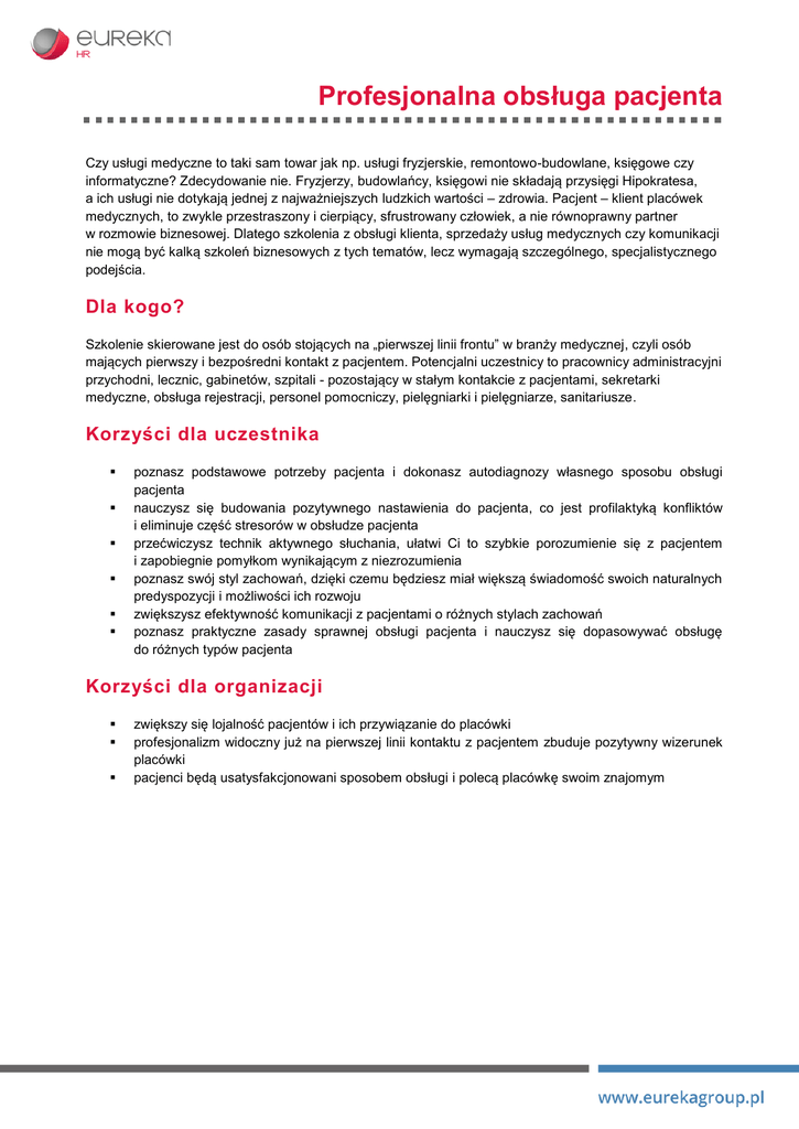 Profesjonalna obsługa pacjenta Czy usługi medyczne to taki sam towar jak np. usługi fryzjerskie, remontowo-budowlane, księgowe czy informatyczne? Zdecydowanie nie. Fryzjerzy, budowlańcy, księgowi nie składają przysięgi Hipokratesa, a ich usługi nie dotykają jednej z najważniejszych ludzkich wartości – zdrowia. Pacjent – klient placówek medycznych, to zwykle przestraszony i cierpiący, sfrustrowany człowiek, a nie równoprawny partner w rozmowie biznesowej. Dlatego szkolenia z obsługi klienta, sprzedaży usług medycznych czy komunikacji nie mogą być kalką szkoleń biznesowych z tych tematów, lecz wymagają szczególnego, specjalistycznego podejścia. Dla kogo? Szkolenie skierowane jest do osób stojących na „pierwszej linii frontu” w branży medycznej, czyli osób mających pierwszy i bezpośredni kontakt z pacjentem. Potencjalni uczestnicy to pracownicy administracyjni przychodni, lecznic, gabinetów, szpitali - pozostający w stałym kontakcie z pacjentami, sekretarki medyczne, obsługa rejestracji, personel pomocniczy, pielęgniarki i pielęgniarze, sanitariusze. Korzyści dla uczestnika poznasz podstawowe potrzeby pacjenta i dokonasz autodiagnozy własnego sposobu obsługi pacjenta nauczysz się budowania pozytywnego nastawienia do pacjenta, co jest profilaktyką konfliktów i eliminuje część stresorów w obsłudze pacjenta przećwiczysz technik aktywnego słuchania, ułatwi Ci to szybkie porozumienie się z pacjentem i zapobiegnie pomyłkom wynikającym z niezrozumienia poznasz swój styl zachowań, dzięki czemu będziesz miał większą świadomość swoich naturalnych predyspozycji i możliwości ich rozwoju zwiększysz efektywność komunikacji z pacjentami o różnych stylach zachowań poznasz praktyczne zasady sprawnej obsługi pacjenta i nauczysz się dopasowywać obsługę do różnych typów pacjenta Korzyści dla organizacji zwiększy się lojalność pacjentów i ich przywiązanie do placówki profesjonalizm widoczny już na pierwszej linii kontaktu z pacjentem zbuduje pozytywny wizerunek placówki pacjenci będą usatysfakcjonowani sposobem obsługi i polecą placówkę swoim znajomym Program szkolenia 1. 2. 3. 4. 5. 6. 7. 8. 9. 10. 11. 12. 13. 14. 15. 16. 17. 18. Czego potrzebuje pacjent - trójkąt satysfakcji pacjenta Co się składa na dobrą obsługę pacjenta? Budowanie pozytywnego nastawienia jako warunek dobrej komunikacji z pacjentem Techniki aktywnego słuchania Asertywność i empatia w rozmowie z pacjentem skrzynka z narzędziami asertywnymi empatia i komunikat empatyczny Style zachowań pacjentów – jak skłonić do współpracy każdego pacjenta? Rozpoznawanie stylów zachowań Sposób komunikacji werbalnej i niewerbalnej Podejmowanie decyzji Potrzeby Typy pacjenta w oparciu o style zachowań Budowanie zaufania Analiza potrzeb i oczekiwań Sposób przekazywania informacji rozmowy bezpośrednie rozmowy telefoniczne Strategia postępowania z różnymi typami pacjentów: pacjent kosztowy, pacjent bólowy, pacjent wystraszony pacjent rezygnujący Jak dopasować swój styl zachowania do typu pacjenta? Pacjent w stresie – kiedy temperament bierze górę Stres związany z obsługą pacjenta – sposoby obniżania jego poziomu Trenerzy Anna Siedlewska lub Mariusz Pawlukiewicz Termin i miejsce Zapytaj o dostępne terminy i miejsca realizacji