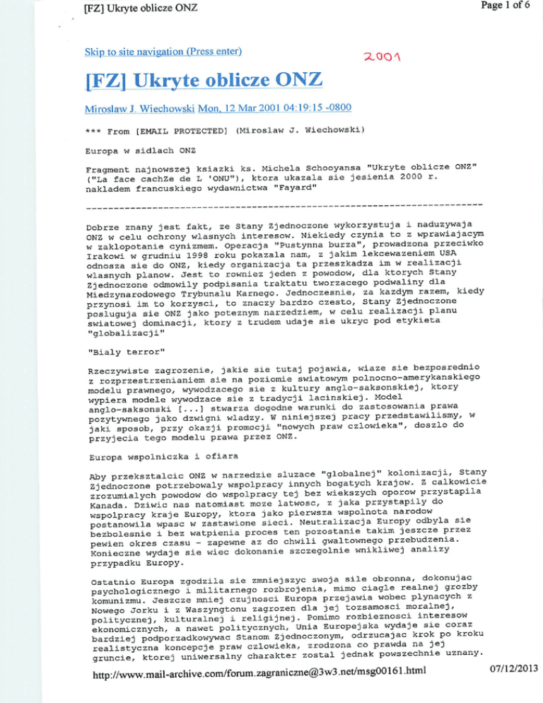 Fragment najnowszej ksiazki ks. Michela Schooyansa "Ukryte oblicze ONZ"