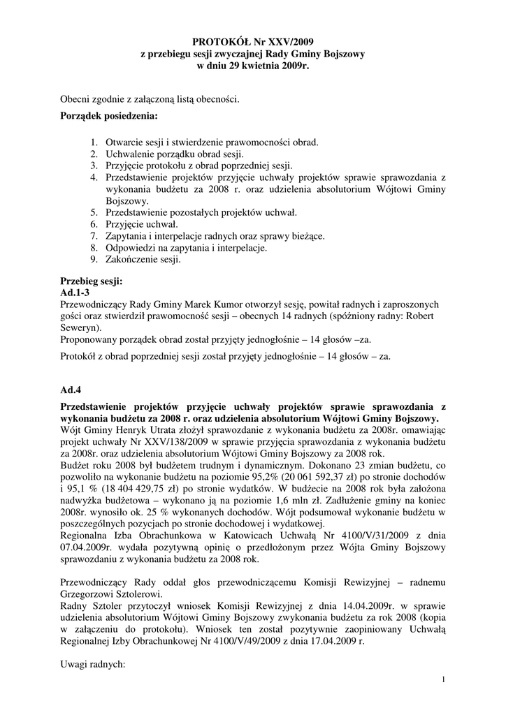 PROTOKÓŁ Nr XXV/2009 z przebiegu sesji zwyczajnej Rady Gminy Bojszowy w dniu 29 kwietnia 2009r. Obecni zgodnie z załączoną listą obecności. Porządek posiedzenia: 1. 2. 3. 4. 5. 6. 7. 8. 9. Otwarcie sesji i stwierdzenie prawomocności obrad. Uchwalenie porządku obrad sesji. Przyjęcie protokołu z obrad poprzedniej sesji. Przedstawienie projektów przyjęcie uchwały projektów sprawie sprawozdania z wykonania budżetu za 2008 r. oraz udzielenia absolutorium Wójtowi Gminy Bojszowy. Przedstawienie pozostałych projektów uchwał. Przyjęcie uchwał. Zapytania i interpelacje radnych oraz sprawy bieżące. Odpowiedzi na zapytania i interpelacje. Zakończenie sesji. Przebieg sesji: Ad.1-3 Przewodniczący Rady Gminy Marek Kumor otworzył sesję, powitał radnych i zaproszonych gości oraz stwierdził prawomocność sesji – obecnych 14 radnych (spóźniony radny: Robert Seweryn). Proponowany porządek obrad został przyjęty jednogłośnie – 14 głosów –za. Protokół z obrad poprzedniej sesji został przyjęty jednogłośnie – 14 głosów – za. Ad.4 Przedstawienie projektów przyjęcie uchwały projektów sprawie sprawozdania z wykonania budżetu za 2008 r. oraz udzielenia absolutorium Wójtowi Gminy Bojszowy. Wójt Gminy Henryk Utrata złożył sprawozdanie z wykonania budżetu za 2008r. omawiając projekt uchwały Nr XXV/138/2009 w sprawie przyjęcia sprawozdania z wykonania budżetu za 2008r. oraz udzielenia absolutorium Wójtowi Gminy Bojszowy za 2008 rok. Budżet roku 2008 był budżetem trudnym i dynamicznym. Dokonano 23 zmian budżetu, co pozwoliło na wykonanie budżetu na poziomie 95,2% (20 061 592,37 zł) po stronie dochodów i 95,1 % (18 404 429,75 zł) po stronie wydatków. W budżecie na 2008 rok była założona nadwyżka budżetowa – wykonano ją na poziomie 1,6 mln zł. Zadłużenie gminy na koniec 2008r. wynosiło ok. 25 % wykonanych dochodów. Wójt podsumował wykonanie budżetu w poszczególnych pozycjach po stronie dochodowej i wydatkowej. Regionalna Izba Obrachunkowa w Katowicach Uchwałą Nr 4100/V/31/2009 z dnia 07.04.2009r. wydała pozytywną opinię o przedłożonym przez Wójta Gminy Bojszowy sprawozdaniu z wykonania budżetu za 2008 rok. Przewodniczący Rady oddał głos przewodniczącemu Komisji Rewizyjnej – radnemu Grzegorzowi Sztolerowi. Radny Sztoler przytoczył wniosek Komisji Rewizyjnej z dnia 14.04.2009r. w sprawie udzielenia absolutorium Wójtowi Gminy Bojszowy zwykonania budżetu za rok 2008 (kopia w załączeniu do protokołu). Wniosek ten został pozytywnie zaopiniowany Uchwałą Regionalnej Izby Obrachunkowej Nr 4100/V/49/2009 z dnia 17.04.2009 r. Uwagi radnych: 1 Radny Andrzej Knopek: wyraził wątpliwość, co do pełni korzystania z uprawnień kontrolnych radnych. Radny Grzegorz Tomala: zwrócił uwagę na duże kwoty pochłaniane przez Urząd Gminy oraz na nieprecyzyjne sprawozdanie GTS Bojszowy z wydatkowania środków przekazanych przez Gminę. Poprosił o wyjaśnienie pozycji „Różne opłaty i składki” dotyczącą Gimnazjum oraz pozycji dotyczącej zwrotu dotacji niewykorzystanych. Skarbnik: w paragrafie „Różne opłaty i składki” zawarte są wszelkiego rodzaju ubezpieczenia. Inne jednostki wydatki te klasyfikują w paragrafie 4300. Zwrot dotacji dotyczy PFRON-u; w przypadku, gdy nie wszyscy uczestnicy rozliczą się z zakupów, należy zwrócić niewykorzystaną dotację. Radny Tomala: zapytał, jakie są przyczyny wysokich odsetek płaconych przez Gminę. Skarbnik: w związku z ubiegłorocznym wzrostem stóp procentowych, odsetki także wzrosły, ale w tej chwili mają one tendencję spadkową. Radny Tomala: zwrócił uwagę na wysokie rachunki telefoniczne Urzędu i jednostek organizacyjnych. Wójt: koszty te są kontrolowane. W przypadku telefonii komórkowej wydatki wzrosły, ale jest to związane ze wzrostem cen usług oraz uruchomionym przez Urząd serwisem „smsowym”. W przypadku telefonii stacjonarnej – wydatki zmalały w stosunku do roku poprzedniego. Radny Robert Seweryn: z czego wynika różnica w planie i wykonaniu wydatków w rozdziale 60004 paragraf 4300 (komunikacja lokalna)? Wójt: jest to związane z przechodzeniem grudniowych zobowiązań na styczeń danego roku budżetowego, np. faktura PKS wystawiona w grudniu 2007r., a płatność wymagalna jest w styczniu 2008r. Przyjęcie uchwały: W głosowaniu wzięło udział 15 radnych (obecny Robert Seweryn) Uchwała Nr XXV/138/2009 w sprawie przyjęcia sprawozdania z wykonania budżetu za 2008r. oraz udzielenia absolutorium Wójtowi Gminy Bojszowy za 2008 rok 15 głosów – za 0 głosów – przeciw 0 głosów wstrzymujących się. Przewodniczący Rady Gminy pogratulował Wójtowi oraz Skarbnikowi Gminy Bojszowy – Pani Elżbiecie Kubeczko. Ad. 5 Przedstawienie pozostałych projektów uchwał. Wójt przedstawił projekt uchwały Nr XXV/139/2009 w sprawie zmian w budżecie na 2009r. W związku ze złożonymi wnioskami jednostek oświatowych (SP Świerczyniec, Gminne Gimnazjum) o zwiększenie planów wydatków rachunków dochodów własnych, którego źródłem są salda środków obrotowych z 2008r., zachodzi konieczność podjęcia niniejszej uchwały Rady Gminy w sprawie zmian w budżecie na 2009r. 2 Uruchomienie środków pozostałych z 2008r. pozwoli na ich racjonalne wykorzystanie na potrzeby szkół w roku bieżącym. Bez uwag. Projekt uchwały Nr XXV/140/2009 w sprawie udzielenia pełnomocnictwa Wójtowi Gminy Bojszowy do złożenia oświadczenia woli w zakresie umowy pod nazwą „Pierwszy krok do lepszego jutra” zgodnej z wnioskiem złożonym w Wojewódzkim Urzędzie Pracy w Katowicach w ramach konkursu – Priorytet VI, działanie 6.3 Programu Operacyjnego Kapitał Ludzki został omówiony przez Wójta Gminy. Uchwała jest niezbędna dla zawarcia umowy, stanowiącej wynik pozytywnego zaopiniowania wniosku złożonego w ramach konkursu „Pierwszy krok do lepszego jutra”, w związku, z którym przyznana została dotacja pienięż