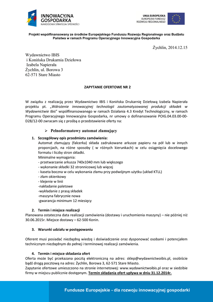 Projekt współfinansowany ze środków Europejskiego Funduszu Rozwoju Regionalnego oraz Budżetu Państwa w ramach Programu Operacyjnego Innowacyjna Gospodarka Żychlin, 2014.12.15 Wydawnictwo IBIS i Konińska Drukarnia Dziełowa Izabela Napierała Żychlin, ul. Borowa 3 62-571 Stare Miasto ZAPYTANIE OFERTOWE NR 2 W związku z realizacją przez Wydawnictwo IBIS i Konińska Drukarnię Dziełową Izabela Napierała projektu pt. „Wdrożenie innowacyjnej technologii zautomatyzowanej produkcji składek w Wydawnictwie Ibis” współfinansowanego w ramach Działania 4.3 Kredyt Technologiczny, w ramach Programu Operacyjnego Innowacyjna Gospodarka, nr umowy o dofinansowanie POIG.04.03.00-00D28/12-00 zwracam się z prośbą o przedstawienie oferty na: Pełnoformatowy automat złamujący 1. Szczegółowy opis przedmiotu zamówienia: Automat złamujący (falcerka) składa zadrukowane arkusze papieru na pół lub w innych proporcjach, na różne sposoby ( w różnych kierunkach) w celu osiągnięcia docelowego formatu i liczby stron składki. Minimalne wymagania: - przetwarzanie arkusza 740x1040 mm lub większego - wykonanie składki 32 stronnicowej lub więcej - kaseta boczna w celu wykonania złamu przy podwójnym użytku (układ KTLL) - złam okienkowy - klejenie w linii -nakładanie paletowe -wykładanie z prasą składek -maszyna fabrycznie nowa -gwarancja minimum 12 miesięcy 2. Termin i miejsce realizacji Planowana ostateczna data realizacji zamówienia (dostawy i uruchomienia maszyny) – nie później niż 30.06.2015r. Miejsce dostawy – 62-500 Konin. 3. Warunki udziału w postępowaniu Oferent musi posiadać niezbędną wiedzę i doświadczenie oraz dysponować osobami i potencjałem technicznym niezbędnym do pełnej i terminowej realizacji zamówienia. 4. Termin i miejsce składania ofert Oferta może być przekazana pocztą elektroniczną na adres: [email protected], osobiście bądź drogą pocztową na adres: Żychlin, Borowa 3, 62-571 Stare Miasto. Zapytanie ofertowe umieszczono na stronie internetowej: www.wydawnictwoibis.pl oraz w siedzibie firmy w miejscu publicznie dostępnym. Termin składania ofert upływa w dniu 31.12.2014r. Fundusze Europejskie - dla rozwoju innowacyjnej gospodarki Projekt współfinansowany ze środków Europejskiego Funduszu Rozwoju Regionalnego oraz Budżetu Państwa w ramach Programu Operacyjnego Innowacyjna Gospodarka 5. Oczekiwany zakres oferty Oferta powinna zawierać: pełną nazwę oferenta, adres lub siedzibę oferenta, numer telefonu oraz numer NIP cenę oferty przedstawionej (cenę netto oraz brutto) termin ważności, planowany termin wykonania, datę sporządzenia oferty czytelny podpis 6. Kryteria wyboru oferty Zamawiający udzieli zamówienia w oparciu o najbardziej korzystną ekonomicznie zachowaniem zasad uczciwej konkurencji, efektywności, jawności i przejrzystości. zamawiający dołoży wszelkich starań w celu uniknięcia konfliktu interesów rozumianego bezstronności i obiektywności w stosunku do oferentów. Za najkorzystniejszą ekonomicznie ofertę zamawiający uzna ofertę z największą ilością Kryterium wyboru najkorzystniejszej oferty jest cena. Wybór najkorzystniejszej oferty nastąpi w oparciu o następujące kryteria: Cena (ocena dokonywana będzie według poniższego wzoru) – waga 100% ofertę z Ponadto jako brak punktów. 7. Inne a) Oferta powinna być ważna do dnia: 15.02.2015 r. b) Oferta musi obejmować całość zamówienia. Zamawiający nie przewiduje możliwości składania ofert częściowych. c) W toku badania i oceny ofert zamawiający może wnioskować o udzielenie wszelkich wyjaśnień i dodatkowych informacji dotyczących treści złożonych ofert. d) Oferent ponosi wszelkie koszty złożenia i przygotowania oferty. Dodatkowych informacji udziela Pani Agnieszka Więckowska [email protected] lub pod numerem telefonu: 63 240 77 90 pod adresem email: Do zapytania ofertowego dołączony został formularz ofertowy (załącznik nr 1), na którym rekomendowane jest składanie ofert. Z poważaniem, Izabela Napierała Fundusze Europejskie - dla rozwoju innowacyjnej gospodarki