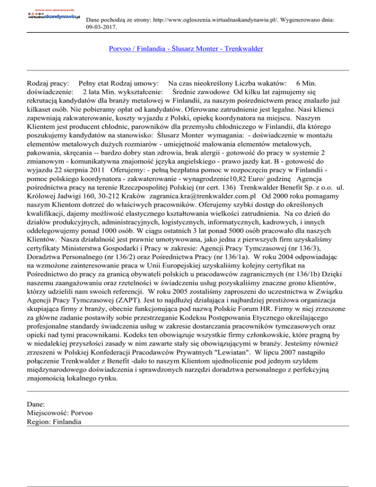Dane pochodzą ze strony: http://www.ogloszenia.wirtualnaskandynawia.pl/. Wygenerowano dnia: 09-03-2017. Porvoo / Finlandia - Ślusarz Monter - Trenkwalder Rodzaj pracy: Pełny etat Rodzaj umowy: Na czas nieokreślony Liczba wakatów: 6 Min. doświadczenie: 2 lata Min. wykształcenie: Średnie zawodowe Od kilku lat zajmujemy się rekrutacją kandydatów dla branży metalowej w Finlandii, za naszym pośrednictwem pracę znalazło już kilkaset osób. Nie pobieramy opłat od kandydatów. Oferowane zatrudnienie jest legalne. Nasi klienci zapewniają zakwaterowanie, koszty wyjazdu z Polski, opiekę koordynatora na miejscu. Naszym Klientem jest producent chłodnic, parowników dla przemysłu chłodniczego w Finlandii, dla którego poszukujemy kandydatów na stanowisko: Ślusarz Monter wymagania: - doświadczenie w montażu elementów metalowych dużych rozmiarów - umiejętność malowania elementów metalowych, pakowania, skręcania -- bardzo dobry stan zdrowia, brak alergii - gotowość do pracy w systemie 2 zmianowym - komunikatywna znajomość języka angielskiego - prawo jazdy kat. B - gotowość do wyjazdu 22 sierpnia 2011 Oferujemy: - pełną bezpłatna pomoc w rozpoczęciu pracy w Finlandii pomoc polskiego koordynatora - zakwaterowanie - wynagrodzenie10,82 Euro/ godzinę Agencja pośrednictwa pracy na terenie Rzeczpospolitej Polskiej (nr cert. 136) Trenkwalder Benefit Sp. z o.o. ul. Królowej Jadwigi 160, 30-212 Kraków [email protected] Od 2000 roku pomagamy naszym Klientom dotrzeć do właściwych pracowników. Oferujemy szybki dostęp do określonych kwalifikacji, dajemy możliwość elastycznego kształtowania wielkości zatrudnienia. Na co dzień do działów produkcyjnych, administracyjnych, logistycznych, informatycznych, kadrowych, i innych oddelegowujemy ponad 1000 osób. W ciągu ostatnich 3 lat ponad 5000 osób pracowało dla naszych Klientów. Nasza działalność jest prawnie umotywowana, jako jedna z pierwszych firm uzyskaliśmy certyfikaty Ministerstwa Gospodarki i Pracy w zakresie: Agencji Pracy Tymczasowej (nr 136/3), Doradztwa Personalnego (nr 136/2) oraz Pośrednictwa Pracy (nr 136/1a). W roku 2004 odpowiadając na wzmożone zainteresowanie praca w Unii Europejskiej uzyskaliśmy kolejny certyfikat na Pośrednictwo do pracy za granicą obywateli polskich u pracodawców zagranicznych (nr 136/1b) Dzięki naszemu zaangażowaniu oraz rzetelności w świadczeniu usług pozyskaliśmy znaczne grono klientów, którzy udzielili nam swoich referencji. W roku 2005 zostaliśmy zaproszeni do uczestnictwa w Związku Agencji Pracy Tymczasowej (ZAPT). Jest to najdłużej działająca i najbardziej prestiżowa organizacja skupiająca firmy z branży, obecnie funkcjonująca pod nazwą Polskie Forum HR. Firmy w niej zrzeszone za główne zadanie postawiły sobie przestrzeganie Kodeksu Postępowania Etycznego określającego profesjonalne standardy świadczenia usług w zakresie dostarczania pracowników tymczasowych oraz opieki nad tymi pracownikami. Kodeks ten obowiązuje wszystkie firmy członkowskie, które pragną by w niedalekiej przyszłości zasady w nim zawarte stały się obowiązującymi w branży. Jesteśmy również zrzeszeni w Polskiej Konfederacji Pracodawców Prywatnych "Lewiatan". W lipcu 2007 nastąpiło połączenie Trenkwalder z Benefit -dało to naszym Klientom ujednolicenie pod jednym szyldem międzynarodowego doświadczenia i sprawdzonych narzędzi doradztwa personalnego z perfekcyjną znajomością lokalnego rynku. Dane: Miejscowość: Porvoo Region: Finlandia