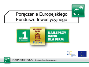 Poręczenie Europejskiego Funduszu Inwestycyjnego BNP Paribas BNP Paribas - Europejski lider na światową skalę: 84 kraje 21 mln Klientów indywidualnych 200 tys. Klientów korporacyjnych BNP Paribas w Polsce – Bank uniwersalny 334 tys. klientów indywidualnych 28 tys. MŚP, mikrofirmy, profesjonaliści 2 700 klientów korporacyjnych Bogata oferta dla firm oparta o fundusze unijne Współpraca z instytucjami europejskimi Oddziały detaliczne Business Centres Pozostałe spółki BNP Paribas działające w Polsce: ff 2 Współpraca z instytucjami europejskimi Poręczenie Europejskiego Funduszu Inwestycyjnego Okres dostępności: do 01.10.2011 do 30.09.2013 Zakres: kredyty nieodnawialne Poręczenie dla MŚP Charakterystyka poręczeń EFI Główne parametry poręczenia: Poręczenie pokrywa 50% strat (kapitał i odsetki) Okres ważności poręczenia – 10 lat od dnia zawarcia umowy kredytowej Stanowi dodatkowe zabezpieczenie Odbiorcy: MŚP (wg def. UE) Zakres poręczenia EFI – 5 Produktów Kredytowych Poręczenie Europejskiego Funduszu Inwestycyjnego obejmie portfel kredytów nieodnawialnych które zostaną udzielone MŚP w okresie 24 miesięcy, począwszy od Października 2011 roku. Produkty kredytowe objęte poręczeniem: Kredyt Inwestycyjny z funduszy EBI Kredyt Inwestycyjny Kredyt Hipoteczny Obrotowy Nieodnawialny (pod kontrakt) Skala korzyści dla MŚP BEZPŁATNE ZABEZPIECZENIE ZERO KOSZTÓW DLA MŚP WYŻSZA KWOTA KREDYTU LTV MAX 90% NIŻSZA CENA KREDYTU PREMIA EFI & EBI MOŻLIWOŚĆ POŁĄCZENIA PORĘCZENIE EFI ZE ŚRODKAMI EBI UŁATWIONY DOSTĘP DO FINANSOWANIA Budowa salonu samochodowego Inwestycja finansowana w ramach środków z EBOR oraz EBI z poręczeniem EFI Przedsiębiorstwo 1. Obniżony koszt kredytu (Zastosowanie premii EBI oraz EFI) 2. Premia inwestycyjna – zwrot 10% wartości kredytu energooszczędnego Rodzaj działalności sprzedaż i serwis samochodów Cele projektu oraz główne inwestycje 1. Rozszerzenie działalności gospodarczej Cele projektu 2. minimalizowanie kosztów energii wykorzystywanej do ogrzewania budynku Główne inwestycje Budowa salonu samochodowego Wielkość inwestycji 7.800.000,- PLN 2.100.000,-PLN - Kredyt Inwestycyjny EBI Wartość kredytu 900.000,-PLN - Kredyt Energooszczędny Przewidziane korzyści Przewidywane rezultaty projektu/Korzyści 1. Rozszerzenie działalności związanej ze sprzedażą i serwisem samochodów osobowych 2. Premia Inwestycyjna – 10% kwoty Kredytu Energooszczędnego 3. Obniżony koszt kredytu dla części projektu finansowanej ze środków EBI z poręczeniem EFI Dziękuję za uwagę! Kontakt: [email protected],