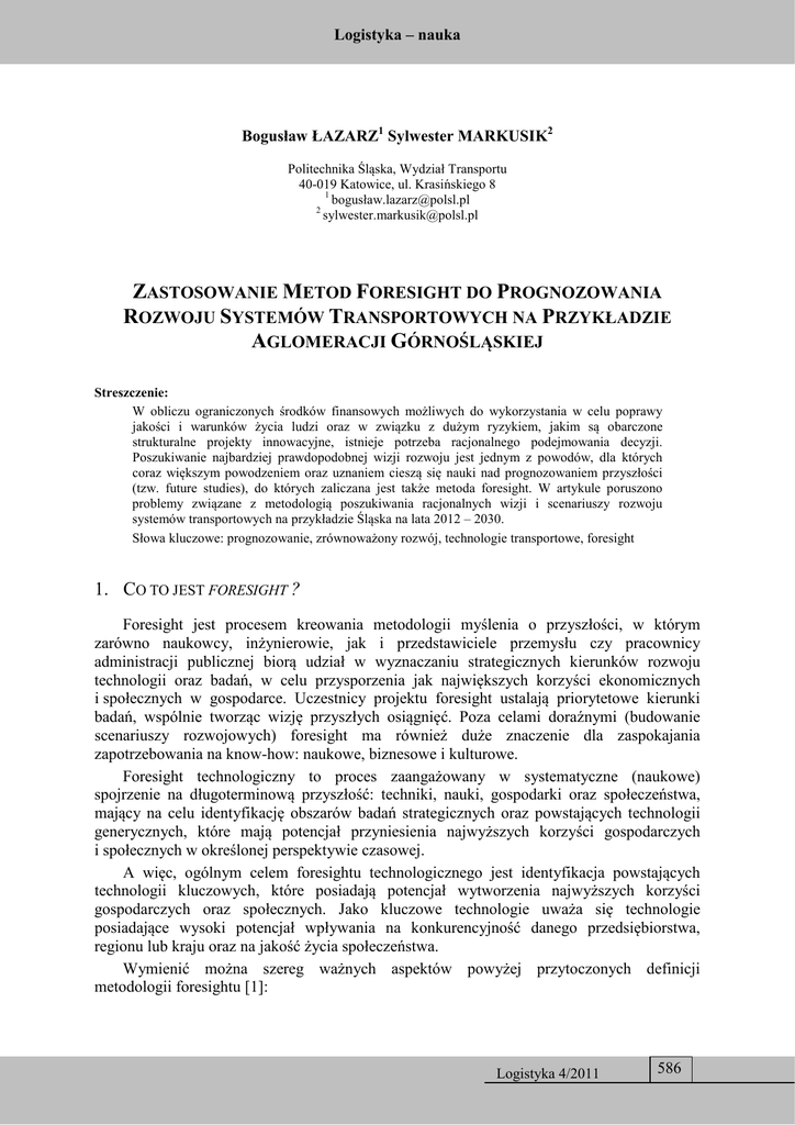 Logistyka – nauka Bogusław ŁAZARZ1 Sylwester MARKUSIK2 Politechnika Śląska, Wydział Transportu 40-019 Katowice, ul. Krasińskiego 8 1 bogusł[email protected] 2 [email protected] ZASTOSOWANIE METOD FORESIGHT DO PROGNOZOWANIA ROZWOJU SYSTEMÓW TRANSPORTOWYCH NA PRZYKŁADZIE AGLOMERACJI GÓRNOŚLĄSKIEJ Streszczenie: W obliczu ograniczonych środków finansowych możliwych do wykorzystania w celu poprawy jakości i warunków życia ludzi oraz w związku z dużym ryzykiem, jakim są obarczone strukturalne projekty innowacyjne, istnieje potrzeba racjonalnego podejmowania decyzji. Poszukiwanie najbardziej prawdopodobnej wizji rozwoju jest jednym z powodów, dla których coraz większym powodzeniem oraz uznaniem cieszą się nauki nad prognozowaniem przyszłości (tzw. future studies), do których zaliczana jest także metoda foresight. W artykule poruszono problemy związane z metodologią poszukiwania racjonalnych wizji i scenariuszy rozwoju systemów transportowych na przykładzie Śląska na lata 2012 – 2030. Słowa kluczowe: prognozowanie, zrównoważony rozwój, technologie transportowe, foresight 1. CO TO JEST FORESIGHT ? Foresight jest procesem kreowania metodologii myślenia o przyszłości, w którym zarówno naukowcy, inżynierowie, jak i przedstawiciele przemysłu czy pracownicy administracji publicznej biorą udział w wyznaczaniu strategicznych kierunków rozwoju technologii oraz badań, w celu przysporzenia jak największych korzyści ekonomicznych i społecznych w gospodarce. Uczestnicy projektu foresight ustalają priorytetowe kierunki badań, wspólnie tworząc wizję przyszłych osiągnięć. Poza celami doraźnymi (budowanie scenariuszy rozwojowych) foresight ma również duże znaczenie dla zaspokajania zapotrzebowania na know-how: naukowe, biznesowe i kulturowe. Foresight technologiczny to proces zaangażowany w systematyczne (naukowe) spojrzenie na długoterminową przyszłość: techniki, nauki, gospodarki oraz społeczeństwa, mający na celu identyfikację obszarów badań strategicznych oraz powstających technologii generycznych, które mają potencjał przyniesienia najwyższych korzyści gospodarczych i społecznych w określonej perspektywie czasowej. A więc, ogólnym celem foresightu technologicznego jest identyfikacja powstających technologii kluczowych, które posiadają potencjał wytworzenia najwyższych korzyści gospodarczych oraz społecznych. Jako kluczowe technologie uważa się technologie posiadające wysoki potencjał wpływania na konkurencyjność danego przedsiębiorstwa, regionu lub kraju oraz na jakość życia społeczeństwa. Wymienić można szereg ważnych aspektów powyżej przytoczonych definicji metodologii foresightu [1]: Logistyka 4/2011 586 Logistyka – nauka • jako próby spojrzenia na przyszłość muszą być one systematyczne, aby nazwać je „foresight”; • foresight musi odnosić się do dłuższego okresu, który zazwyczaj postrzega się jako dłuższy od normalnego horyzontu planowania. Horyzonty czasowe foresightu tym samym wynoszą od 5 do 30 lat. Horyzont czasowy foresightu jest zawsze daleko poza zainteresowaniami decydentów (zarówno w administracji publicznej, jak i w życiu politycznym). Dotyczy to w szczególności foresightów związanych z problematyką rozwoju transportu, gdzie wszelkie działania inwestycyjne wymagają długiego okresu czasu, znacznie wybiegającego poza okres jednej kadencji polityka lub samorządowca; • postęp nauki/technologii powinien być zbalansowany zapotrzebowaniem rynku. Foresight technologiczny nie powinien być jednak zdominowany wyłącznie przez naukę i technologię. Należy poświęcić uwagę także czynnikom społeczno-gospodarczym, które również wpływają na kształtowanie innowacji technicznych; • foresight skupia się na powstających technologiach generycznych, gdzie istnieje prawna podstawa do wsparcia rządowego. Jest to spowodowane faktem, iż przedsiębiorstwa są często niechętne do finansowania badań strategicznych, które wspierają powstające nowe technologie generyczne. Powyższe aspekty były często modyfikowane definicjami foresightu kładącymi większy nacisk na budowanie systemu oraz korzyści wynikające z tego procesu. Programy foresight obejmują, więc pięć kluczowych elementów [1]: • strukturalne przewidywanie długoterminowych: społecznych, gospodarczych oraz technologicznych postępów oraz potrzeb, • interaktywne metody badawcze, analizy oraz badania, zawierające szeroki zakres stron zainteresowanych, które są charakterystyczne dla foresightu (w przeciwieństwie do wielu tradycyjnych badań przyszłości, które są raczej zarezerwowane dla ekspertów), • interaktywne podejście obejmuje tworzenie nowych sieci społecznych. Nacisk na rolę tworzenia sieci rożni się w zależności od typu programu foresight, • formalne produkty foresightu wykraczają poza prezentację scenariuszy oraz przygotowywanie ogólnych planów rozwojowych, • wspólna wizja rozwojowa nie może być utopijna, ponieważ musi być stworzone wyraźne uznanie oraz wyjaśnienie implikacji dla „dzisiejszych decyzji oraz przyszłych działań”. Należy zauważyć, iż foresight nie zastępuje prognozowania, badań nad przyszłością czy planowania strategicznego. Każde z tych działań ma swoją rolę. Wielu przypadkach role tych działań mogą się wzajemnie wspierać. Pogląd, że „nie można przewidzieć przyszłości”, wynika z niezrozumienia idei foresightu, który nie ma na celu przewidywania przyszłości. Foresight dotyczy głównie uprzedzania różnych możliwych wariantów przyszłości. Skupia się także na tworzeniu pożądanej wizji przyszłości przez propozycje działań podejmowanych aktualnie. Programy typu Foresight umożliwiają, więc i są pomocne w tworzeniu planów zrównoważonego rozwoju danych regionów. Termin „zrównoważony rozwój transportu” został zdefiniowany w 1987 roku (w Raporcie Światow