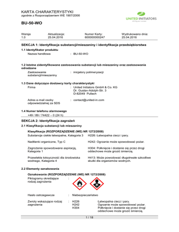 KARTA CHARAKTERYSTYKI zgodnie z Rozporządzeniem WE 1907/2006 BU-50-WO Wersja 1.0 Aktualizacja: 25.04.2016 Numer Karty: 600000000247 Wydrukowano dnia: 25.04.2016 SEKCJA 1: Identyfikacja substancji/mieszaniny i identyfikacja przedsiębiorstwa 1.1 Identyfikator produktu Nazwa handlowa : BU-50-WO 1.2 Istotne zidentyfikowane zastosowania substancji lub mieszaniny oraz zastosowania odradzane Zastosowanie : inicjatory polimeryzacji substancji/mieszaniny 1.3 Dane dotyczące dostawcy karty charakterystyki Firma : United Initiators GmbH & Co. KG Dr. Gustav-Adolph-Str. 3 D-82049 Pullach Adres e-mail osoby odpowiedzialnej za SDS : [email protected] 1.4 Numer telefonu alarmowego +49 / 89 / 74422 – 0 (24 h) SEKCJA 2: Identyfikacja zagrożeń 2.1 Klasyfikacja substancji lub mieszaniny Klasyfikacja (ROZPORZĄDZENIE (WE) NR 1272/2008) Substancje ciekłe łatwopalne, Kategoria 3 H226: Łatwopalna ciecz i pary. Nadtlenki organiczne, Typ C H242: Ogrzanie może spowodować pożar. Zagrożenie spowodowane aspiracją, Kategoria 1 H304: Połknięcie i dostanie się przez drogi oddechowe może grozić śmiercią. Przewlekła toksyczność dla środowiska wodnego, Kategoria 4 H413: Może powodować długotrwałe szkodliwe skutki dla organizmów wodnych. 2.2 Elementy oznakowania Oznakowanie (ROZPORZĄDZENIE (WE) NR 1272/2008) Piktogramy określające : rodzaj zagrożenia Hasło ostrzegawcze : Niebezpieczeństwo Zwroty wskazujące rodzaj zagrożenia : H226 H242 H304 Łatwopalna ciecz i pary. Ogrzanie może spowodować pożar. Połknięcie i dostanie się przez drogi oddechowe może grozić śmiercią. 1 / 18 KARTA CHARAKTERYSTYKI zgodnie z Rozporządzeniem WE 1907/2006 BU-50-WO Wersja 1.0 Aktualizacja: 25.04.2016 Numer Karty: 600000000247 Może powodować długotrwałe szkodliwe skutki dla organizmów wodnych. H413 Zwroty wskazujące środki ostrożności : Wydrukowano dnia: 25.04.2016 Zapobieganie: P210 P220 P233 P235 P273 P280 Reagowanie: P301 + P310 Przechowywać z dala od źródeł ciepła, gorących powierzchni, iskrzenia, otwartego ognia i innych źródeł zapłonu. Palenie wzbronione. Trzymać/przechowywać z dala od odzieży/ kwasów, zasad, soli metali ciężkich i substancji redukujących /materiałów zapalnych. Przechowywać pojemnik szczelnie zamknięty. Przechowywać w chłodnym miejscu. Unikać uwolnienia do środowiska. Stosować rękawice ochronne/ odzież ochronną/ ochronę oczu/ ochronę twarzy. W PRZYPADKU POŁKNIĘCIA: Natychmiast skontaktować się z OŚRODKIEM ZATRUĆ lub z lekarzem. NIE wywoływać wymiotów. P331 Magazynowanie: P403 + P235 Przechowywać w dobrze wentylowanym miejscu. Przechowywać w chłodnym miejscu. Usuwanie: P501 Zawartość/ pojemnik usuwać do autoryzowanego zakładu utylizacji odpadów. Niebezpieczne składniki muszą być wymienione na etykiecie: Biały olej mineralny (ropa naftowa) (Nr CAS 8042-47-5) 2.3 Inne zagrożenia Ta substancja/mieszanina nie zawiera składników uważanych albo za trwałe, podlegające bioakumulacji i toksyczne, albo bardzo trwałe i podlegające bardzo silnej bioakumulacji (vPvB) na poziomie 0,1% bądź powyżej. Pary mogą tworzyć z powietrzem mieszaninę wybuchową. SEKCJA 3: Skład/informacja o składnikach 3.2 Mieszaniny Typ związku : Nadtlenek organiczny Mieszanina w postaci ciekłej Składniki niebezpieczne Nazwa Chemiczna Nr CAS Nr WE Numer rejestracji 2 / 18 Klasyfikacja Stężenie (% w/w) KARTA CHARAKTERYSTYKI zgodnie z Rozporządzeniem WE 1907/2006 BU-50-WO Wersja 1.0 Aktualizacja: 25.04.2016 Numer Karty: 600000000247 Wydrukowano dnia: 25.04.2016 Biały olej mineralny (ropa naftowa) 8042-47-5 232-455-8 01-2119487078-27 Acute Tox. 4; H332 Asp. Tox. 1; H304 >= 50 - < 55 Dinadtlenek di-tert-butylu secbutylidenu 2167-23-9 218-507-2 Org. Perox. C; H242 Aquatic Chronic 4; H413 >= 45 - < 50 Wyjaśnienia skrótów znajdują się w sekcji 16. SEKCJA 4: Środki pierwszej pomocy 4.1 Opis środków pierwszej pomocy Porady ogólne : Usunąć z zagrożonej strefy. Zasięgnąć porady medycznej. Przedstawić lekarzowi dołączoną Kartę Charakterystyki Substancji Niebezpiecznej. Nie pozostawiać osoby poszkodowanej bez opieki. Objawy mogą się pojawić dopiero w kilka godzin po zatruciu. Zabezpieczenie dla udzielającego pierwszej pomocy : Osoby udzielające pierwszej pomocy powinny zwracać uwagę na własną ochronę osobistą i nosić odzież ochronną W przypadku wdychania : Natychmiast wezwać lekarza lub powiadomić centrum zatruć. Osobie nieprzytomnej zapewnić wygodną pozycję i zasięgnąć porady medycznej. Zachować drożność dróg oddechowych. Jeżeli osoba poszkodowana oddycha, przenieść na świeże powietrze. W przypadku kontaktu ze skórą : W razie kontaktu, niezwłocznie spłukiwać skórę dużą ilością wody przez co najmniej 15 minut przy zdjętym zanieczyszczonym ubraniu i obuwiu. Uprać skażone ubranie przed ponownym użyciem. W przypadku zanieczyszczenia skóry - dobrze spłukać wodą. W przypadku zanieczyszczenia ubrania - zdjąć ubranie. Jeśli objawy utrzymują się, wezwać lekarza. W przypadku kontaktu z oczami : W przypadku kontaktu produktu z oczami niezwłocznie przemyć je dużą ilością wody i zasięgnąć pomocy lekarskiej. Usunąć szkła (szkło) kontaktowe. Zabezpieczyć nieuszkodzone oko. W trakcie przemywania należy szeroko otwierać oczy. Jeśli podrażnienie oczu utrzymuje się, skonsultować się ze specjalistą. W przypadku połknięcia : Zachować drożność dróg oddechowych. 4.2 Najważniejsze ostre i opóźnione objawy oraz skutki narażenia Zagrożenia : Połknięcie i dostanie się przez drogi oddechowe może grozić śmiercią. 3 / 18 KARTA CHARAKTERYSTYKI zgodnie z Rozporządzeniem WE 1907/2006 BU-50-WO Wersja 1.0 Aktualizacja: 25.04.2016 Numer Karty: 600000000247 Wydrukowano dnia: 25.04.2016 4.3 Wskazania dotyczące wszelkiej natychmiastowej pomocy lekarskiej i szczególnego postępowania z poszkodowanym Leczenie : Leczyć symptomatycznie i wspomagająco. SEKCJA 5: Postę