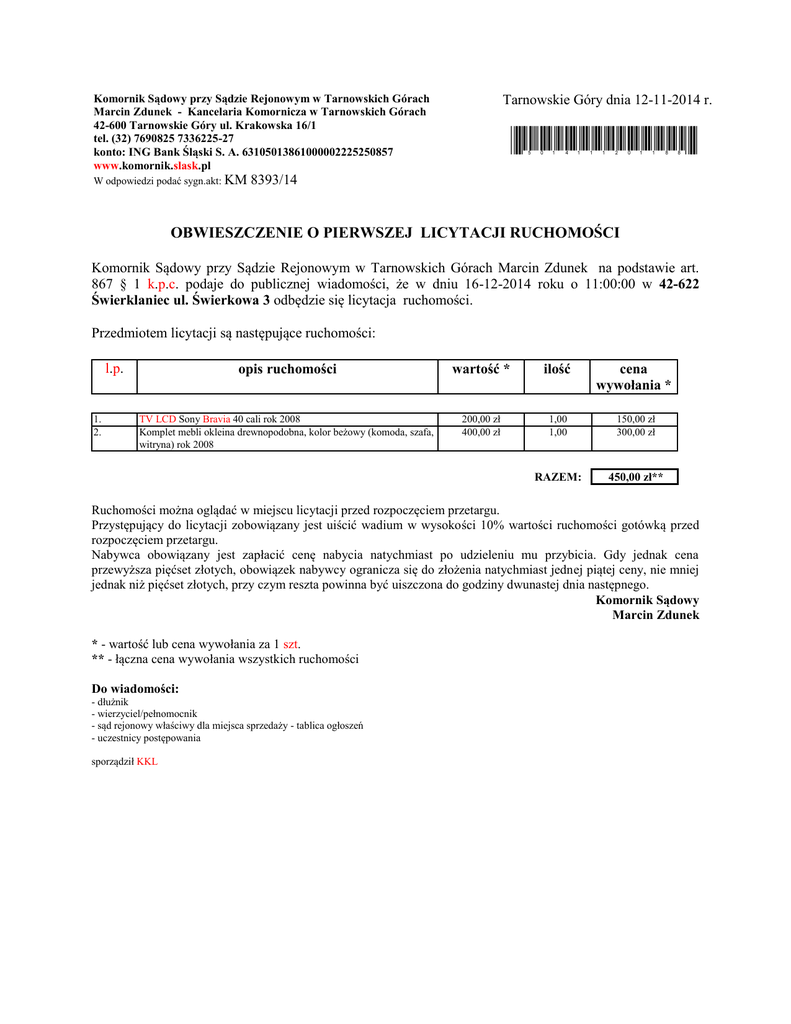 Tarnowskie Góry dnia 12-11-2014 r. Komornik Sądowy przy Sądzie Rejonowym w Tarnowskich Górach Marcin Zdunek - Kancelaria Komornicza w Tarnowskich Górach 42-600 Tarnowskie Góry ul. Krakowska 16/1 tel. (32) 7690825 7336225-27 konto: ING Bank Śląski S. A. 63105013861000002225250857 www.komornik.slask.pl W odpowiedzi podać sygn.akt: KM *5014111201188* 8393/14 OBWIESZCZENIE O PIERWSZEJ LICYTACJI RUCHOMOŚCI Komornik Sądowy przy Sądzie Rejonowym w Tarnowskich Górach Marcin Zdunek na podstawie art. 867 § 1 k.p.c. podaje do publicznej wiadomości, że w dniu 16-12-2014 roku o 11:00:00 w 42-622 Świerklaniec ul. Świerkowa 3 odbędzie się licytacja ruchomości. Przedmiotem licytacji są następujące ruchomości: opis ruchomości wartość * ilość cena wywołania * TV LCD Sony Bravia 40 cali rok 2008 Komplet mebli okleina drewnopodobna, kolor beżowy (komoda, szafa, witryna) rok 2008 200,00 zł 400,00 zł 1,00 1,00 150,00 zł 300,00 zł RAZEM: 450,00 zł** l.p. 1. 2. Ruchomości można oglądać w miejscu licytacji przed rozpoczęciem przetargu. Przystępujący do licytacji zobowiązany jest uiścić wadium w wysokości 10% wartości ruchomości gotówką przed rozpoczęciem przetargu. Nabywca obowiązany jest zapłacić cenę nabycia natychmiast po udzieleniu mu przybicia. Gdy jednak cena przewyższa pięćset złotych, obowiązek nabywcy ogranicza się do złożenia natychmiast jednej piątej ceny, nie mniej jednak niż pięćset złotych, przy czym reszta powinna być uiszczona do godziny dwunastej dnia następnego. Komornik Sądowy Marcin Zdunek * - wartość lub cena wywołania za 1 szt. ** - łączna cena wywołania wszystkich ruchomości Do wiadomości: - dłużnik - wierzyciel/pełnomocnik - sąd rejonowy właściwy dla miejsca sprzedaży - tablica ogłoszeń - uczestnicy postępowania sporządził KKL