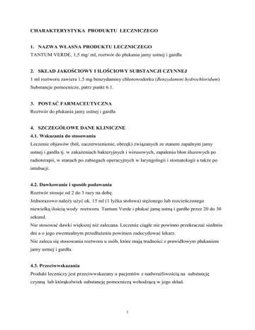 CHARAKTERYSTYKA PRODUKTU LECZNICZEGO 1. NAZWA WŁASNA PRODUKTU LECZNICZEGO TANTUM VERDE, 1,5 mg/ ml, roztwór do płukania jamy ustnej i gardła 2. SKŁAD JAKOŚCIOWY I ILOŚCIOWY SUBSTANCJI CZYNNEJ 1 ml roztworu zawiera 1,5 mg benzydaminy chlorowodorku (Benzydamini hydrochloridum) Substancje pomocnicze, patrz punkt 6.1. 3. POSTAĆ FARMACEUTYCZNA Roztwór do płukania jamy ustnej i gardła 4. SZCZEGÓŁOWE DANE KLINICZNE 4.1. Wskazania do stosowania Leczenie objawów (ból, zaczerwienienie, obrzęk) związanych ze stanem zapalnym jamy ustnej i gardła tj. w zakaŜeniach bakteryjnych i wirusowych, zapaleniu błon śluzowych po radioterapii, w stanach po zabiegach operacyjnych w laryngologii i stomatologii a takŜe po intubacji. 4.2. Dawkowanie i sposób podawania Roztwór stosuje od 2 do 3 razy na dobę. Jednorazowo naleŜy uŜyć ok. 15 ml (1 łyŜka stołowa) stęŜonego lub rozcieńczonego niewielką ilością wody roztworu Tantum Verde i płukać jamę ustną i gardło przez 20 do 30 sekund. Nie stosować dawki większej niŜ zalecana. Leczenie ciągłe nie powinno przekraczać siedmiu dni a o jego ewentualnym przedłuŜeniu powinien zadecydować lekarz. Nie zaleca się stosowania roztworu u osób, które mają trudności z prawidłowym płukaniem jamy ustnej i gardła. 4.3. Przeciwwskazania Produkt leczniczy jest przeciwwskazany u pacjentów z nadwraŜliwością na substancję czynną lub którąkolwiek substancję pomocniczą wchodzącą w jego skład. 1 4.4. Specjalne ostrzeŜenia i środki ostroŜności dotyczące stosowania Stosowanie, zwłaszcza długotrwałe, produktów leczniczych o działaniu miejscowym, moŜe spowodować reakcję alergiczną. W takim przypadku produkt leczniczy Tantum Verde naleŜy odstawić i wdroŜyć odpowiednie postępowanie. Zawarta w produkcie leczniczym substancja pomocnicza (metylu parahydroksybenzoesan) moŜe wywołać reakcję alergiczną. 4.5. Interakcje z innymi lekami i inne rodzaje interakcji Nie są znane Ŝadne oddziaływania produktu leczniczego Tantum Verde z innymi lekami. 4.6. CiąŜa lub laktacja Brak jest wystarczających danych klinicznych dotyczących stosowania benzydaminy u kobiet w ciąŜy i karmiących piersią. Nie badano stopnia wydalania benzydaminy z mlekiem. Badania na zwierzętach nie wykazują bezpośredniego lub pośredniego szkodliwego wpływu na przebieg ciąŜy, rozwój zarodka /płodu, przebieg porodu lub rozwój pourodzeniowy (patrz punkt 5.3). NaleŜy zachować ostroŜność w przypadku stosowania produktu leczniczego Tantum Verde w okresie ciąŜy oraz karmienia piersią. 4.7. Wpływ na zdolność prowadzenia pojazdów mechanicznych i obsługiwania urządzeń mechanicznych w ruchu Produkt leczniczy Tantum Verde nie wpływa na zdolność prowadzenia pojazdów mechanicznych i obsługiwania urządzeń mechanicznych w ruchu. 4.8. Działania niepoŜądane Częstość występowania działań niepoŜądanych zamieszczono zgodnie z konwencją MedDRA: Bardzo często (≥1/10); Często (≥1/100 do <1/10); Niezbyt często (≥1/1 000 do <1/100); Rzadko (≥1/10 000 do <1/1 000); Bardzo rzadko (<1/10 000), nie znana ( częstość nie moŜe być określona na podstawie dostępnych danych). 2 Układ narządów Zaburzenia ogólne i stany w miejscu podania Zaburzenia Ŝołądka i jelit Bardzo rzadko (<1/10000 ), nie znana (częstość nie moŜe być określona na podstawie dostępnych danych). Uczucie pieczenia błony śluzowej jamy ustnej Suchość w jamie ustnej, odczuwanie nudności oraz wymioty Zaburzenia układu immunologicznego Reakcje nadwraŜliwości Zaburzenia układu nerwowego Zaburzenia czucia, drętwienie, zawroty głowy, bóle głowy Zaburzenia skóry i tkanki podskórnej Wysypka Miejscowe objawy są związane z działaniem farmakodynamicznym benzydaminy, która między innymi wykazuje działanie miejscowo znieczulające. Miejscowe działania niepoŜądane są zazwyczaj przemijające, ustępują samoistnie i rzadko wymagają dodatkowego leczenia. Benzydamina stosowana miejscowo wchłania się w niewielkiej ilości do krąŜenia w związku z tym ogólne działania niepoŜądane występują bardzo rzadko. Rozcieńczenie produktu leczniczego zwykle usuwa te objawy. 4.9. Przedawkowanie Benzydamina po zastosowaniu miejscowym praktycznie nie działa ogólnie, tak więc ryzyko przedawkowania jest minimalne. Przypadkowe połknięcie małej objętości roztworu TantumVerde nie stanowi zagroŜenia dla zdrowia. Niemniej w razie połknięcia (np. przez dzieci) bardzo duŜej ilości produktu leczniczego Tantum Verde mogą wystąpić: wymioty, bóle brzucha, niepokój, lęk, drgawki, ataksja, gorączka, tachykardia i ewentualne poraŜenie ośrodka oddechowego. W razie wystąpienia objawów przedawkowania zaleca się leczenie objawowe (np. wspomaganie oddychania, detoksykacja przez płukanie Ŝołądka itp.). 5. WŁAŚCIWOŚCI FARMAKOLOGICZNE 5.1. Właściwości farmakodynamiczne Grupa farmakoterapeutyczna: inne leki do stosowania miejscowego w jamie ustnej. Bezydamina Kod ATC: A01AD02 3 Benzydamina naleŜy do indolowych niesteroidowch leków przeciwzapalnym (NLPZ) do stosowania miejscowo i ogólnie. Tantum Verde roztwór do płukania jamy ustnej i gardła, w którego skład wchodzi benzydamina, stosuje się miejscowo. Benzydamina przy pH 7,2 ma właściwości lipofilne, charakteryzujące się powinowactwem do błon komórkowych i działa na nie stabilizująco oraz działa miejscowo znieczulająco. W przeciwieństwie do innych NLPZ benzydamina nie hamuje cyklooksygenazy ani lipoksygenazy (w stęŜeniu 10-4 mol/ l) i nie powoduje powstawania owrzodzeń przewodu pokarmowego. W stęŜeniach > 10-4 mol/ l hamuje w małym stopniu fosfolipazę A2 oraz lizofosfatydylo-acylotransferazę. W stęŜeniu 10-4 mol/ l pobudza syntezę PGE2 w makrofagach. W zakresie stęŜeń 10-5 do 10-4 mol/ l znamiennie zmniejsza tworzenie się wolnych rodników tlenkowych w fagocytach. W stęŜeniu 10-4 mol/ l hamuje degranulację i agregację limfocytów. Naj