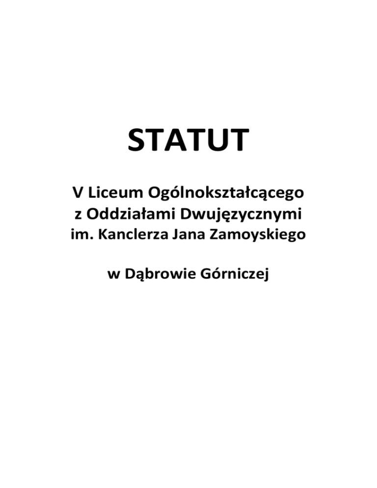 STATUT V Liceum Ogólnokształcącego z Oddziałami Dwujęzycznymi im. Kanclerza Jana Zamoyskiego w Dąbrowie Górniczej Spis treści 1. Rozdział I: Przepisy ogólne s. 2 2. Rozdział II: Organy szkoły s. 5 3. Rozdział III: Organizacja zajęć dydaktyczno-wychowawczych s. 18 Zasady wyboru przedmiotów realizowanych w zakresie rozszerzonym s. 19 4. Rozdział IV: Zasady udzielania i organizowania pomocy psychologiczno-pedagogicznej w szkole s. 22 5. Rozdział V: Organizacja biblioteki szkolnej s. 28 6. Rozdział VI: Warunki kadrowe i lokalowe s. 29 7. Rozdział VII: Zadania nauczycieli s. 31 8. Rozdział VIII: Prawa i obowiązki ucznia s. 36 9. Rozdział IX: Wewnątrzszkolny system oceniania s. 43 Założenia ogólne s. 43 Warunki uzupełniania różnic programowych s. 48 Zasady klasyfikowania i promowania. Zasady informowania uczniów s. 50 Warunki i sposoby przekazywania rodzicom informacji o postępach i trudnościach w nauce i zachowaniu ucznia oraz o szczególnych uzdolnieniach ucznia s. 53 Sposoby sprawdzania osiągnięć edukacyjnych s. 53 Ocena zajęć edukacyjnych – ocenianie bieżące, śródroczne, roczne i końcowe. Wymagania edukacyjne s. 55 Ocena zachowania s. 59 Egzamin klasyfikacyjny s. 62 Egzamin poprawkowy s. 65 Warunki i tryb odwoławczy od oceny ustalonej niezgodnie z przepisami s. 66 Warunki i tryb uzyskiwania wyższych niż przewidywane rocznych ocen klasyfikacyjnych z zajęć edukacyjnych oraz rocznej oceny klasyfikacyjnej zachowania s. 69 Promocja ucznia s. 69 Egzamin maturalny s. 71 Ewaluacja Szkolnego Systemu Oceniania s. 71 Postanowienia końcowe s. 71 10. Rozdział X: Przepisy przejściowe i końcowe 1 s. 72 PODSTAWA PRAWNA Artykuł 60 ustawy z dnia 7 września 1991 r. o systemie oświaty (tekst jednolity Dz.U. z 2015 r. poz. 2156) Rozporządzenie Ministra Edukacji Narodowej z dnia 21 maja 2001 r. w sprawie ramowych statutów publicznego przedszkola oraz publicznych szkół (Dz.U. z 2001 r. Nr 61 poz. 624, z późn. zm.) Rozdział I: Przepisy ogólne §1 Szkoła nosi nazwę V Liceum Ogólnokształcące z Oddziałami Dwujęzycznymi im. Kanclerza Jana Zamoyskiego w Dąbrowie Górniczej przy ulicy Czapińskiego 8. §2 Szkoła posiada imię „Kanclerza Jana Zamoyskiego”. §3 1. Organem prowadzącym szkołę jest Gmina Dąbrowa Górnicza miasto na prawach powiatu, a organem nadzorującym Śląski Kurator Oświaty w Katowicach. 2. Szkoła kształci i wychowuje uczniów zgodnie z ich aspiracjami i uzdolnieniami oraz celami i zasadami systemu edukacji Rzeczpospolitej Polskiej. Liceum spełnia funkcję wychowawczą, dydaktyczną, opiekuńczą i kulturotwórczą, tworząc warunki moralnospołecznego, emocjonalnego, kulturowego i fizycznego rozwoju uczniów. 3. Uczniowie zdobywają wiedzę w ciągu trzech lat zgodnie z programem nauczania właściwym dla danej klasy. 4. Uczniowie wybierają oddział z określonymi przedmiotami nauczanymi w zakresie rozszerzonym zgodnie z własnymi predyspozycjami i zainteresowaniami. 5. Określenie kierunków oraz przedmiotów nauczanych w zakresie rozszerzonym dla danego oddziału ustala dyrektor szkoły w porozumieniu z radą pedagogiczną i radą szkoły. 6. Szkoła organizuje zajęcia dodatkowe zgodnie z potrzebami uczniów w systemie oddziałowym i międzyoddziałowym. 7. Szkoła może organizować zajęcia z przedmiotów nauczania w grupach oddziałowych lub międzyoddziałowych. 2 §4 1. Szkoła, realizując cele i zadania określone w ustawie oraz przepisach wydanych na jej podstawie, umożliwia zdobycie wiedzy i umiejętności niezbędnych do uzyskania świadectwa ukończenia szkoły. 2. Szkoła jako ogniwo systemu edukacji narodowej służy realizacji polityki oświatowej i społecznej państwa, przygotowując młodzież do nauki na studiach wyższych. 3. Proces wychowania i kształcenia służy rozwojowi aktywności obywatelskiej, społecznej, intelektualnej i kulturowej młodzieży. 4. Szkoła sprawuje opiekę nad uczniami odpowiednio do ich potrzeb oraz możliwości szkoły. §5 1. Szkoła jest instytucją kształcącą i wychowującą w duchu godności, prawdy, uczciwości tolerancji i odpowiedzialności, zgodnie z tradycjami narodu polskiego i uniwersalnymi normami moralnymi. Umożliwia uczniom podtrzymywanie poczucia tożsamości narodowej, etnicznej, językowej i religijnej. 2. Wzorcem osobowym absolwenta jest osoba o dużej aktywności społeczno-obywatelskiej oraz intelektualno-kulturalnej. 3. Szkoła prowadzi systematyczną działalność wychowawczą, edukacyjną, informacyjną i profilaktyczną wśród uczniów, ich rodziców lub opiekunów oraz nauczycieli, wychowawców i innych pracowników szkoły w celu przeciwdziałania narkomanii. Działania te szczegółowo określone są w programie wychowawczym i programie profilaktyki. 4. Szkoła udziela uczniom pomocy psychologicznej i pedagogicznej. 5. Szkoła organizuje opiekę nad uczniami niepełnosprawnymi uczęszczającymi do niej. 6. Szkoła umożliwia rozwijanie zainteresowań przez działalność uczniów w kołach, klubach, na obozach, warsztatach oraz poprzez uczestnictwo w różnorodnych imprezach kulturalnych, sportowych, turystycznych i naukowych. 7. Uczniom wybitnie uzdolnionym szkoła umożliwia realizację indywidualnego programu nauczania lub indywidualnego toku nauki. 8. Szkoła może prowadzić innowacje pedagogiczne mające na celu poprawę jakości jej pracy. 9. W ramach zajęć lekcyjnych nauczyciel dopasowuje formę pracy do możliwości intelektualnych uczniów, ze szczególnym uwzględnieniem ucznia słabszego. 3 10. Szkoła organizuje zajęcia z doradztwa zawodowego w celu wspomagania uczniów w podejmowaniu decyzji edukacyjnych odnośnie dalszego kierunku kształcenia i wyboru zawodu: 1) zajęcia z doradztwa zawodowego prowadzone są w grupach oddziałowych oraz w formie doradztwa indywidualnego; 2) zajęcia te mogą być organizowane we współpracy z poradnią psychologicznopedagogiczną, prowadzone są przez: doradcę zawodowego lub na