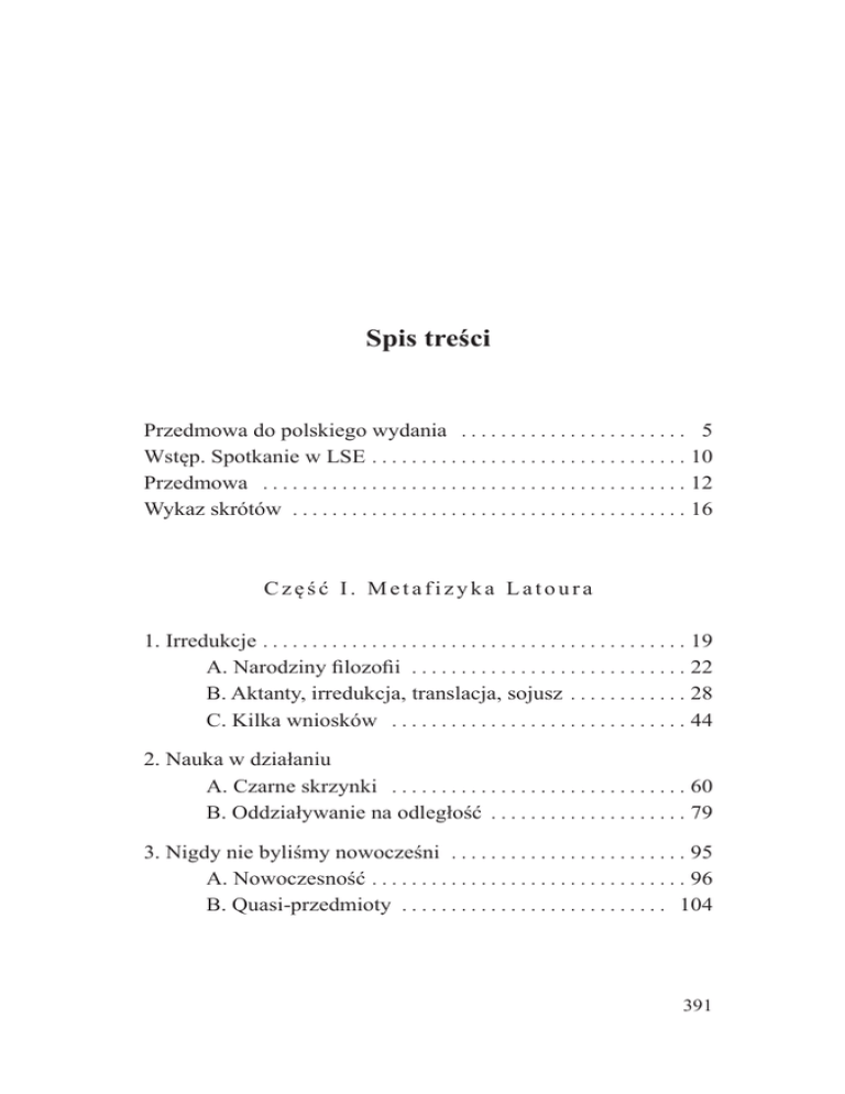 Spis treści Przedmowa do polskiego wydania . . . . . . . . . . . . . . . . . . . . . . . 5 Wstęp. Spotkanie w LSE . . . . . . . . . . . . . . . . . . . . . . . . . . . . . . . . 10 Przedmowa . . . . . . . . . . . . . . . . . . . . . . . . . . . . . . . . . . . . . . . . . . . 12 Wykaz skrótów . . . . . . . . . . . . . . . . . . . . . . . . . . . . . . . . . . . . . . . . 16 Część I. Metafizyka Latoura 1. Irredukcje . . . . . . . . . . . . . . . . . . . . . . . . . . . . . . . . . . . . . . . . . . . 19 A. Narodziny filozofii . . . . . . . . . . . . . . . . . . . . . . . . . . . . 22 B. Aktanty, irredukcja, translacja, sojusz . . . . . . . . . . . . 28 C. Kilka wniosków . . . . . . . . . . . . . . . . . . . . . . . . . . . . . . 44 2. Nauka w działaniu A. Czarne skrzynki . . . . . . . . . . . . . . . . . . . . . . . . . . . . . . 60 B. Oddziaływanie na odległość . . . . . . . . . . . . . . . . . . . . 79 3. Nigdy nie byliśmy nowocześni . . . . . . . . . . . . . . . . . . . . . . . . 95 A. Nowoczesność . . . . . . . . . . . . . . . . . . . . . . . . . . . . . . . . 96 B. Quasi-przedmioty . . . . . . . . . . . . . . . . . . . . . . . . . . . 104 391 Spis treści 4. Nadzieja Pandory . . . . . . . . . . . . . . . . . . . . . . . . . . . . . . . . . . A. Krążąca referencja . . . . . . . . . . . . . . . . . . . . . . . . . . B. Realizm relacyjny . . . . . . . . . . . . . . . . . . . . . . . . . . . C. W imieniu tłumu . . . . . . . . . . . . . . . . . . . . . . . . . . . . 115 118 129 141 Część II. Przedmioty i relacje 1. Sieć wpływów . . . . . . . . . . . . . . . . . . . . . . . . . . . . . . . . . . . . . A. Konkretność aktorów . . . . . . . . . . . . . . . . . . . . . . . . B. Przeciwko materializmowi . . . . . . . . . . . . . . . . . . . C. Lokalny okazjonalizm . . . . . . . . . . . . . . . . . . . . . . . 161 167 175 186 2. Pytania . . . . . . . . . . . . . . . . . . . . . . . . . . . . . . . . . . . . . . . . . . . A. Relacjonizm i korelacjonizm . . . . . . . . . . . . . . . . . B. Pojedynczy i poczwórni aktorzy . . . . . . . . . . . . . . C. Braterstwo materii i relacji . . . . . . . . . . . . . . . . . . . D. Translatorzy . . . . . . . . . . . . . . . . . . . . . . . . . . . . . . . . E. Kosmologia . . . . . . . . . . . . . . . . . . . . . . . . . . . . . . . . 194 199 221 230 239 245 3. Filozofia zwrócona ku przedmiotom . . . . . . . . . . . . . . . . . A. Radykalne, konserwatywne i rozdwojone koncepcje przedmiotów . . . . . . . . . . . . . . . . . . . . . . B. Ucieczka przed kołowrotem relacji . . . . . . . . . . . . C. Immanentna obiektywność . . . . . . . . . . . . . . . . . . . D. Czas, przestrzeń, istota i eidos . . . . . . . . . . . . . . . . E. Więcej metafizyki . . . . . . . . . . . . . . . . . . . . . . . . . . . 250 251 260 313 359 371 Indeks osobowy . . . . . . . . . . . . . . . . . . . . . . . . . . . . . . . . . . . . . 385