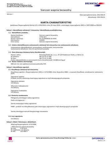 Brenntag Polska Sp. z o.o. ul. J. Bema 21, 47-224 Kędzierzyn-Koźle tel (48/77) 4721500, fax (48/77) 4721600 Siarczan wapnia bezwodny Wersja: I Data sporządzenia karty: 2012-08-24 Aktualizacja: 2015-06-01 KARTA CHARAKTERYSTYKI (podstawa: Rozporządzenie Komisji UE nr 453/2010 z dnia 20 maja 2010r. zmieniające rozporządzenie (WE) nr 1907/2006 ws REACH) Sekcja 1. Identyfikacja substancji / mieszaniny i identyfikacja przedsiębiorstwa. 1.1. Identyfikator produktu. Nazwa handlowa: Identyfikator: Numer rejestracji: Kod towaru: Inne nazwy: Siarczan wapnia bezwodny 7778-18-9 01-2119444918-26-XXXX 516503 Siarczan wapnia bezwodny 1.2. Istotne zidentyfikowane zastosowania substancji lub mieszaniny oraz zastosowania odradzane. zastosowania zidentyfikowane: przemysłowe, profesjonalne, konsumenckie zastosowania odradzane: inne niż wymienione powyżej 1.3. Dane dotyczące dostawcy karty charakterystyki. Nazwa i adres: Brenntag Polska Sp. z o.o., 47-224 Kedzierzyn-Koźle, ul. Bema 21 Nr telefonu: 48 (77) 47 21 500 Nr faxu: 48 (77) 47 21 600 Osoba odpowiedzialna za opracowanie karty charakterystyki: [email protected] 1.4. Numer telefonu alarmowego. 998 lub 112, lub najbliższa terenowa jednostka PSP. Sekcja 2. Identyfikacja zagrożeń. 2.1. Klasyfikacja substancji lub mieszaniny. Klasyfikacja zgodnie z Rozporządzeniem (WE) nr 1272/2008 z dnia 16 grudnia 2008 r. w sprawie klasyfikacji, oznakowania i pakowania (CLP) Zagrożenie ogólnie: Produkt nie jest substancją stwarzającą zagrożenie w myśl obowiązujących przepisów. Zagrożenie zdrowia: nie dotyczy Własności niebezpieczne: nie dotyczy Zagrożenie środowiska: nie dotyczy 2.2. Elementy oznakowania Piktogramy określające rodzaj zagrożenia: Hasło ostrzegawcze: Zwroty wskazujące rodzaj zagrożenia: H000 - produkt nie sklasyfikowany jako stwarzający zagrożenie w myśl obowiązujących przepisów Zwroty określające warunki bezpiecznego stosowania: 2.3. Inne zagrożenia. nie dotyczy Sekcja 3. Skład / informacja o składnikach. Skład wg Rozporządzenia 1272/2008. > 85% Siarczan wapnia bezwodny Nr CAS: 7778-18-9 Nr indeksowy: nie dotyczy Nr WE: 231-900-3 Karta opracowana przez firmę Brenntag Polska Sp. z o.o. Strona 1 z 6 Brenntag Polska Sp. z o.o. ul. J. Bema 21, 47-224 Kędzierzyn-Koźle tel (48/77) 4721500, fax (48/77) 4721600 Siarczan wapnia bezwodny Sekcja 4. Środki pierwszej pomocy. 4.1. Opis środków pierwszej pomocy. Wdychanie: Nie stwarza zagrożenia, brak szczególnych zaleceń Kontakt ze skórą: Nie stwarza zagrożenia, brak szczególnych zaleceń Kontakt z oczami: W razie kontaktu z oczami płukać dużą ilością wody, przytrzymując odchylone powieki. W przypadku objawów podrażnienia skontaktować się z lekarzem. Spożycie: W razie spożycia podać do wypicia wodą w małych porcjach. 4.2. Najważniejsze ostre i opóźnione objawy oraz skutki narażenia. brak dostępnych danych 4.3. Wskazania dotyczące wszelkiej natychmiastowej pomocy lekarskiej i szczególnego postępowania z poszkodowanym. Neutralna sól kompatybilna ze skórą. Nie powoduje reakcji alergicznej. Pył rozpuszczalny. Sekcja 5. Postępowanie w przypadku pożaru. 5.1. Środki gaśnicze. Pożary w obecności produktu gasić środkami odpowiednimi dla palących się materiałów. 5.2. Szczególne zagrożenia związane z substancją lub mieszaniną. Produkt niepalny 5.3. Informacje dla straży pożarnej. Stosować środki ochrony odpowiednie dla palących się materiałów. Sekcja 6. Postępowanie w przypadku niezamierzonego uwolnienia do środowiska. 6.1. Indywidualne środki ostrożności, wyposażenie ochronne i procedury w sytuacjach awaryjnych. Unikać wzniecania pyłów. Nie wdychać pyłów. Zapewnić odpowiednią wentylację. 6.2. Środki ostrożności w zakresie ochrony środowiska. brak szczególnych wymagań 6.3. Metody i materiały zapobiegające rozprzestrzenianiu się skażenia i służące do usuwania skażenia. Rozsypany produkt zebrać mechanicznie, unikając wzniecania pyłu, do zamykanego pojemnika. Przekazać do usunięcia. 6.4. Odniesienia do innych sekcji. Informacje dotyczące odpowiedniego sprzętu ochrony osobistej podano w sekcji 8. Usuwać zgodnie z zaleceniami przedstawionymi w sekcji 13 Sekcja 7. Postępowanie z substancjami i mieszaninami oraz ich magazynowanie. 7.1. Środki ostrożności dotyczące bezpiecznego postępowania. Unikac kontaktu z oczami, nie wdychać pyłu. 7.2. Warunki bezpiecznego magazynowania, łącznie z informacjami dotyczącymi wszelkich wzajemnych niezgodności. Przechowywać w szczelnie zamkniętych, oryginalnych opakowaniach. Chronić przed wilgocią. 7.3. Szczególne zastosowania końcowe. brak dostępnych danych Sekcja 8. Kontrola narażenia / środki ochrony indywidualnej. 8.1. Parametry dotyczące kontroli. Najwyższe dopuszczalne stężenia: NDS, NDSCh - nie oznaczono (wg Rozporządzenia MPiPS z dn. 29 listopada 2002 ; Dz.U. Nr 217, poz. 1833, z późniejszymi zmianami) Zalecenia dotyczące procedury monitoringu zawartości składników niebezpiecznych w powietrzu – metodyka pomiarów: -Rozporządzenie Ministra Zdrowia z dnia 20 kwietnia 2005 r. w sprawie badań i pomiarów czynników szkodliwych dla zdrowia w środowisku pracy (Dz.U. Nr 73, poz.645) -PN-89/Z-01001/06. Ochrona czystości powietrza. Nazwy, określenia i jednostki. Terminologia dotycząca badań jakości powietrza na Karta opracowana przez firmę Brenntag Polska Sp. z o.o. Strona 2 z 6 Brenntag Polska Sp. z o.o. ul. J. Bema 21, 47-224 Kędzierzyn-Koźle tel (48/77) 4721500, fax (48/77) 4721600 Siarczan wapnia bezwodny stanowiskach pracy. -PN Z-04008-7:2002. Ochrona czystości powietrza. Pobieranie próbek. Zasady pobierania próbek powietrza w środowisku pracy i interpretacja wyników. -PN-EN-689: 2002. Powietrze na stanowiskach pracy – wytyczne oceny narażenia inhalacyjnego na czynniki chemiczne przez porównanie z wartościami dopuszczalnymi i strategia pomiarowa. Uwaga: Gdy stężenie substancji jest ustalone i znan
