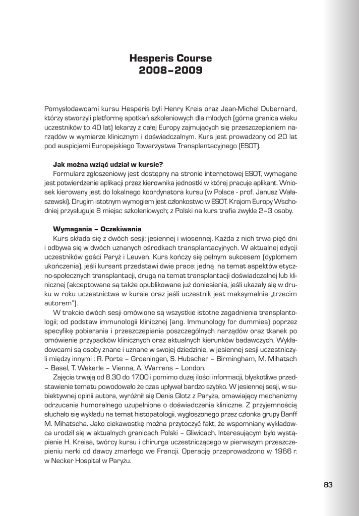 Hesperis Course 20082009 Pomys³odawcami kursu Hesperis byli Henry Kreis oraz Jean-Michel Dubernard, którzy stworzyli platformê spotkañ szkoleniowych dla m³odych (górna granica wieku uczestników to 40 lat) lekarzy z ca³ej Europy zajmuj¹cych siê przeszczepianiem narz¹dów w wymiarze klinicznym i dowiadczalnym. Kurs jest prowadzony od 20 lat pod auspicjami Europejskiego Towarzystwa Transplantacyjnego (ESOT). Jak mo¿na wzi¹æ udzia³ w kursie? Formularz zg³oszeniowy jest dostêpny na stronie internetowej ESOT, wymagane jest potwierdzenie aplikacji przez kierownika jednostki w której pracuje aplikant. Wniosek kierowany jest do lokalnego koordynatora kursu (w Polsce - prof. Janusz Wa³aszewski). Drugim istotnym wymogiem jest cz³onkostwo w ESOT. Krajom Europy Wschodniej przys³uguje 8 miejsc szkoleniowych; z Polski na kurs trafia zwykle 23 osoby. Wymagania Oczekiwania Kurs sk³ada siê z dwóch sesji: jesiennej i wiosennej. Ka¿da z nich trwa piêæ dni i odbywa siê w dwóch uznanych orodkach transplantacyjnych. W aktualnej edycji uczestników goci Pary¿ i Leuven. Kurs koñczy siê pe³nym sukcesem (dyplomem ukoñczenia), jeli kursant przedstawi dwie prace: jedn¹ na temat aspektów etyczno-spo³ecznych transplantacji, drug¹ na temat transplantacji dowiadczalnej lub klinicznej (akceptowane s¹ tak¿e opublikowane ju¿ doniesienia, jeli ukaza³y siê w druku w roku uczestnictwa w kursie oraz jeli uczestnik jest maksymalnie trzecim autorem). W trakcie dwóch sesji omówione s¹ wszystkie istotne zagadnienia transplantologii; od podstaw immunologii klinicznej (ang. Immunology for dummies) poprzez specyfikê pobierania i przeszczepiania poszczególnych narz¹dów oraz tkanek po omówienie przypadków klinicznych oraz aktualnych kierunków badawczych. Wyk³adowcami s¹ osoby znane i uznane w swojej dziedzinie, w jesiennej sesji uczestniczyli miêdzy innymi : R. Porte Groeningen, S. Hubscher Birmingham, M. Mihatsch Basel, T. Wekerle Vienna, A. Warrens London. Zajêcia trwaj¹ od 8.30 do 17.00 i pomimo du¿ej iloci informacji, b³yskotliwe przedstawienie tematu powodowa³o ¿e czas up³ywa³ bardzo szybko. W jesiennej sesji, w subiektywnej opinii autora, wyró¿ni³ siê Denis Glotz z Pary¿a, omawiaj¹cy mechanizmy odrzucania humoralnego uzupe³nione o dowiadczenia kliniczne. Z przyjemnoci¹ s³ucha³o siê wyk³adu na temat histopatologii, wyg³oszonego przez cz³onka grupy Banff M. Mihatscha. Jako ciekawostkê mo¿na przytoczyæ fakt, ¿e wspomniany wyk³adowca urodzi³ siê w aktualnych granicach Polski Gliwicach. Interesuj¹cym by³o wyst¹pienie H. Kreisa, twórcy kursu i chirurga uczestnicz¹cego w pierwszym przeszczepieniu nerki od dawcy zmar³ego we Francji. Operacjê przeprowadzono w 1966 r. w Necker Hospital w Pary¿u. 83 Jak wspomnia³em kurs jest intensywny, ale .... jest równie¿ czas wieczornych spotkañ, na których mo¿na porozmawiaæ na ró¿ne tematy. Pocz¹tkowo dominuje transplantologia lecz bardzo szybko rozmowy tocz¹ sie na wiele ciekawych tematów w miêdzynarodowym towarzystwie. Ciekawe dowiadczenie, szczególnie z perspektywy obywatela kraju, który jest postrzegany jako Europa C. Po raz kolejny okaza³o siê, ¿e nie ró¿nimy siê szczególnie od Holendra, Niemca, Szweda czy Anglika, co zosta³o przyjête z zaciekawieniem i ¿yczliwoci¹. Henry Kreis twórca kursu Hesperis i Krzysztof Pabisiak Podsumowanie Jesienna, paryska sesja kursu Hesperis to dobrze spêdzony czas jako repetytorium wiedzy transplantacyjnej oraz czas ciekawych spotkañ. Wiosn¹ Leuven. Polecam Hesperis wszystkim m³odym transplantologom. Krzysztof Pabisiak. Szczecin 84