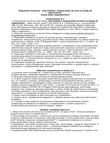 Regulamin konkursu „Kup książkę i wygraj bilety do kina na Drogę do zapomnienia" zwany dalej „Regulaminem” [Organizator] § 1. 1.Organizatorem konkursu pod nazwą „Kup książkę i wygraj bilety do kina na Drogę do zapomnienia " (dalej również „akcja”) jest Matras S.A. z siedzibą przy ul. Łopuszańskiej 38B, 02-232 Warszawa , NIP: 634-10-05-237, wpisana do Krajowego Rejestru Sądowego przez Sąd Rejonowy Katowice-Wschód w Katowicach Wydział VIII Gospodarczy Krajowego Rejestru Sądowego nr KRS 0000252298, kapitał zakładowy 21 834 188 zł w całości opłacony (dalej „Organizator”). 2. Akcja jest prowadzona na stronie Matras Księgarnie na http://www.matras.pl/konkursdrogadozapomnienia.html. 3. Organizator oświadcza, że akcja nie jest grą losową, loterią fantową, zakładem wzajemnym, loterią promocyjną, grą której wynik zależy od przypadku, ani żadną inną formą przewidzianą w ustawie z dnia 19 listopada 2009 r. o grach hazardowych (Dz. U. z 2009 r. Nr 201, poz. 1540, z późn. zm.) 4. Organizator oświadcza, że dane osobowe zbierane i przetwarzane przez Organizatora jako administratora danych osobowych będą wykorzystywane wyłącznie w ramach i na potrzeby przeprowadzenia akcji, zgodnie z postanowieniami ustawy z dnia 29 sierpnia 1997 r. o ochronie danych osobowych (Dz. U. z 2002 r., Nr 101, poz. 926, z późn. zm.). 5. Organizator oświadcza i informuje, iż Uczestnikowi przysługuje prawo do kontroli przetwarzania danych a zwłaszcza uprawnienia określone w art. 32 ustawy o z dnia 29 sierpnia 1997 r. o ochronie danych osobowych tj. m.in. wglądu do danych osobowych oraz prawo do ich poprawiania. 6. Organizator podejmuje najwyższe starania, aby zasady i warunki uczestniczenia konsumentów w akcji kształtowały prawa i obowiązki konsumenta w sposób zgodny z dobrymi obyczajami z uwzględnieniem jego interesów. [Warunki uczestnictwa w akcji] § 2. 1.Uczestnik zanim przystąpi do uczestnictwa w akcji, powinien zapoznać się z postanowieniami niniejszego regulaminu i odsyłaczami do innych regulacji prawnych. 2. Akcja jest organizowana na terytorium Rzeczpospolitej Polskiej. 3. W akcji mogą brać udział wszystkie osoby fizyczne, będące konsumentami w rozumieniu art. 22¹ kodeksu cywilnego, przebywające na terenie Rzeczpospolitej Polskiej, które są osobami pełnoletnimi i posiadającymi pełną zdolność do czynności prawnych oraz zakupią książkę „Droga do zapomnienia” (wyd. Znak) w okresie od 28 marca do 4 kwietnia 2014 r. w dowolnej księgarni MATRAS lub w księgarni internetowej www.matras.pl, zachowując paragon, oraz umieszczą autorską wypowiedź w poście „Droga do zapomnienia to prawdziwa, niezwykła opowieść o cenie przebaczenia. Jaka jest jego cena? Wyzwala, oczyszcza, pomaga zapomnieć?” w wiadomości wysłanej na stronie konkursowej. 4. Osoby, które przystąpiły do akcji nazywane są „Uczestnikami”. 5. Udział w akcji i udostępnienie związanych z udziałem danych jest całkowicie dobrowolne i bezpłatne. 6. Z udziału w akcji wyłączeni są pracownicy Organizatora oraz podmiotów trzecich podejmujących działania we współpracy z Organizatorem w celach związanych z przeprowadzeniem Konkursu oraz ich wstępni i zstępni. [Zasady i przebieg akcji] § 3. 1. Akcja trwa od dnia 28 marca do 4 kwietnia 2014 r. do godz. 24.00. Okres przyznawania nagród trwa do dnia 11 kwietnia 2014 r. 2. Akcja polega na stworzeniu i umieszczeniu przez Uczestnika autorskiej wypowiedzi na temat „Droga do zapomnienia to prawdziwa, niezwykła opowieść o cenie przebaczenia. Jaka jest jego cena? Wyzwala, oczyszcza, pomaga zapomnieć?” w wiadomości wysłanej na na stronie konkursowej dalej zwanej „hasłem konkursowym”. 3. Niezbędnym warunkiem uczestnictwa w akcji jest zakup książki „Droga do zapomnienia” w okresie od 28 marca do 4 kwietnia 2014 r. w dowolnej księgarni MATRAS lub w księgarni internetowej www.matras.pl oraz zachowanie paragonu. 4. Niedopuszczalne jest podejmowanie przez Uczestników działań sprzecznych z prawem oraz dobrymi obyczajami jak np. przywłaszczenie cudzego materiału autorskiego. 5. W celu opublikowania na profilu Matras Księgarnie na www.facebook.com/matraspl wyników akcji, Uczestnicy wyrażają zgodę na wskazanie laureatów akcji. [Wyłonienie zwycięzcy i nagrody] § 4. 1. Hasła konkursowe będą oceniane przez Komisję konkursową złożoną z przedstawicieli Organizatora według ściśle określonych kryteriów. 2. Komisja konkursowa, przyznając nagrody i wybierając laureatów na posiedzeniu tajnym, weźmie pod uwagę (i) oryginalność (ii) jakość językową oraz (iii) jakoś merytoryczną hasła konkursowego. 3. Wyniki Konkursu zostaną ogłoszone na profilu Matras Księgarnie na www.facebook.com/matraspl do godz. 24.00 do dnia 7 kwietnia 2014 r. na zasadach wskazanych w § 3 ust. 5 niniejszego regulaminu. Ponadto laureaci zostaną bezpośrednio zawiadomieni o przyznaniu nagrody na podany adres e-mail. 4. Decyzja Komisji konkursowej jest ostateczna i nie podlega weryfikacji. 5. Nagrody zostaną przyznane w następujący sposób: 50 laureatów, których wypowiedzi na temat „Droga do zapomnienia to prawdziwa, niezwykła opowieść o cenie przebaczenia. Jaka jest jego cena? Wyzwala, oczyszcza, pomaga zapomnieć?” spełnią następujące kryteria tj. zostaną uznane przez komisję konkursową za najbardziej oryginalne oraz na najwyższym poziomie pod względem merytorycznym i językowym otrzymają po podwójnym zaproszeniu na film „Droga do zapomnienia” do obejrzenia w Cinema City w jednym z 10 wybranych miast: Bydgoszcz, Warszawa, Kraków, Katowice, Łódź, Wrocław, Poznań, Gdańsk, Lublin, Częstochowa 6. Laureat akcji w ramach otrzymanej nagrody, o której mowa w § 4 ust. 5 i jego wyróżnienia, wyraża zgodę na nieodpłatne publikowanie w całości, w części lub w formie skróconej, hasła konkursowego laureata na stronie księgarni internetowej w