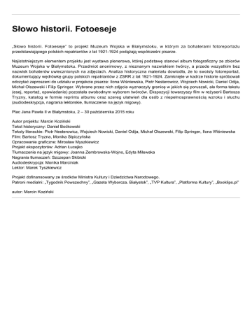 Słowo historii. Fotoeseje „Słowo historii. Fotoeseje” to projekt Muzeum Wojska w Białymstoku, w którym za bohaterami fotoreportażu przedstawiającego polskich repatriantów z lat 1921-1924 podążają współcześni pisarze. Najistotniejszym elementem projektu jest wystawa plenerowa, której podstawę stanowi album fotograficzny ze zbiorów Muzeum Wojska w Białymstoku. Przedmiot anonimowy, z nieznanym nazwiskiem twórcy, a przede wszystkim bez nazwisk bohaterów uwiecznionych na zdjęciach. Analiza historyczna materiału dowiodła, że to swoisty fotoreportaż, dokumentujący wędrówkę grupy polskich repatriantów z ZSRR z lat 1921-1924. Zamknięte w kadrze historie spróbowali odczytać zaproszeni do udziału w projekcie pisarze: Ilona Wiśniewska, Piotr Nesterowicz, Wojciech Nowicki, Daniel Odija, Michał Olszewski i Filip Springer. Wybrane przez nich zdjęcia wyznaczyły granicę w jakich się poruszali, ale forma tekstu (esej, reportaż, opowiadanie) pozostała swobodnym wyborem twórców. Ekspozycji towarzyszy film w reżyserii Bartosza Tryzny, katalog w formie reprintu albumu oraz szereg ułatwień dla osób z niepełnosprawnością wzroku i słuchu (audiodeskrypcja, nagrania lektorskie, tłumaczenie na język migowy). Plac Jana Pawła II w Białymstoku, 2 – 30 października 2015 roku Autor projektu: Marcin Koziński Tekst historyczny: Daniel Boćkowski Teksty literackie: Piotr Nesterowicz, Wojciech Nowicki, Daniel Odija, Michał Olszewski, Filip Springer, Ilona Wiśniewska Film: Bartosz Tryzna, Monika Stpiczyńska Opracowanie graficzne: Mirosław Myszkiewicz Projekt ekspozytorów: Adrian Łucejko Tłumaczenie na język migowy: Joanna Zembrowska-Wojno, Edyta Milewska Nagrania tłumaczeń: Szczepan Skibicki Audiodeskrypcja: Monika Marciniak Lektor: Marek Tyszkiewicz Projekt dofinansowany ze środków Ministra Kultury i Dziedzictwa Narodowego. Patroni medialni: „Tygodnik Powszechny”, „Gazeta Wyborcza. Białystok”, „TVP Kultura”, „Platforma Kultury”, „Booklips.pl” autor: Marcin Koziński