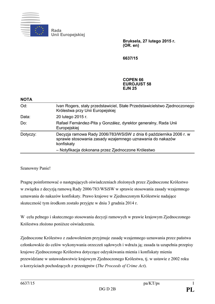 Rada Unii Europejskiej Bruksela, 27 lutego 2015 r. (OR. en) 6637/15 COPEN 66 EUROJUST 58 EJN 25 NOTA Od: Data: Ivan Rogers, stały przedstawiciel, Stałe Przedstawicielstwo Zjednoczonego Królestwa przy Unii Europejskiej 20 lutego 2015 r. Do: Rafael Fernández-Pita y González, dyrektor generalny, Rada Unii Europejskiej Dotyczy: Decyzja ramowa Rady 2006/783/WSiSW z dnia 6 października 2006 r. w sprawie stosowania zasady wzajemnego uznawania do nakazów konfiskaty – Notyfikacja dokonana przez Zjednoczone Królestwo Szanowny Panie! Pragnę poinformować o następujących oświadczeniach złożonych przez Zjednoczone Królestwo w związku z decyzją ramową Rady 2006/783/WSiSW w sprawie stosowania zasady wzajemnego uznawania do nakazów konfiskaty. Prawo krajowe w Zjednoczonym Królestwie nadające skuteczność tym środkom zostało przyjęte w dniu 3 grudnia 2014 r. W celu pełnego i skutecznego stosowania decyzji ramowych w prawie krajowym Zjednoczonego Królestwa złożono poniższe oświadczenia. Zjednoczone Królestwo z zadowoleniem przyjmuje zasadę wzajemnego uznawania przez państwa członkowskie do celów wykonywania orzeczeń sądowych i wdraża ją; zasada ta uzupełnia przepisy krajowe Zjednoczonego Królestwa dotyczące odzyskiwania mienia i konfiskaty mienia przewidziane w ustawodawstwie krajowym Zjednoczonego Królestwa, tj. w ustawie z 2002 roku o korzyściach pochodzących z przestępstw (The Proceeds of Crime Act). 6637/15 pa/KT/ps DG D 2B 1 PL Decyzja ramowa Rady 2006/783/WSiSW W odniesieniu do decyzji ramowej Rady 2006/783/WSiSW: na mocy art. 3 każdy prokurator w Zjednoczonym Królestwie może przekazywać nakazy wydane przez sądy w Zjednoczonym Królestwie i dotyczące mienia w innych państwach członkowskich. W odniesieniu do nakazów wydanych przez państwa członkowskie i dotyczących mienia w Zjednoczonym Królestwie organami właściwymi są następujące podmioty: Dla Anglii i Walii: Crown Prosecution Service (Koronna Służba Prokuratorska) Proceeds of Crime Rose Court 2 Southwark Bridge London SE1 9HS lub: Serious Fraud Office (Urząd ds. Zwalczania Poważnych Nadużyć) Proceeds of Crime Serious Fraud Office 2-4 Cockspur Street London SW1Y 5BS Dla Irlandii Północnej: Public Prosecution Service for Northern Ireland (Służba Prokuratorska Irlandii Północnej) High Court & International Section Belfast Chambers 93 Chichester Street Belfast BT1 3JR 6637/15 pa/KT/ps DG D 2B 2 PL lub: Serious Fraud Office (Urząd ds. Zwalczania Poważnych Nadużyć) Proceeds of Crime Serious Fraud Office 2-4 Cockspur Street London SW1Y 5BS Dla Szkocji: International Co-operation Unit (Wydział ds. Współpracy Międzynarodowej) Crown Office (Urząd Koronny) 25 Chambers Street Edinburgh EH1 ILA tel.: +44 (0)131 243 8152 faks: +44 (0)131 243 8153 adres mejlowy: [email protected] Podkreślamy, że uprawnienia do wydawania i uznawania nakazów konfiskaty i odpowiedzialność za ich wydawanie i uznawanie pozostają w kompetencji sądu Zjednoczonego Królestwa. W odniesieniu do art. 19 ust. 2: Zjednoczone Królestwo będzie akceptować wyłącznie nakazy, zaświadczenia i inne dokumenty uzupełniające sporządzone w języku angielskim (lub z dołączonym uwierzytelnionym tłumaczeniem na język angielski). Podkreślamy, że uprawnienia do wydawania i uznawania postanowień o zabezpieczeniu i odpowiedzialność za ich wydawanie i uznawanie pozostają w kompetencji sądu Zjednoczonego Królestwa. 6637/15 pa/KT/ps DG D 2B 3 PL W przypadku gdyby chciał Pan omówić któreś z oświadczeń przedstawionych powyżej, Stephen Goadby z Ministerstwa Spraw Wewnętrznych z przyjemnością udzieli dalszych wyjaśnień: [email protected] +44 (0)20 7035 1559. (zwrot grzecznościowy) (podpisano) Ivan Rogers ____________________ 6637/15 pa/KT/ps DG D 2B 4 PL