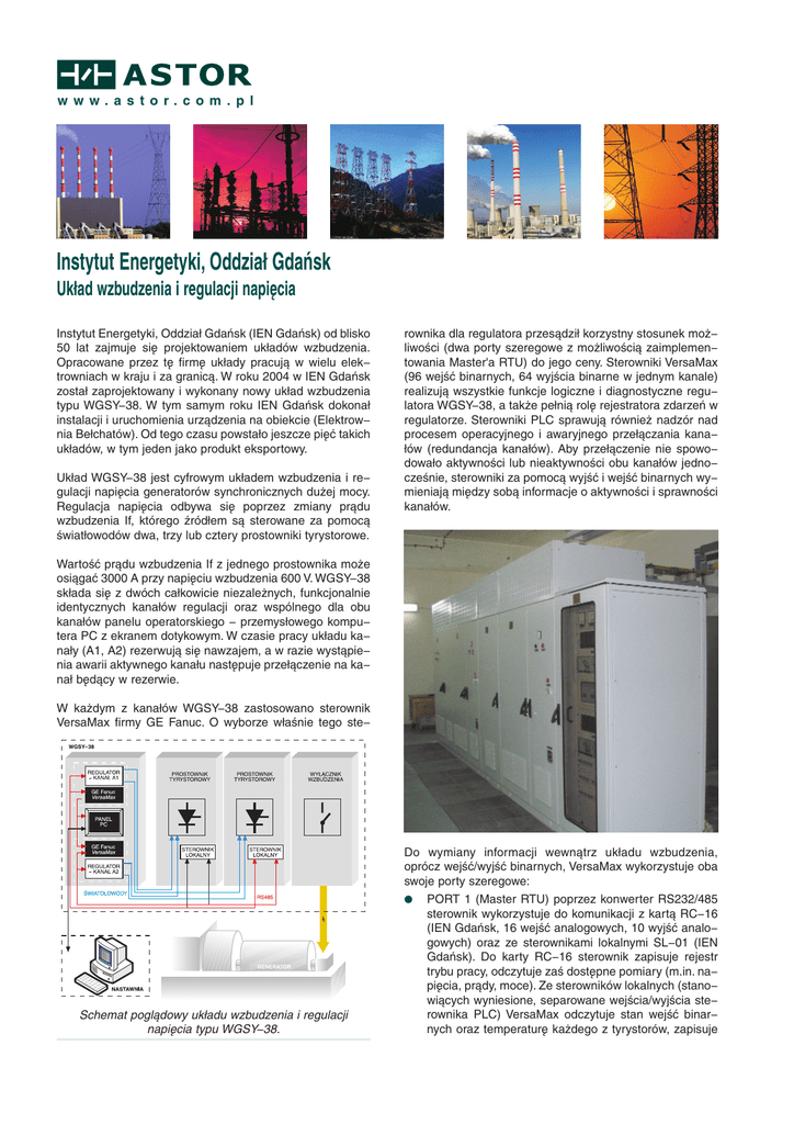 w w w. a s t o r. c o m . p l Instytut Energetyki, Oddział Gdańsk Układ wzbudzenia i regulacji napięcia Instytut Energetyki, Oddział Gdańsk (IEN Gdańsk) od blisko 50 lat zajmuje się projektowaniem układów wzbudzenia. Opracowane przez tę firmę układy pracują w wielu elek− trowniach w kraju i za granicą. W roku 2004 w IEN Gdańsk został zaprojektowany i wykonany nowy układ wzbudzenia typu WGSY−38. W tym samym roku IEN Gdańsk dokonał instalacji i uruchomienia urządzenia na obiekcie (Elektrow− nia Bełchatów). Od tego czasu powstało jeszcze pięć takich układów, w tym jeden jako produkt eksportowy. Układ WGSY−38 jest cyfrowym układem wzbudzenia i re− gulacji napięcia generatorów synchronicznych dużej mocy. Regulacja napięcia odbywa się poprzez zmiany prądu wzbudzenia If, którego źródłem są sterowane za pomocą światłowodów dwa, trzy lub cztery prostowniki tyrystorowe. rownika dla regulatora przesądził korzystny stosunek moż− liwości (dwa porty szeregowe z możliwością zaimplemen− towania Master'a RTU) do jego ceny. Sterowniki VersaMax (96 wejść binarnych, 64 wyjścia binarne w jednym kanale) realizują wszystkie funkcje logiczne i diagnostyczne regu− latora WGSY−38, a także pełnią rolę rejestratora zdarzeń w regulatorze. Sterowniki PLC sprawują również nadzór nad procesem operacyjnego i awaryjnego przełączania kana− łów (redundancja kanałów). Aby przełączenie nie spowo− dowało aktywności lub nieaktywności obu kanałów jedno− cześnie, sterowniki za pomocą wyjść i wejść binarnych wy− mieniają między sobą informacje o aktywności i sprawności kanałów. Wartość prądu wzbudzenia If z jednego prostownika może osiągać 3000 A przy napięciu wzbudzenia 600 V. WGSY−38 składa się z dwóch całkowicie niezależnych, funkcjonalnie identycznych kanałów regulacji oraz wspólnego dla obu kanałów panelu operatorskiego − przemysłowego kompu− tera PC z ekranem dotykowym. W czasie pracy układu ka− nały (A1, A2) rezerwują się nawzajem, a w razie wystąpie− nia awarii aktywnego kanału następuje przełączenie na ka− nał będący w rezerwie. W każdym z kanałów WGSY−38 zastosowano sterownik VersaMax firmy GE Fanuc. O wyborze właśnie tego ste− Do wymiany informacji wewnątrz układu wzbudzenia, oprócz wejść/wyjść binarnych, VersaMax wykorzystuje oba swoje porty szeregowe: ● Schemat poglądowy układu wzbudzenia i regulacji napięcia typu WGSY−38. PORT 1 (Master RTU) poprzez konwerter RS232/485 sterownik wykorzystuje do komunikacji z kartą RC−16 (IEN Gdańsk, 16 wejść analogowych, 10 wyjść analo− gowych) oraz ze sterownikami lokalnymi SL−01 (IEN Gdańsk). Do karty RC−16 sterownik zapisuje rejestr trybu pracy, odczytuje zaś dostępne pomiary (m.in. na− pięcia, prądy, moce). Ze sterowników lokalnych (stano− wiących wyniesione, separowane wejścia/wyjścia ste− rownika PLC) VersaMax odczytuje stan wejść binar− nych oraz temperaturę każdego z tyrystorów, zapisuje zaś stan wyjść binarnych. ● PORT 2 (Slave RTU) służy do pobierania przez panel operatorski informacji o stanie pracy obu kanałów, ak− tywnych alarmach oraz zarejestrowanych zdarzeniach. Ponadto VersaMax może odebrać przez ten port pole− cenia z panelu operatorskiego. Do wymiany informacji między układem wzbudzenia a na− stawnią blokową zastosowano separowane wejścia/wyjścia binarne sterownika VersaMax, separowane wyjścia 4 ÷ 20 mA z kart RC−16 oraz łącze ethernetowe panelu operator− skiego. Panel ten pozwala na wizualizację procesu regula− cji oraz pełni rolę serwera TCP, który za pomocą protokołu Modbus/TCP udostępnia dane dotyczące procesu dla sys− temu sterowania w nastawni blokowej. W porównaniu do swoich poprzedników układ WGSY−38 posiada wiele dodatkowych funkcji i nowych możliwości, takich jak: ● pełna redundancja sprzętu i oprogramowania − dwa kanały regulacji (nadzór nad procesem przełączania kanałów w PLC); każdy kanał posiada niezależne światłowodowe sterowanie każdej szafy prostowniko− wej oraz niezależne łącza szeregowe RS485 do ste− rowników lokalnych, ● kontrola (w PLC, niezależnie w każdym kanale) wszel− kich możliwych zakłóceń występujących w układzie wraz z rejestracją daty i czasu wystąpienia usterki, ● komunikacja z nadrzędnym systemem sterowania i wi− zualizacji w oparciu o łącze ethernetowe (Mod− bus/TCP), ● rozbudowane funkcje regulacyjne, kontrolujące czy punkt pracy generatora nie przekroczył dopuszczalne− go obszaru, ● możliwość dużego oddalenia (kilkadziesiąt metrów) prostowników od regulatora dzięki zastosowaniu świa− tłowodów do sterowania pracą prostowników oraz in− terfejsu RS485 do komunikacji każdego sterownika PLC ze sterownikami lokalnymi w prostownikach. Te cechy pozwalają na utrzymanie generatora w ruchu, na− wet przy usterce w aktywnym kanale regulacji, uszkodzonej szafie prostownika lub uszkodzonym łączu komunikacyj− nym. Ma to niebagatelne znaczenie zważywszy, że kilkumi− nutowy postój generatora dużej mocy to dla elektrowni strata kilkudziesięciu tysięcy złotych. Michał Izdebski − Instytut Energetyki O/Gdańsk, Zakład Automatyki i Analiz Systemowych ELEMENTY SYSTEMU VersaMax w w w. a s t o r. c o m . p l