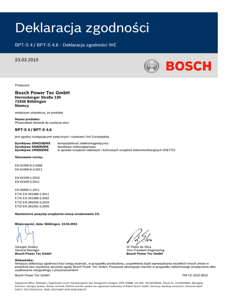 Deklaracja zgodności BPT-S 4 / BPT-S 4.6 - Deklaracja zgodności WE 23.03.2015 Producent Bosch Power Tec GmbH Herrenberger Straße 130 71034 Böblingen Niemcy niniejszym oświadcza, że produkty Nazwa produktu: Photovoltaik falownik do zasilania sieci BPT-S 4 / BPT-S 4.6 jest zgodny następującymi wytycznymi i ustawami Unii Europejskiej: Dyrektywa 2004/108/WE Dyrektywa 2006/95/WE Dyrektywa 1999/05/WE kompatybilność elektromagnetyczna dyrektywa niskonapięciowa w sprawie urządzeń radiowych i końcowych urządzeń telekomunikacyjnych (R&TTE) Stosowane normy: EN 61000-6-2:2006 EN 61000-6-3:2011 EN 62109-1:2010 EN 62109-2:2011 EN 60950-1:2011 ETSI EN 301489-1:2011 ETSI EN 301489-3:2002 ETSI EN 300330-2:2010 ETSI EN 302291-2:2005 Wymienione powyżej urządzenia noszą oznakowanie CE. Miejscowość, data: Böblingen, 23.03.2015 Georges Andary General Manager Bosch Power Tec GmbH Dr Pedro da Silva Vice President Engineering Bosch Power Tec GmbH Wskazówka: Niniejsza deklaracja zgodności traci swoją ważność, w przypadku przebudowy, uzupełnienia bądź wprowadzania wszelkich innych zmian w produkcie bez uzyskania wyraźnej zgody Bosch Power Tec GmbH. Powyższe obowiązuje również w przypadku niefachowego przyłączenia albo użytkowania niezgodnego z przeznaczeniem! Bosch Power Tec GmbH PM CE 2015 0013 Registered Office: Böblingen, Registration Court: Handelsregister des Amtsgericht Stuttgart, HRB 750868, Ust.IdNr. DE249766464, Steuer-Nr. 27/190/00854, Managing Directors: Georges Andary; Markus Schmidt, BOSCH and the symbol are registered trademarks of Robert Bosch GmbH, Germany, Banking connection: Deutsche Bank SWIFT: DEUTDESSXXX IBAN: DE34 6007 0070 0168 0164 00