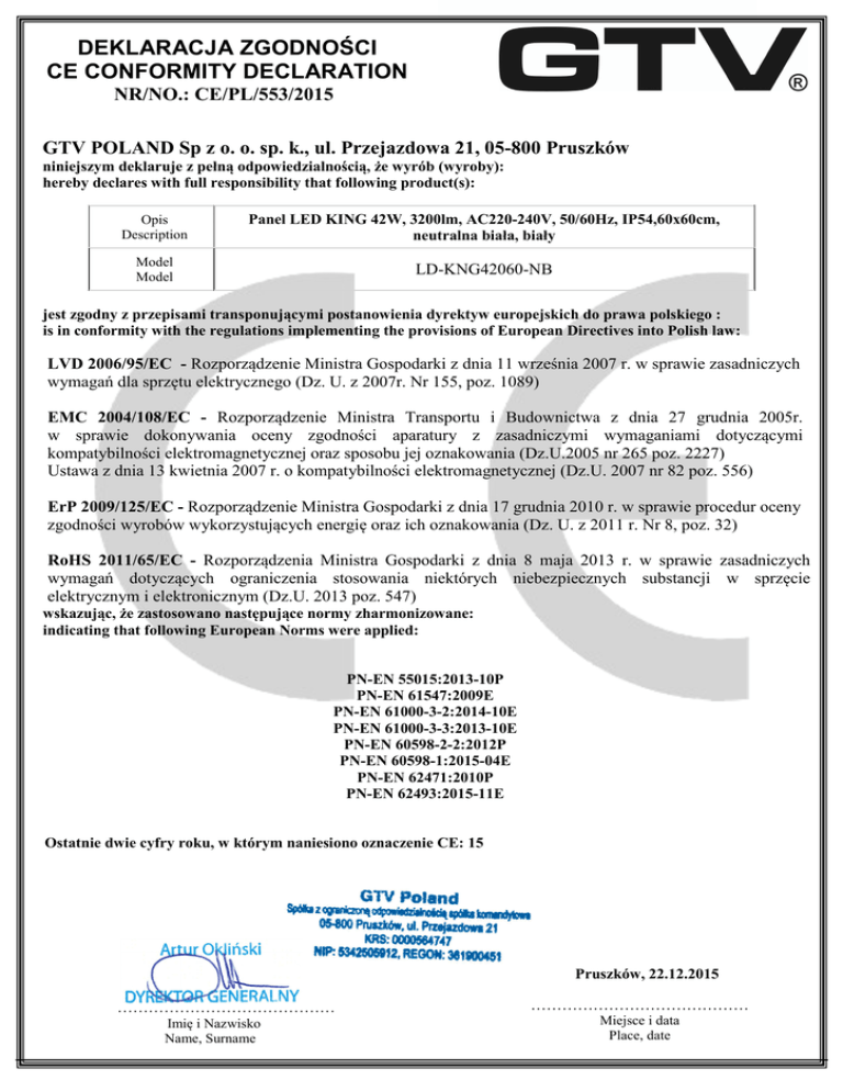 DEKLARACJA ZGODNOŚCI CE CONFORMITY DECLARATION NR/NO.: CE/PL/553/2015 GTV POLAND Sp z o. o. sp. k., ul. Przejazdowa 21, 05-800 Pruszków niniejszym deklaruje z pełną odpowiedzialnością, że wyrób (wyroby): hereby declares with full responsibility that following product(s): Opis Description Panel LED KING 42W, 3200lm, AC220-240V, 50/60Hz, IP54,60x60cm, neutralna biała, biały Model Model LD-KNG42060-NB jest zgodny z przepisami transponującymi postanowienia dyrektyw europejskich do prawa polskiego : is in conformity with the regulations implementing the provisions of European Directives into Polish law: LVD 2006/95/EC - Rozporządzenie Ministra Gospodarki z dnia 11 września 2007 r. w sprawie zasadniczych wymagań dla sprzętu elektrycznego (Dz. U. z 2007r. Nr 155, poz. 1089) EMC 2004/108/EC - Rozporządzenie Ministra Transportu i Budownictwa z dnia 27 grudnia 2005r. w sprawie dokonywania oceny zgodności aparatury z zasadniczymi wymaganiami dotyczącymi kompatybilności elektromagnetycznej oraz sposobu jej oznakowania (Dz.U.2005 nr 265 poz. 2227) Ustawa z dnia 13 kwietnia 2007 r. o kompatybilności elektromagnetycznej (Dz.U. 2007 nr 82 poz. 556) ErP 2009/125/EC - Rozporządzenie Ministra Gospodarki z dnia 17 grudnia 2010 r. w sprawie procedur oceny zgodności wyrobów wykorzystujących energię oraz ich oznakowania (Dz. U. z 2011 r. Nr 8, poz. 32) RoHS 2011/65/EC - Rozporządzenia Ministra Gospodarki z dnia 8 maja 2013 r. w sprawie zasadniczych wymagań dotyczących ograniczenia stosowania niektórych niebezpiecznych substancji w sprzęcie elektrycznym i elektronicznym (Dz.U. 2013 poz. 547) wskazując, że zastosowano następujące normy zharmonizowane: indicating that following European Norms were applied: PN-EN 55015:2013-10P PN-EN 61547:2009E PN-EN 61000-3-2:2014-10E PN-EN 61000-3-3:2013-10E PN-EN 60598-2-2:2012P PN-EN 60598-1:2015-04E PN-EN 62471:2010P PN-EN 62493:2015-11E Ostatnie dwie cyfry roku, w którym naniesiono oznaczenie CE: 15 Pruszków, 22.12.2015 …………………………………… Imię i Nazwisko Name, Surname …………………………………… Miejsce i data Place, date