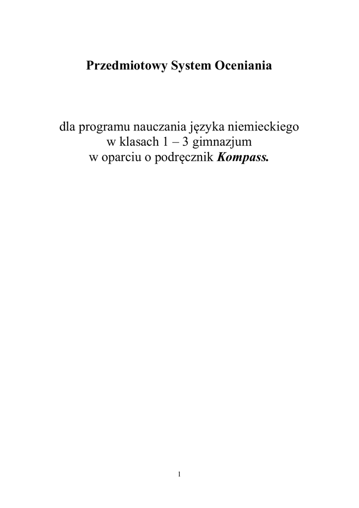Przedmiotowy System Oceniania dla programu nauczania języka niemieckiego w klasach 1 – 3 gimnazjum w oparciu o podręcznik Kompass. 1 Przedmiotowy system oceniania z języka niemieckiego dla klasy 1 gimnazjum Podstawą Przedmiotowego Systemu Oceniania z języka niemieckiego na poziomie klasy 1 gimnazjum jest program nauczania języka niemieckiego, realizowany w oparciu o podręcznik Kompass 1 Neu. Zgodnie z nim uczeń powinien: 1. poznawać słownictwo związane z następującymi tematami: Kontakty: • słownictwo związane z przedstawianiem się (imię i nazwisko, wiek, kraj pochodzenia, miejsce zamieszkania) • określenie zainteresowań • cechy charakteru • liczebniki główne 1-20 • formy powitania i pożegnania • nazwy krajów niemieckojęzycznych Rodzina: • nazwy członków rodziny • określenia osób: kobieta, mężczyzna, dziecko, dziewczyna, chłopiec • przymiotniki określające cechy zewnętrzne i wewnętrzne osób • nazwy zwierząt • liczebniki 20-100 • kolory • określenia zainteresowań • zwroty określające pochwałę, dezaprobatę i neutralność Czas wolny: • czas zegarowy • czynności w poszczególnych porach dnia • dni tygodnia • nazwy obiektów w mieście • nazwy imprez kulturalnych • nazwy przedmiotów szkolnych • słownictwo określające reakcję na propozycję Szkoła: • nazwy przedmiotów szkolnych • nazwy ocen • cechy charakteru • nazwy przyborów szkolnych • określenie upodobań Jedzenie: • nazwy potraw i napojów • nazwy artykułów spożywczych • nazwy owoców i warzyw • określenie miary i wagi • nazwy opakowań 2. ćwiczyć umiejętności w zakresie czterech podstawowych sprawności językowych, obejmujących: A. rozumienie tekstu słuchanego, w ramach którego uczeń potrafi: • zrozumieć polecenia i instrukcje nauczyciela związane z sytuacją w klasie 2 • zrozumieć globalnie i selektywnie sens słuchanych tekstów: potrafi określić główną myśl tekstu, zrozumieć ogólny sens usłyszanej sytuacji komunikacyjnej, a także wyszukać ważne dla siebie informacje oraz stwierdzić, która z podanych informacji jest prawdziwa, a która fałszywa • zrozumieć pytania, polecenia i wypowiedzi, zawierające poznany materiał leksykalno gramatyczny w ramach danego zakresu tematycznego • rozpoznać ze słuchu poznane słowa i wyrażenia • powtórzyć głoski, wyrazy i zdania według usłyszanego wzoru B. mówienie, w ramach którego uczeń potrafi: • udzielać i uzyskiwać informacje, dotyczące: danych osobowych (imię i nazwisko, wiek, kraj pochodzenia, miejsce zamieszkania), a także zainteresowań, rodziny i rodzeństwa, czasu/ aktualnej godziny, przebiegu dnia, zajęciach szkolnych/ planu lekcji, miejsca spotkania, klasy, upodobań kulinarnych • opowiadać o: sobie, swoich i innych zainteresowaniach, swojej rodzinie, przebiegu dnia, zajęciach w ciągu tygodnia, klasie, ulubionych potrawach • opisywać: swój plan lekcji, wyglądu i charakteru ludzi i zwierząt, upodobania swoje i innych osób • opowiadać na podstawie notatki • przedstawiać siebie i inne osoby • rozpoczynać, podtrzymywać i kończyć rozmowę • witać i żegnać osoby • wyrażać opinię o innych osobach • podawać aktualną godzinę oraz czas trwania danej czynności • proponować wspólne wyjście • przyjmować lub odrzucać propozycję • wyrażać prośbę • uzasadniać swoje zdanie • udzielać rad • zamawiać jedzenie w restauracji • uczestniczyć w sytuacjach dialogowych C. rozumienie tekstu czytanego, gdzie uczeń: • rozumie pojedyncze słowa, zwroty, wyrażenia i zdania, związane z danym tematem • rozumie polecenia w podręczniku i zeszycie ćwiczeń • rozumie globalnie i selektywnie teksty o znanej tematyce i strukturach gramatycznych (krótkie opisy, dialogi, notatki, opowiadania, ogłoszenia, teksty informacyjne, e-mail, listy, wywiady, ankiety, formularze, przepisy kulinarne, menu w restauracji) • potrafi wyszukać w tekście pożądane informacje • potrafi określić główną myśl tekstu • potrafi ogólnie zrozumieć dłuższe teksty, posługując się słownikiem dwujęzycznym • potrafi poprawnie odczytać tekst • potrafi uporządkować elementy tekstu • potrafi odczytywać dane statystyczne • potrafi przyporządkować elementy tekstu materiałowi obrazkowemu D. pisanie, gdzie uczeń potrafi: • rozpoznawać różnice między fonetyczną a graficzną formą wyrazu • pisać pojedyncze wyrazy, zwroty i wyrażenia oraz zdania • napisać prosty tekst użytkowy, jak: list/ e-mail, notatkę, ogłoszenie, listę zakupów, przepis kulinarny, opis • wypełnić formularz, ankietę • odpowiedzieć pisemnie na pytania do czytanego lub słuchanego tekstu, będące sprawdzeniem jego zrozumienia • ułożyć zdania, wyrazy z rozsypanki wyrazowej, literowej • uzupełnić brakujące litery w wyrazach oraz wyrazy w zdaniach • uzupełniać dialogi pojedynczymi słowami lub zdaniami • tworzyć krótkie opisy i opowiadania na podstawie materiału obrazkowego, audio oraz 3 notatek • rozwiązać test sprawdzający 3. poznawać i stosować struktury gramatyczne: • odmiana czasowników regularnych w l. pojedynczej i mnogiej • czasowniki: sein, heiβen • zaimki pytające • szyk prosty w zdaniu • szyk przestawny w zdaniu • zdania pytające z zaimkami pytającymi i tworzone przez inwersję • zaimek osobowy w mianowniku i bierniku • przeczenie nicht • przeczenie kein w mianowniku i bierniku • forma grzecznościowa Sie • rodzajnik określony i nieokreślony w mianowniku i bierniku • określenie przynależności z przyimkiem von • zaimek dzierżawczy w mianowniku i bierniku • dopełnienie w bierniku • odmiana czasowników nieregularnych essen, sprechen, lesen, fahren, schlafen, laufen • odmiana czasowników rozdzielnie złożonych • pytanie wohin? • przyimki in i auf z biernikiem • odmiana czasownika möchte i szyk zdani