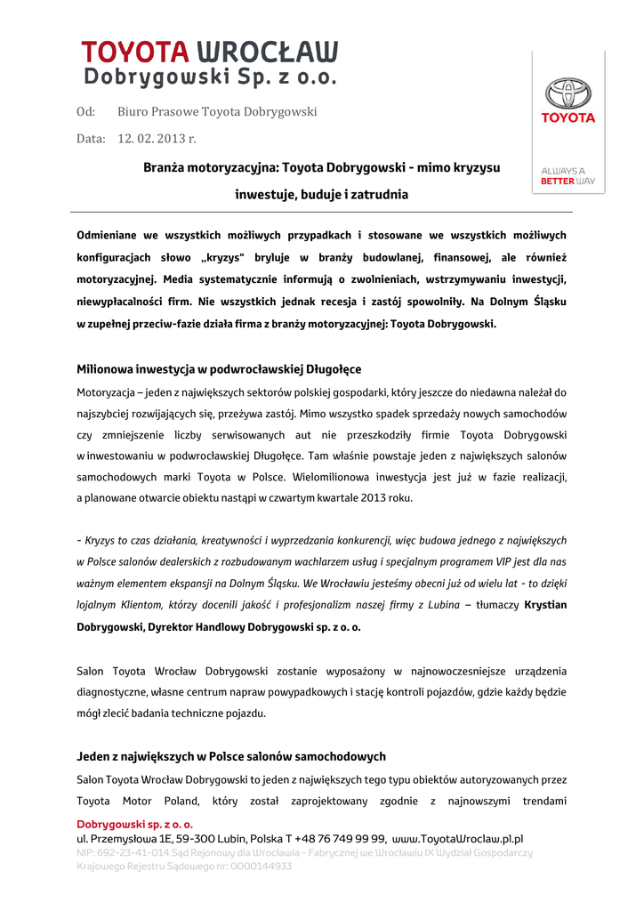 Od: Biuro Prasowe Toyota Dobrygowski Data: 12. 02. 2013 r. Branża motoryzacyjna: Toyota Dobrygowski - mimo kryzysu inwestuje, buduje i zatrudnia Odmieniane we wszystkich możliwych przypadkach i stosowane we wszystkich możliwych konfiguracjach słowo „kryzys“ bryluje w branży budowlanej, finansowej, ale również motoryzacyjnej. Media systematycznie informują o zwolnieniach, wstrzymywaniu inwestycji, niewypłacalności firm. Nie wszystkich jednak recesja i zastój spowolniły. Na Dolnym Śląsku w zupełnej przeciw-fazie działa firma z branży motoryzacyjnej: Toyota Dobrygowski. Milionowa inwestycja w podwrocławskiej Długołęce Motoryzacja – jeden z największych sektorów polskiej gospodarki, który jeszcze do niedawna należał do najszybciej rozwijających się, przeżywa zastój. Mimo wszystko spadek sprzedaży nowych samochodów czy zmniejszenie liczby serwisowanych aut nie przeszkodziły firmie Toyota Dobrygowski w inwestowaniu w podwrocławskiej Długołęce. Tam właśnie powstaje jeden z największych salonów samochodowych marki Toyota w Polsce. Wielomilionowa inwestycja jest już w fazie realizacji, a planowane otwarcie obiektu nastąpi w czwartym kwartale 2013 roku. - Kryzys to czas działania, kreatywności i wyprzedzania konkurencji, więc budowa jednego z największych w Polsce salonów dealerskich z rozbudowanym wachlarzem usług i specjalnym programem VIP jest dla nas ważnym elementem ekspansji na Dolnym Śląsku. We Wrocławiu jesteśmy obecni już od wielu lat - to dzięki lojalnym Klientom, którzy docenili jakość i profesjonalizm naszej firmy z Lubina – tłumaczy Krystian Dobrygowski, Dyrektor Handlowy Dobrygowski sp. z o. o. Salon Toyota Wrocław Dobrygowski zostanie wyposażony w najnowoczesniejsze urządzenia diagnostyczne, własne centrum napraw powypadkowych i stację kontroli pojazdów, gdzie każdy będzie mógł zlecić badania techniczne pojazdu. Jeden z największych w Polsce salonów samochodowych Salon Toyota Wrocław Dobrygowski to jeden z największych tego typu obiektów autoryzowanych przez Toyota Motor Poland, który został zaprojektowany zgodnie z najnowszymi trendami Dobrygowski sp. z o. o. ul. Przemysłowa 1E, 59-300 Lubin, Polska T +48 76 749 99 99, www.ToyotaWroclaw.pl.pl NIP: 692-23-41-014 Sąd Rejonowy dla Wrocławia - Fabrycznej we Wrocławiu IX Wydział Gospodarczy Krajowego Rejestru Sądowego nr: 0000144933 Od: Biuro Prasowe Toyota Dobrygowski Data: 12. 02. 2013 r. Branża motoryzacyjna: Toyota Dobrygowski - mimo kryzysu inwestuje, buduje i zatrudnia architektonicznymi. Na powierzchni 4000 m² zlokalizowanych będzie aż 20 stanowisk obsługowych serwisu, dwie poczekalnie dla Klientów, restauracja, centrum samochodów nowych i używanych, dział obsługi flotowej, dział kredytów i ubezpieczeń, dział blacharsko-lakierniczy i myjnia. Niespotykane usługi na wyciągnięcie ręki Mimo iż salon zostanie otwarty dopiero 1 października 2013 roku, już od stycznia działa witryna internetowa www.ToyotaWroclaw.pl uruchomiona na potrzeby kontaktów z mediami, rekrutacji oraz prezentacji usług oferowanych wrocławskim klientom. A oferta już teraz jest bogata w korzyści: „Pakiet VIP“, który wyróżnia tych, którzy zaufają firmie już teraz, możliwość umówienia się na prezentację i jazdę próbną wybranym modelem samochodu w dogodnym miejscu i dogodnym czasie czy pakiet o nazwie „Serwis blacharsko-lakierniczy door to door“, który w przypadku szkody komunikacyjnej gwarantuje, że Toyota Dobrygowski wszystko załatwi bezgotówkowo, zapewni samochód zastępczy, naprawi uszkodzony pojazd i dostarczy w wybrane miejsce. Nowa i wyjątkowa oferta obsługi klientów flotowych, która nareszcie będzie dostępna stacjonarnie na rynku wrocławskim to kolejna niespotykana usługa świadczona w ramach programu Toyota CorpoCars Management. Stabilność, fachowość i rzetelność Toyoty Dobrygowski rekomendują zadowoleni klienci indywidualni i firmowi, których referencje widnieją na stronie www w zakładce „Rekomendacje“. Znajdują się tam opinie Wrocławian, którzy zaufali marce Toyota Dobrygowski i od wielu lat pokonują trasę WrocławLubin-Wrocław, aby skorzystać z najwyższej jakości usług, zaangażowania oraz indywidualnego podejście do każdego klienta. Rekrutacja trwa! - Spowolnienie i stagnacja w polskiej gospodarce nie powstrzymuje nas przed rozwojem. Planujemy docelowo zatrudnić prawie 100 osób, co daje szansę na pobudzanie innowacyjności i przedsiębiorczości w okolicach Wrocławia. Szukamy kadry zarządzającej, doradców ds. sprzedaży samochodów, serwisantów, mechaników, lakierników, blacharzy itd. Pełna oferta rekrutacyjna znajduje się na naszej stronie www.ToyotaWroclaw.pl Dobrygowski sp. z o. o. ul. Przemysłowa 1E, 59-300 Lubin, Polska T +48 76 749 99 99, www.ToyotaWroclaw.pl.pl NIP: 692-23-41-014 Sąd Rejonowy dla Wrocławia - Fabrycznej we Wrocławiu IX Wydział Gospodarczy Krajowego Rejestru Sądowego nr: 0000144933 Od: Biuro Prasowe Toyota Dobrygowski Data: 12. 02. 2013 r. Branża motoryzacyjna: Toyota Dobrygowski - mimo kryzysu inwestuje, buduje i zatrudnia w zakładce Rekrutacja – wyjaśnia Grzegorz Dobrygowski, Dyrektor Techniczny i Członek Zarządu firmy. Czekamy na ludzi otwartych na zmiany, nastawionych na tworzenie niestandardowych rozwiązań, którzy z entuzjazmem podejmują nowe wyzwania. Ludzi, dla których ważna jest współpraca w realizacji założonych celów i nasze hasło: Toyota Wrocław Dobrygowski - Z pasją dla Ciebie! – dodaje. Dobrygowski sp. z o. o. to jeden z pierwszych dealerów Toyoty w Polce, działający od ponad 30 lat i trzykrotnie nagrodzony statuetkę Dealera Roku. Laureat licznych wyróżnień i nagród, działający zgodnie z przyznanymi certyfikatami ISO 9001 i 14001. Oferuje sprzedaż samochodów nowych, używanych, części zamiennych i akcesoriów, usługi w serwisie blacharsko-lakierniczym, mechanicznym i finansowy oraz obsł
