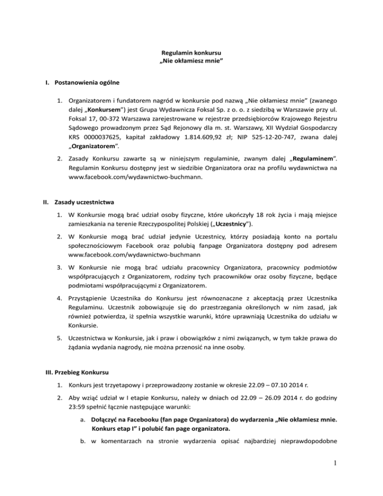 Regulamin konkursu „Nie okłamiesz mnie” I. Postanowienia ogólne 1. Organizatorem i fundatorem nagród w konkursie pod nazwą „Nie okłamiesz mnie” (zwanego dalej „Konkursem”) jest Grupa Wydawnicza Foksal Sp. z o. o. z siedzibą w Warszawie przy ul. Foksal 17, 00-372 Warszawa zarejestrowane w rejestrze przedsiębiorców Krajowego Rejestru Sądowego prowadzonym przez Sąd Rejonowy dla m. st. Warszawy, XII Wydział Gospodarczy KRS 0000037625, kapitał zakładowy 1.814.609,92 zł; NIP 525-12-20-747, zwana dalej „Organizatorem”. 2. Zasady Konkursu zawarte są w niniejszym regulaminie, zwanym dalej „Regulaminem”. Regulamin Konkursu dostępny jest w siedzibie Organizatora oraz na profilu wydawnictwa na www.facebook.com/wydawnictwo-buchmann. II. Zasady uczestnictwa 1. W Konkursie mogą brać udział osoby fizyczne, które ukończyły 18 rok życia i mają miejsce zamieszkania na terenie Rzeczypospolitej Polskiej („Uczestnicy”). 2. W Konkursie mogą brać udział jedynie Uczestnicy, którzy posiadają konto na portalu społecznościowym Facebook oraz polubią fanpage Organizatora dostępny pod adresem www.facebook.com/wydawnictwo-buchmann 3. W Konkursie nie mogą brać udziału pracownicy Organizatora, pracownicy podmiotów współpracujących z Organizatorem, rodziny tych pracowników oraz osoby fizyczne, będące podmiotami współpracującymi z Organizatorem. 4. Przystąpienie Uczestnika do Konkursu jest równoznaczne z akceptacją przez Uczestnika Regulaminu. Uczestnik zobowiązuje się do przestrzegania określonych w nim zasad, jak również potwierdza, iż spełnia wszystkie warunki, które uprawniają Uczestnika do udziału w Konkursie. 5. Uczestnictwa w Konkursie, jak i praw i obowiązków z nimi związanych, w tym także prawa do żądania wydania nagrody, nie można przenosić na inne osoby. III. Przebieg Konkursu 1. Konkurs jest trzyetapowy i przeprowadzony zostanie w okresie 22.09 – 07.10 2014 r. 2. Aby wziąć udział w I etapie Konkursu, należy w dniach od 22.09 – 26.09 2014 r. do godziny 23:59 spełnić łącznie następujące warunki: a. Dołączyć na Facebooku (fan page Organizatora) do wydarzenia „Nie okłamiesz mnie. Konkurs etap I” i polubić fan page organizatora. b. w komentarzach na stronie wydarzenia opisać najbardziej nieprawdopodobne 1 kłamstwo, jakie zdarzyło się Uczestnikowi Konkursu usłyszeć. Zgłoszenia uczestnictwa w Konkursie, które dotrą po terminie wskazanym w pkt III.2 powyżej nie będą uwzględniane w Konkursie. 3. I etap konkursu zostanie zakończony przyznaniem nagrody książkowej 2 osobom (2 egzemplarze książki „Nie okłamiesz mnie”). Nagrody trafią do osób wybranych przez jury konkursowe składające się z 3 przedstawicieli organizatora. 4. Do II etapu Konkursu przejdą wszyscy Uczestnicy etapu I. 5. Zadanie w ramach II etapu Konkursu polega na opublikowaniu na stronie wydarzenia „Nie okłamiesz mnie”. Konkurs, etap II” zdjęcia pokazującego jedną z 7 podstawowych emocji, które widać na twarzy. Fotografię należy opublikowac do dnia 02.10.2014 r. do godz. 23:59. 6. II etap konkursu zostanie zakończony przyznaniem nagrody książkowej 2 osobom (2 egzemplarze książki „Nie okłamiesz mnie”). Nagrody trafią do osób wybranych przez jury konkursowe składające się z 3 przedstawicieli organizatora. 7. Do III etapu Konkursu przejdą wszyscy Uczestnicy. 8. Zadanie w ramach III etapu Konkursu polega na opublikowaniu na stronie wydarzenia „Nie okłamiesz mnie. Konkurs etap III” wpisu będącego odpowiedzią na pytanie: „Dlaczego właśnie Ty powinieneś wygrać główną nagrodę tj. szkolenie w Body Language Institute Polska”. Odpowiedź na pytanie należy opublikowac do dnia 06.10.2014 r. do godz. 23:59. 9. Po opublikowaniu odpowiedzi, Uczestnik nie może wprowadzać żadnych zmian w zakresie przesłanej odpowiedzi konkursowej. IV. Nagrody oraz zasady ich przyznawania 1. Zwycięzcą Konkursu zostanie Uczestnik, który wziął udział we wszystkich trzech etapach konkursu. Zostanie on subiektywnie wybrany przez jury składające się z 3 osób reprezentujących organizatora. Jednocześnie na każdym etapie konkursu zostaną przyznane nagrody książkowe – na każdym etapie 2 książki, czyli łącznie 6 książek. . 2. Nagrodami w Konkursie są: a. nagroda główna: trening umiejętności czytania mowy ciała oraz wykrywania kłamstwa ufundowany przez Organizatora, który odbędzie się w Body Language Institute Polska (opis treningu znajduje się pod adresem: http://bodylanguageinstitute.pl/szkolenia/szkoleniaotwarte/mowa-ciala). Termin treningu zostanie ustalony indywidualnie z Body Language Institute Polska. b. nagrody dodatkowe dla 6 osób: egzemplarz książki „Nie okłamiesz mnie”. 3. Konkurs zostanie rozstrzygnięty w dniu 07.10.2014 r. Lista zwycięzców i tym samym zdobywców nagród: głównej oraz nagród dodatkowych zostanie opublikowane na stronie internetowej gwfoksal.pl oraz na stronie Facebook.com/wydawnictwo-buchmann. 4. Organizator nie ponosi odpowiedzialności w przypadku niemożności wydania nagród zwycięzcom z powodu: 2 a. niekompletnego lub nieczytelnego zgłoszenia konkursowego, b. niemożliwości kontaktu ze odpowiedzialność, zwycięzcą, z przyczyn, za które ten ponosi 5. W takich przypadkach nagrody otrzymają kolejni Uczestnicy wytypowani przez Organizatora. 6. Organizator nie ponosi odpowiedzialności za niemożność przekazania lub skorzystania z nagrody z powodu siły wyższej. 7. Poza nagrodą określoną w pkt IV.2 a zwycięzca konkursu otrzyma nagrodę pieniężną w wysokości 311,11 zł (łączna wartość nagrody dla zwycięzcy to 3.111,11 zł). Organizator potrąci część pieniężną nagrody (kwota 311,11 zł ) z należnym od zwycięzcy 10% podatkiem dochodowym od osób fizycznych, o którym mowa w art. 41 ust. 7 Ustawy o podatku dochodowym od osób fizycznych. 8. Dokładny termin i miejsce wydania – odbioru nagrody głównej o