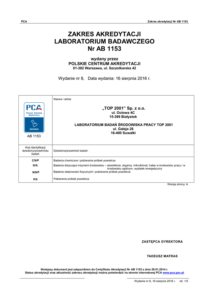 PCA Zakres akredytacji Nr AB 1153 ZAKRES AKREDYTACJI LABORATORIUM BADAWCZEGO Nr AB 1153 wydany przez POLSKIE CENTRUM AKREDYTACJI 01-382 Warszawa, ul. Szczotkarska 42 Wydanie nr 8, Data wydania: 16 sierpnia 2016 r. Nazwa i adres „TOP 2001” Sp. z o.o. ul. Octowa 4C 15-399 Białystok AB 1153 Kod identyfikacji dziedziny/przedmiotu badań LABORATORIUM BADAŃ ŚRODOWISKA PRACY TOP 2001 ul. Gałaja 26 16-400 Suwałki Dziedzina/przedmiot badań: C/9/P Badania chemiczne i pobieranie próbek powietrza G/9; Badania dotyczące inżynierii środowiska – oświetlenie, drgania, mikroklimat, hałas w środowisku pracy i w środowisku ogólnym, wydatek energetyczny Badania właściwości fizycznych i pobieranie próbek powietrza N/9/P P/9 Pobieranie próbek powietrza Wersja strony: A ZASTĘPCA DYREKTORA TADEUSZ MATRAS Niniejszy dokument jest załącznikiem do Certyfikatu Akredytacji Nr AB 1153 z dnia 29.01.2014 r. Status akredytacji oraz aktualność zakresu akredytacji można potwierdzić na stronie internetowej PCA www.pca.gov.pl Wydanie nr 8, 16 sierpnia 2016 r. str. 1/5 PCA Zakres akredytacji Nr AB 1153 Laboratorium Badań Środowiska Pracy TOP 2001 ul. Gałaja 26, 16-400 Suwałki Przedmiot badań/wyrób Środowisko pracy – oświetlenie elektryczne we wnętrzach Środowisko pracy - oświetlenie awaryjne we wnętrzach Środowisko pracy - hałas Środowisko pracy – mikroklimat umiarkowany Środowisko pracy – mikroklimat gorący Rodzaj działalności/ badane cechy/metoda Natężenie oświetlenia Zakres: (5 - 10000) lx Metoda pomiarowa bezpośrednia Równomierność oświetlenia (z obliczeń) Natężenie oświetlenia Zakres: (0,5 - 200) lx Metoda pomiarowa bezpośrednia Równoważny poziom dźwięku A Maksymalny poziom dźwięku A Zakres: (40 - 136) dB Szczytowy poziom dźwięku C Zakres: (42 - 135) dB Metoda pomiarowa bezpośrednia Ekspozycja na hałas odniesiona do - 8-godzinnego dobowego wymiaru czasu pracy - tygodnia pracy (z obliczeń) Temperatura powietrza Zakres: (0,0 - 30,0) °C Temperatura poczernionej kuli Zakres: (0,0 - 30,0) °C Wilgotność Zakres: (29,2 - 85,1) % Prędkość powietrza Zakres: (0,10 - 5,00) m/s Metoda pomiarowa bezpośrednia Wskaźnik PMV Wskaźnik PPD (z obliczeń) Temperatura powietrza Zakres: (10,0 - 42,0) °C Temperatura wilgotna naturalna Zakres: (10,0 - 42,0) °C Temperatura poczernionej kuli Zakres: (10,0 - 42,0) °C Metoda pomiarowa bezpośrednia Wskaźnik WBGT (z obliczeń) Dokumenty odniesienia PB 01-06 wydanie z dnia 01.10.2015 r. PN-EN 1838:2005 PN-N-01307:1994 PN-EN ISO 9612:2011 z wyłączeniem metody obejmującej strategię 2 i 3 - punkt 10 i 11 PB 05-03 wydanie z dnia 01.10.2015 r. PN-EN 27243: 2005 Wersja strony: A Wydanie nr 8, 16 sierpnia 2016 r. str. 2/5 PCA Zakres akredytacji Nr AB 1153 Przedmiot badań/wyrób Środowisko pracy – mikroklimat zimny Środowisko pracy – drgania mechaniczne działające na organizm człowieka przez kończyny górne Środowisko pracy – drgania mechaniczne o ogólnym działaniu na organizm człowieka Rodzaj działalności/ badane cechy/metoda Temperatura powietrza Zakres: (-5,1 - 10,0) °C Temperatura poczernionej kuli Zakres: (-5,1 - 10,0) °C Wilgotność powietrza Zakres: (29,2 - 85,1) % Prędkość powietrza Zakres: (0,10 - 5,00) m/s Metoda pomiarowa bezpośrednia Wskaźnik IREQmin Wskaźnik twc (z obliczeń) Skuteczne ważone częstotliwościowo przyspieszenie drgań Zakres: (0,2 - 100) ms-2 Metoda pomiarowa bezpośrednia Ekspozycja dzienna, wyrażona w postaci równoważnej energetycznie dla 8 godzin działania sumy wektorowej skutecznych ważonych częstotliwościowo przyśpieszeń drgań, wyznaczonych dla trzech składowych kierunkowych (ahwx, ahwy, ahwz) Ekspozycja trwająca 30 minut i krócej, wyrażona w postaci sumy wektorowej skutecznych ważonych częstotliwościowo przyśpieszeń drgań, wyznaczonych dla trzech składowych kierunkowych (ahwx, ahwy, ahwz) (z obliczeń) Skuteczne ważone częstotliwościowo przyspieszenie drgań Zakres: (0,02 - 100) ms-2 Metoda pomiarowa bezpośrednia Dokumenty odniesienia PN-EN ISO 11079:2008 PN-EN ISO 5349-1:2004 PN-EN ISO 5349-2:2004 PN-EN ISO 5349-2:2004/A1:2015-11 PN-EN 14253+A1:2011 Ekspozycja dzienna, wyrażona w postaci równoważnego energetycznie dla 8 godzin działania skutecznego ważonego częstotliwościowo przyśpieszenia drgań, dominującego wśród przyśpieszeń drgań wyznaczonych dla trzech składowych kierunkowych z uwzględnieniem właściwych współczynników (1,4 awx, 1,4awy, awz) Ekspozycja trwająca 30 minut i krócej, wyrażona w postaci skutecznego ważonego częstotliwościowo przyśpieszenia drgań, dominującego wśród przyspieszeń drgań wyznaczonych dla trzech składowych kierunkowych z uwzględnieniem właściwych współczynników (1,4awx, 1,4awy, awz) (z obliczeń) Wersja strony: A Wydanie nr 8, 16 sierpnia 2016 r. str. 3/5 PCA Zakres akredytacji Nr AB 1153 Przedmiot badań/wyrób Środowisko pracy - powietrze Środowisko pracy - pyły Środowisko pracy - wydatek energetyczny Środowisko ogólne - hałas pochodzący od instalacji, urządzeń i zakładów przemysłowych Rodzaj działalności/ badane cechy/metoda Pobieranie próbek w celu oceny narażenia zawodowego na: – pyły przemysłowe frakcja wdychalna frakcja respirabilna – substancje organiczne frakcja wdychalna – substancje nieorganiczne frakcja wdychalna frakcja respirabilna – metale frakcja wdychalna frakcja respirabilna Metoda dozymetrii indywidualnej Wskaźnik narażenia (z obliczeń) Stężenie pyłu – frakcja wdychalna Zakres: (0,19 - 20,00) mg/m 3 Metoda filtracyjno-wagowa Stężenie pyłu – frakcja respirabilna Zakres: (0,15 - 7,30) mg/m3 Metoda filtracyjno-wagowa Stężenie gazów Zakres: CO (5,0 - 125) mg/m3 NO (0,87 - 12,5) mg/m3 NO2 (0,38 - 19,3) mg/m3 Metoda elektrochemiczna Stężenie tlenków żelaza - w przeliczeniu na Fe – frakcja respirabilna Zakres (0,07 - 34,72) mg/m3 Metoda spektrofotometryczna Stężenie manganu i jego związków n