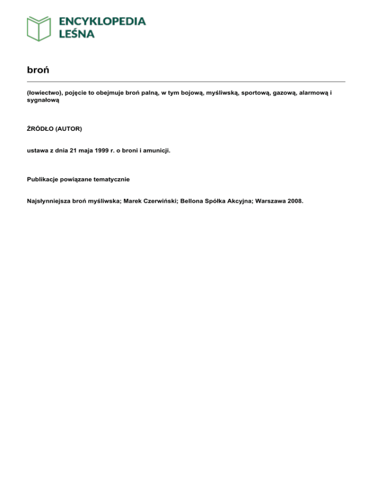 broń (łowiectwo), pojęcie to obejmuje broń palną, w tym bojową, myśliwską, sportową, gazową, alarmową i sygnałową ŹRÓDŁO (AUTOR) ustawa z dnia 21 maja 1999 r. o broni i amunicji. Publikacje powiązane tematycznie Najsłynniejsza broń myśliwska; Marek Czerwiński; Bellona Spółka Akcyjna; Warszawa 2008.