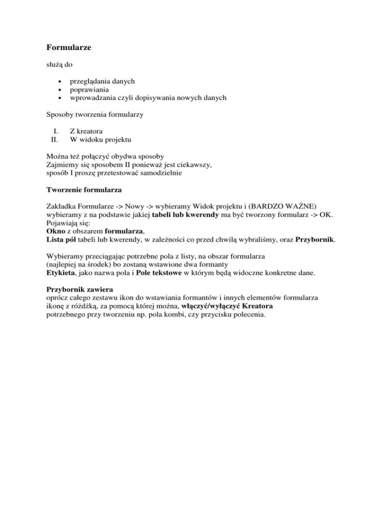 Formularze służą do • • • przeglądania danych poprawiania wprowadzania czyli dopisywania nowych danych Sposoby tworzenia formularzy I. II. Z kreatora W widoku projektu Można też połączyć obydwa sposoby Zajmiemy się sposobem II ponieważ jest ciekawszy, sposób I proszę przetestować samodzielnie Tworzenie formularza Zakładka Formularze -> Nowy -> wybieramy Widok projektu i (BARDZO WAŻNE) wybieramy z na podstawie jakiej tabeli lub kwerendy ma być tworzony formularz -> OK. Pojawiają się: Okno z obszarem formularza, Lista pól tabeli lub kwerendy, w zależności co przed chwilą wybraliśmy, oraz Przybornik. Wybieramy przeciągając potrzebne pola z listy, na obszar formularza (najlepiej na środek) bo zostaną wstawione dwa formanty Etykieta, jako nazwa pola i Pole tekstowe w którym będą widoczne konkretne dane. Przybornik zawiera oprócz całego zestawu ikon do wstawiania formantów i innych elementów formularza ikonę z różdżką, za pomocą której można, włączyć/wyłączyć Kreatora potrzebnego przy tworzeniu np. pola kombi, czy przycisku polecenia. Pola kombi w formularzu ułatwiają wprowadzanie danych do tabel. Są to pola z rozwijalną listą wartości z pośród których wybieramy jedną lub wpisujemy zupełnie nową wartość Zanim zaczniemy wstawiać do formularza pole kombi należy najpierw przygotować: -(źródło)* tabelę z jedną tylko kolumną, bez klucza podstawowego, w której będą wszystkie wartości do przyszłego pola kombi -(miejsce docelowe)** trzeba utworzyć dodatkowe pole w tabeli z której tworzymy formularz, po to aby było gdzie przechowywać dane wprowadzone za pomocą tego pola kombi. Teraz dopiero można wstawiać w formularzu pole kombi Zakładka formularze->... jak było podane wcześniej (Tworzenie takigo pola - najwygodniej przy włączonej ikonie różdżki czyli przy włączonym Kreatorze formantów.) Z przybornika wybieramy ikonę Pole kombi i w odpowiednim miejscu formularza rozciągamy obszar jaki pole to ma zajmować. W tym momencie powinien włączyć się Kreator, z którym na pewno uda się wstawić pole kombi, proszę tylko dokładnie czytać pytania. PRZYKŁAD pola kombi które pomoże wypełnić w tabeli Książki nowe pole Gatunek literacki z możliwymi wpisami Epika, Liryka, Dramat mamy już przygotowane źródło* i miejsce docelowe** w Kreatorze będą potrzebne następujące wpisy W pierwszym oknie kreatora W przedostatnim oknie kreatora