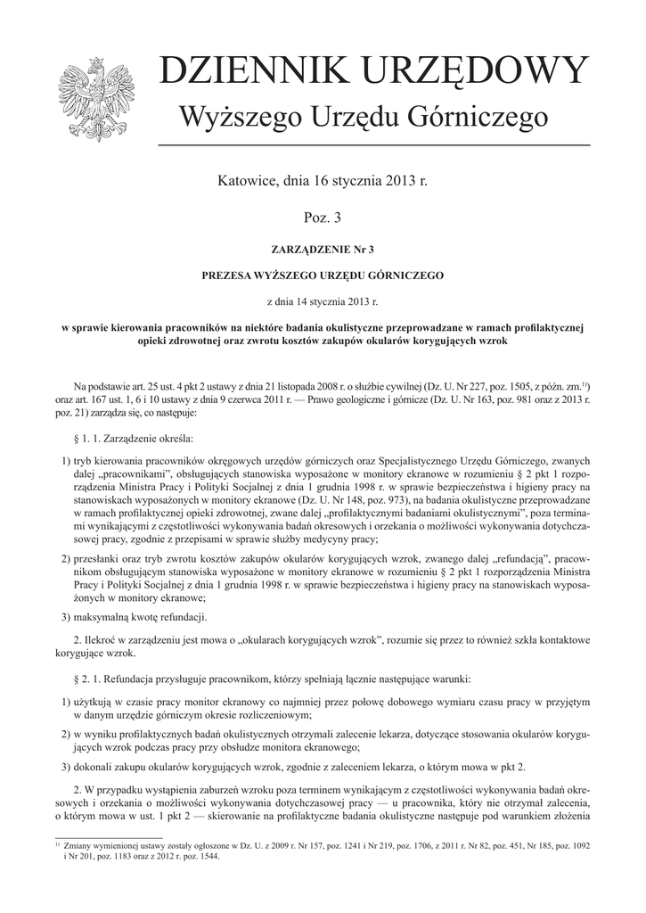 DZIENNIK URZĘDOWY Wyższego Urzędu Górniczego Katowice, dnia 16 stycznia 2013 r. Poz. 3 ZARZĄDZENIE Nr 3 PREZESA WYŻSZEGO URZĘDU GÓRNICZEGO z dnia 14 stycznia 2013 r. w sprawie kierowania pracowników na niektóre badania okulistyczne przeprowadzane w ramach profilaktycznej opieki zdrowotnej oraz zwrotu kosztów zakupów okularów korygujących wzrok Na podstawie art. 25 ust. 4 pkt 2 ustawy z dnia 21 listopada 2008 r. o służbie cywilnej (Dz. U. Nr 227, poz. 1505, z późn. zm.1)) oraz art. 167 ust. 1, 6 i 10 ustawy z dnia 9 czerwca 2011 r. — Prawo geologiczne i górnicze (Dz. U. Nr 163, poz. 981 oraz z 2013 r. poz. 21) zarządza się, co następuje: § 1. 1. Zarządzenie określa: 1)tryb kierowania pracowników okręgowych urzędów górniczych oraz Specjalistycznego Urzędu Górniczego, zwanych dalej „pracownikami”, obsługujących stanowiska wyposażone w monitory ekranowe w rozumieniu § 2 pkt 1 rozporządzenia Ministra Pracy i Polityki Socjalnej z dnia 1 grudnia 1998 r. w sprawie bezpieczeństwa i higieny pracy na stanowiskach wyposażonych w monitory ekranowe (Dz. U. Nr 148, poz. 973), na badania okulistyczne przeprowadzane w ramach profilaktycznej opieki zdrowotnej, zwane dalej „profilaktycznymi badaniami okulistycznymi”, poza terminami wynikającymi z częstotliwości wykonywania badań okresowych i orzekania o możliwości wykonywania dotychczasowej pracy, zgodnie z przepisami w sprawie służby medycyny pracy; 2)przesłanki oraz tryb zwrotu kosztów zakupów okularów korygujących wzrok, zwanego dalej „refundacją”, pracownikom obsługującym stanowiska wyposażone w monitory ekranowe w rozumieniu § 2 pkt 1 rozporządzenia Ministra Pracy i Polityki Socjalnej z dnia 1 grudnia 1998 r. w sprawie bezpieczeństwa i higieny pracy na stanowiskach wyposażonych w monitory ekranowe; 3)maksymalną kwotę refundacji. 2. Ilekroć w zarządzeniu jest mowa o „okularach korygujących wzrok”, rozumie się przez to również szkła kontaktowe korygujące wzrok. § 2. 1. Refundacja przysługuje pracownikom, którzy spełniają łącznie następujące warunki: 1)użytkują w czasie pracy monitor ekranowy co najmniej przez połowę dobowego wymiaru czasu pracy w przyjętym w danym urzędzie górniczym okresie rozliczeniowym; 2)w wyniku profilaktycznych badań okulistycznych otrzymali zalecenie lekarza, dotyczące stosowania okularów korygujących wzrok podczas pracy przy obsłudze monitora ekranowego; 3)dokonali zakupu okularów korygujących wzrok, zgodnie z zaleceniem lekarza, o którym mowa w pkt 2. 2. W przypadku wystąpienia zaburzeń wzroku poza terminem wynikającym z częstotliwości wykonywania badań okresowych i orzekania o możliwości wykonywania dotychczasowej pracy — u pracownika, który nie otrzymał zalecenia, o którym mowa w ust. 1 pkt 2 — skierowanie na profilaktyczne badania okulistyczne następuje pod warunkiem złożenia 1) Zmiany wymienionej ustawy zostały ogłoszone w Dz. U. z 2009 r. Nr 157, poz. 1241 i Nr 219, poz. 1706, z 2011 r. Nr 82, poz. 451, Nr 185, poz. 1092 i Nr 201, poz. 1183 oraz z 2012 r. poz. 1544. Dziennik Urzędowy Wyższego Urzędu Górniczego – 2 – Poz. 3 przez pracownika wniosku o takie skierowanie, zawierającego oświadczenie o niemożności wykonywania pracy ze względu na zaburzenia wzroku. 3. Wzór wniosku o skierowanie na profilaktyczne badania okulistyczne, zwanego dalej w ust. 4—6 „wnioskiem”, stanowi załącznik nr 1 do zarządzenia. 4. Do wniosku załącza się zaświadczenie lekarza okulisty potwierdzające zaburzenia wzroku. 5. Wniosek oraz załącznik składa się do służby bezpieczeństwa i higieny pracy w urzędach górniczych, zwanej dalej „służbą BHP”. 6. Służba BHP wyraża opinię dotyczącą zasadności wniosku, a w przypadku: 1)uznania niezasadności wniosku informuje o tym wnioskodawcę i zwraca mu wniosek oraz załącznik; 2)uznania zasadności wniosku przekazuje go do dyrektora urzędu górniczego, w którym jest zatrudniony pracownik, w celu skierowania wnioskodawcy na profilaktyczne badania okulistyczne. § 3. Maksymalna kwota refundacji wynosi 16% minimalnego wynagrodzenia za pracę, ustalonego na podstawie przepisów ustawy z dnia 10 października 2002 r. o minimalnym wynagrodzeniu za pracę (Dz. U. Nr 200, poz. 1679, z 2004 r. Nr 240, poz. 2407 oraz z 2005 r. Nr 157, poz. 1314). § 4. 1. Refundację przyznaje się na wniosek pracownika, nie częściej niż co 2 lata. 2. Do wniosku o przyznanie refundacji, zwanego dalej „wnioskiem”, załącza się następujące dokumenty potwierdzające spełnienie warunków określonych w § 2 ust. 1: 1)zalecenie lekarza przeprowadzającego profilaktyczne badania okulistyczne pracownika, dotyczące stosowania okularów korygujących wzrok podczas pracy przy obsłudze monitora ekranowego, a jeżeli w wyniku badań profilaktycznych pracownik uzyskał zdolność do pracy na okres dłuższy niż 2 lata — kopię tego zalecenia; 2)imienną fakturę VAT lub rachunek, potwierdzające zakup okularów korygujących wzrok, zgodnie z zaleceniem, o którym mowa w pkt 1. 3. Wzór wniosku stanowi załącznik nr 2 do zarządzenia. § 5. 1. Wniosek oraz załączniki składa się do Biura Budżetowo-Finansowego w Wyższym Urzędzie Górniczym, zwanego dalej „BBF”. 2. BBF przekazuje wniosek oraz załączniki służbie BHP. 3. Służba BHP sprawdza zgodność wniosku z przepisami zarządzenia, w szczególności aktualność badań profilaktycznych. 4. W przypadku stwierdzenia: 1)niezgodności wniosku z przepisami zarządzenia służba BHP informuje o tym wnioskodawcę i zwraca mu wniosek oraz załączniki; 2) zgodności wniosku z przepisami zarządzenia służba BHP wprowadza wniosek do ewidencji refundacji i przekazuje go do BBF. 5. BBF dokonuje refundacji w sposób wskazany we wniosku. § 6. 1. Wnioski złożone przed dniem wejścia w życie zarządzenia i nierozpatrzone przed tym terminem podlegają rozpatrzeniu na podstawie przepisów zarządzen