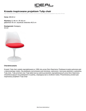 Krzesło inspirowane projektem Tulip chair http://www.idealmeble.pl/pl/offer/material/meble-z-tworzyw-sztucznych/krzeslo-inspirowane-projektem-tulip-chair-04.html/ Cena: 499.00 zł Wymiary: S: 48 cm | W: 82 cm głębokość 55 cm, wysokość siedziska 48,5 cm Dostępność: Dostępny 42 dni Charakterystyka: Krzesło Tulip chair zostało zaprojektowane w 1956 roku przez Eero Saarinena. Podstawa krzesła wykonana jest z lakierowanego metalu. Na podstawie zamontowane jest obrotowe, wykonane z tworzywa siedzisko z poduszką. Tulip chair, Tulip armchair oraz Tulip table tworzą rodzinę produktów zaprojektowanych przez Eero Saarinena charakteryzujących się podstawami na jednej, zwężającej się ku środkowi nodze. Prezentowany produkt jest inspirowany projektem Tulip Chair http://www.idealmeble.pl Dostępne wersje produktu: nazwa produktu warianty Krzesło inspirowane siedzisko białe, projektem Tulip chair poduszka szara cena 499.00zł dostępne Dostępny Krzesło inspirowane siedzisko czarne, projektem Tulip chair poduszka szara 499.00zł Niedostępny Krzesło inspirowane siedzisko czarne, projektem Tulip chair poduszka czerwona 499.00zł Niedostępny Krzesło inspirowane siedzisko białe, projektem Tulip chair poduszka czerwona 499.00zł Dostępny http://www.idealmeble.pl Zdjęcia produktu: http://www.idealmeble.pl Powered by TCPDF (www.tcpdf.org)