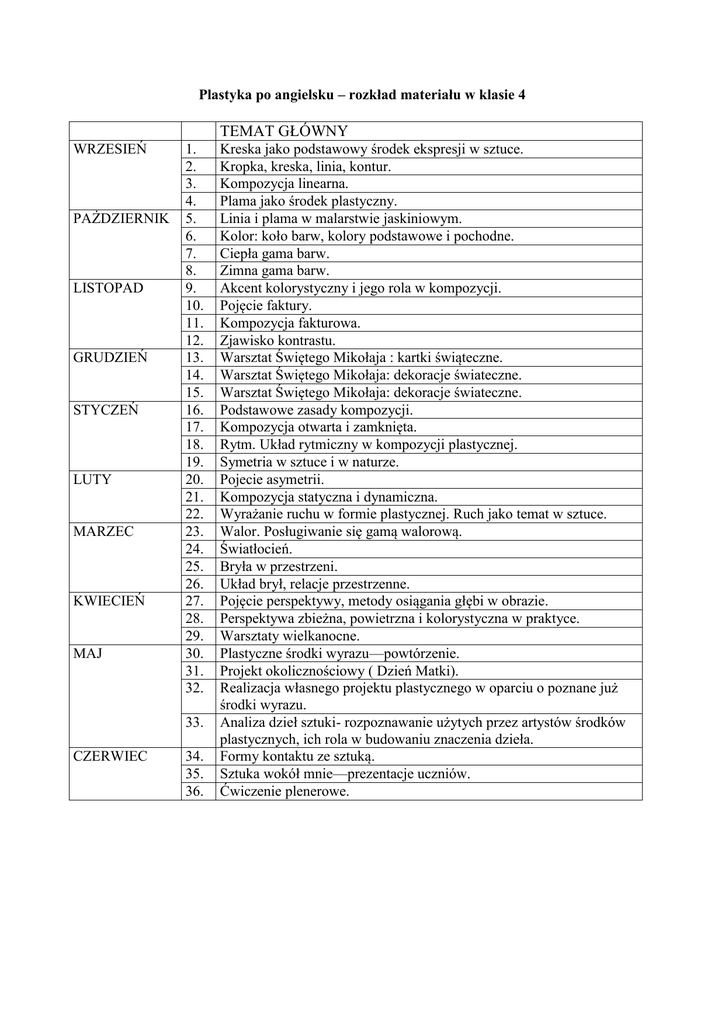 Plastyka po angielsku – rozkład materiału w klasie 4 TEMAT GŁÓWNY WRZESIEŃ PAŻDZIERNIK LISTOPAD GRUDZIEŃ STYCZEŃ LUTY MARZEC KWIECIEŃ MAJ 1. 2. 3. 4. 5. 6. 7. 8. 9. 10. 11. 12. 13. 14. 15. 16. 17. 18. 19. 20. 21. 22. 23. 24. 25. 26. 27. 28. 29. 30. 31. 32. 33. CZERWIEC 34. 35. 36. Kreska jako podstawowy środek ekspresji w sztuce. Kropka, kreska, linia, kontur. Kompozycja linearna. Plama jako środek plastyczny. Linia i plama w malarstwie jaskiniowym. Kolor: koło barw, kolory podstawowe i pochodne. Ciepła gama barw. Zimna gama barw. Akcent kolorystyczny i jego rola w kompozycji. Pojęcie faktury. Kompozycja fakturowa. Zjawisko kontrastu. Warsztat Świętego Mikołaja : kartki świąteczne. Warsztat Świętego Mikołaja: dekoracje świateczne. Warsztat Świętego Mikołaja: dekoracje świateczne. Podstawowe zasady kompozycji. Kompozycja otwarta i zamknięta. Rytm. Układ rytmiczny w kompozycji plastycznej. Symetria w sztuce i w naturze. Pojecie asymetrii. Kompozycja statyczna i dynamiczna. Wyrażanie ruchu w formie plastycznej. Ruch jako temat w sztuce. Walor. Posługiwanie się gamą walorową. Światłocień. Bryła w przestrzeni. Układ brył, relacje przestrzenne. Pojęcie perspektywy, metody osiągania głębi w obrazie. Perspektywa zbieżna, powietrzna i kolorystyczna w praktyce. Warsztaty wielkanocne. Plastyczne środki wyrazu—powtórzenie. Projekt okolicznościowy ( Dzień Matki). Realizacja własnego projektu plastycznego w oparciu o poznane już środki wyrazu. Analiza dzieł sztuki- rozpoznawanie użytych przez artystów środków plastycznych, ich rola w budowaniu znaczenia dzieła. Formy kontaktu ze sztuką. Sztuka wokół mnie—prezentacje uczniów. Ćwiczenie plenerowe.
