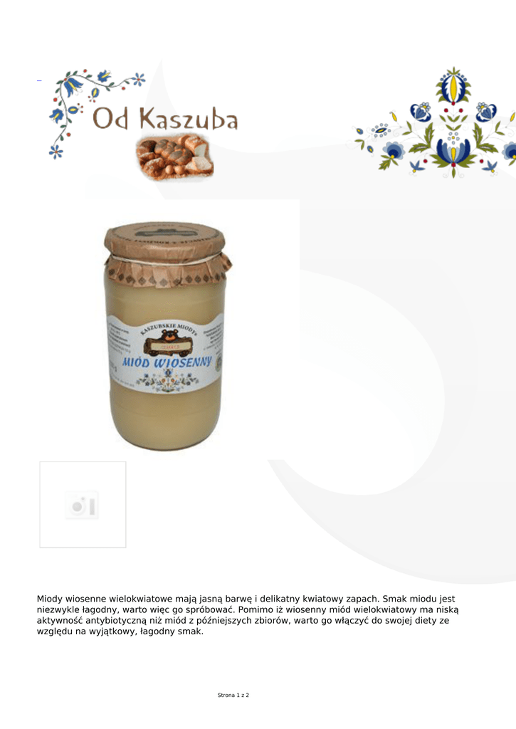 Miody wiosenne wielokwiatowe mają jasną barwę i delikatny kwiatowy zapach. Smak miodu jest niezwykle łagodny, warto więc go spróbować. Pomimo iż wiosenny miód wielokwiatowy ma niską aktywność antybiotyczną niż miód z późniejszych zbiorów, warto go włączyć do swojej diety ze względu na wyjątkowy, łagodny smak. Strona 1 z 2 Strona 2 z 2