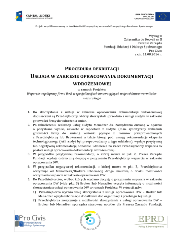 Projekt współfinansowany ze środków Unii Europejskiej w ramach Europejskiego Funduszu Społecznego Wyciąg z Załącznika do Decyzji nr 5 Prezesa Zarządu Fundacji Edukacji i Dialogu Społecznego Pro Civis z dn. 11.08.2014 r. PROCEDURA REKRUTACJI USŁUGA W ZAKRESIE OPRACOWANIA DOKUMENTACJI WDROŻENIOWEJ w ramach Projektu: Wsparcie współpracy firm i B+R w specjalizacjach innowacyjnych województwa warmińskomazurskiego 1. Do skorzystania z usługi w zakresie opracowania dokumentacji wdrożeniowej dopuszczeni są Przedsiębiorcy, którzy skorzystali uprzednio z usługi audytu w zakresie gotowości firmy do wdrożenia zmian. 2. Po zakończeniu realizacji usług audytu Menadżer ds. Zarządzania Zmianą w oparciu o pozyskane wyniki, zawarte w raportach z audytu (m.in. syntetyczny wskaźnik gotowości firmy do zmian), wnioski płynące z rozmów przeprowadzonych z Przedsiębiorcą lub Brokerami, a także biorąc pod uwagę rekomendacje eksperta technologicznego (jeśli audyt był przeprowadzany z jego udziałem), wydaje pozytywną lub negatywną rekomendację odnośnie udzielenia na rzecz Przedsiębiorcy wsparcia w postaci usługi opracowania dokumentacji wdrożeniowej. 3. W przypadku pozytywnej rekomendacji, o której mowa w pkt. 2, Prezes Zarządu Fundacji wydaje ostateczną decyzję o przyznaniu Przedsiębiorcy wsparcia w zakresie opracowania DW. 4. W przypadku negatywnej rekomendacji, o której mowa w pkt. 2, Przedsiębiorca otrzymuje od Menadżera/Brokera informację droga mailową o braku możliwości otrzymania wsparcia w zakresie opracowania DW. 5. Do Przedsiębiorców, wobec których wydano decyzję o przyznaniu wsparcia w zakresie opracowania DW (vide pkt. 3) Broker lub Menadżer wysyła informację o możliwości skorzystania z usługi opracowania DW w ramach Projektu. W sytuacji, gdy: 1) Przedsiębiorca wyraża wolę skorzystania z usługi opracowania DW – Broker lub Menadżer wysyła informacje dodatkowe dot. organizacji i przebiegu tej usługi. 2) Przedsiębiorca zrezygnuje z możliwości skorzystania z usługi opracowania DW – Broker lub Menadżer sporządza stosowną notatkę dla Prezesa Zarządu Fundacji, Projekt współfinansowany ze środków Unii Europejskiej w ramach Europejskiego Funduszu Społecznego który podejmuje decyzję o zaproponowaniu usługi opracowania DW innemu Przedsiębiorcy, którzy uprzednio skorzystał z usługi audytu, o której mowa w pkt. 1. 6. Do Przedsiębiorcy, który podtrzymał wolę skorzystania z usługi opracowania DW (pkt. 5.1), Menadżer/Broker wysyła droga elektroniczną „Umowę na wykonanie usługi opracowania DW” wraz z dokumentami towarzyszącymi. Menadżer/Broker udziela Przedsiębiorcy niezbędnych konsultacji mających na celu prawidłowe wypełnienie przez Przedsiębiorcę otrzymanej dokumentacji. Przedsiębiorca przekazuje oryginały poprawnie wypełnionych i podpisanych dokumentów Menadżerowi/Brokerowi podczas wizyty rozpoczynającej realizację usługi opracowania DW. Warunki skorzystania z usługi opracowania DW Z usługi opracowania DW może skorzystać Przedsiębiorca, którzy spełnia łącznie następujące warunki: 1. prowadzi działalność w ramach przynajmniej jednego z trzech obszarów inteligentnych specjalizacji dla Warmii i Mazur, co weryfikowane jest na podstawie danych zwartych w „Formularzu oceny firmy”, 2. był beneficjentem wsparcia w ramach Projektu w zakresie usługi audytu, 3. otrzymał pozytywną decyzję Prezesa Zarządu Fundacji zgodnie z dyspozycją z pkt. 3, 4. należy do sektora mikro, małych i średnich przedsiębiorców w rozumieniu Załącznika nr 1 do rozporządzenia Komisji (WE) nr 800/2008 z dnia 6 sierpnia 2008 r. uznającego niektóre rodzaje pomocy za zgodne ze wspólnym rynkiem w zastosowaniu art. 87 i 88 Traktatu (ogólne rozporządzenie w sprawie wyłączeń blokowych; Tekst mający znaczenie dla EOG) (Dz. U. L 214 z 09.08.2008, s. 3), 5. ma siedzibę lub przedstawicielstwo na terenie województwa warmińsko-mazurskiego, 6. nie ciąży na nim obowiązek zwrotu pomocy w rozumieniu art. 25 pkt. 1 ustawy z dnia 30 kwietnia 2004 r. o postępowaniu w sprawach dotyczących pomocy publicznej (t.j. Dz. U. 2007 Nr 59, poz. 404 ze zm.), 7. nie znajduje się w okresie restrukturyzacji przeprowadzanej z wykorzystaniem pomocy publicznej, 8. może skorzystać z pomocy de minimis i oświadcza, że wartość pomocy de minimis udzielonej w związku z udziałem w Projekcie łącznie z wartością pomocy udzielonej w bieżącym roku podatkowym oraz w dwóch poprzedzających go latach podatkowych nie przekracza równowartości 200 tys. Euro.