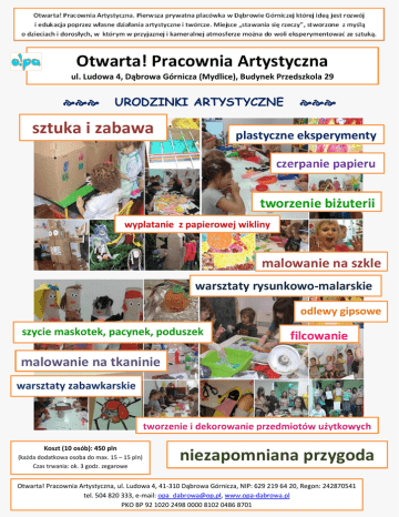 Otwarta! Pracownia Artystyczna ul. Ludowa 4, Dąbrowa Górnicza (Mydlice), Budynek Przedszkola 29 URODZINKI ARTYSTYCZNE sztuka i zabawa plastyczne eksperymenty czerpanie papieru tworzenie biżuterii wyplatanie z papierowej wikliny malowanie na szkle warsztaty rysunkowo-malarskie odlewy gipsowe szycie maskotek, pacynek, poduszek filcowanie malowanie na tkaninie warsztaty zabawkarskie Koszt (10 osób): 450 pln (każda dodatkowa osoba do max. 15 – 15 pln) Czas trwania: ok. 3 godz. zegarowe tworzenie i dekorowanie przedmiotów użytkowych (decoupage) niezapomniana przygoda Otwarta! Pracownia Artystyczna, ul. Ludowa 4, 41-310 Dąbrowa Górnicza, NIP: 629 219 64 20, Regon: 242870541 tel. 504 820 333, e-mail: [email protected], www.opa-dabrowa.pl PKO BP 92 1020 2498 0000 8102 0486 8701